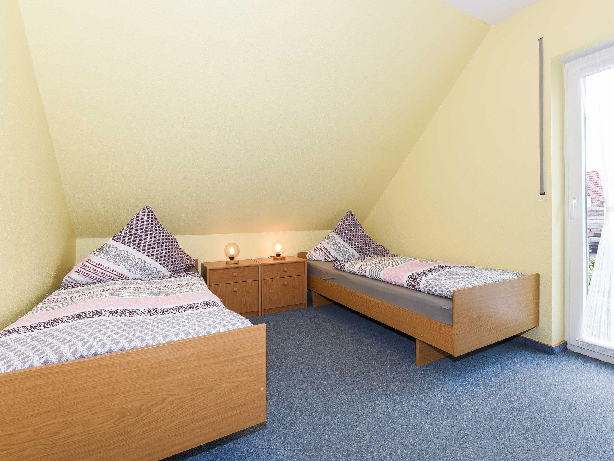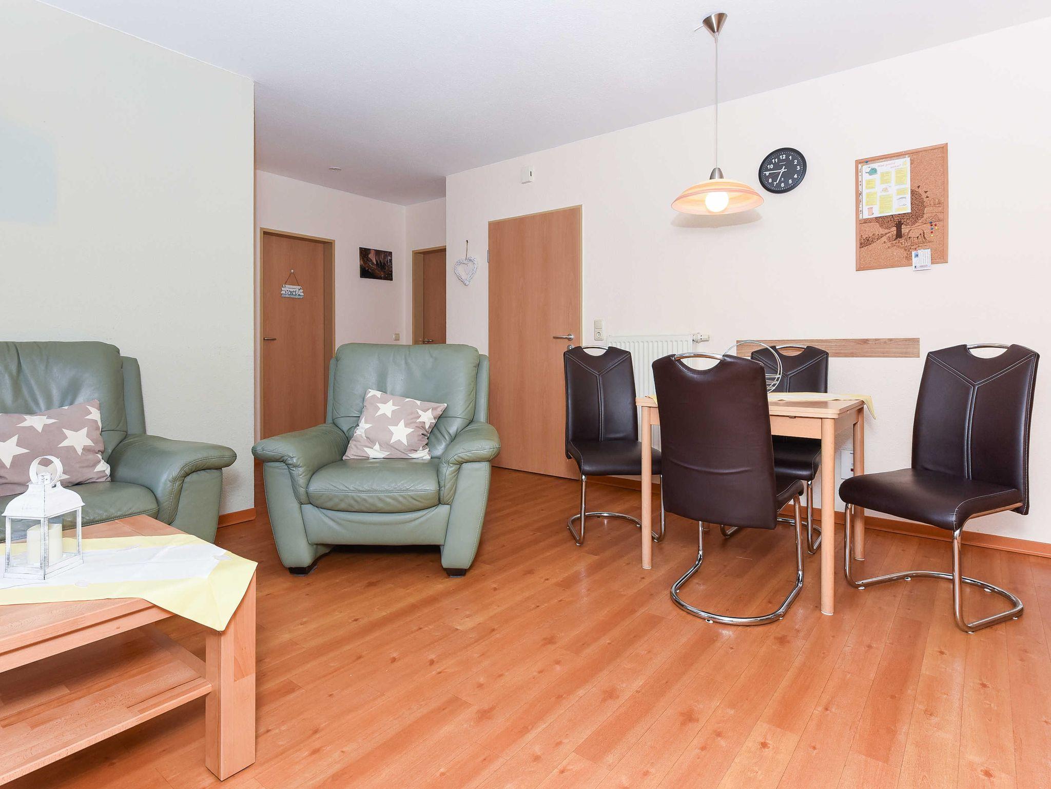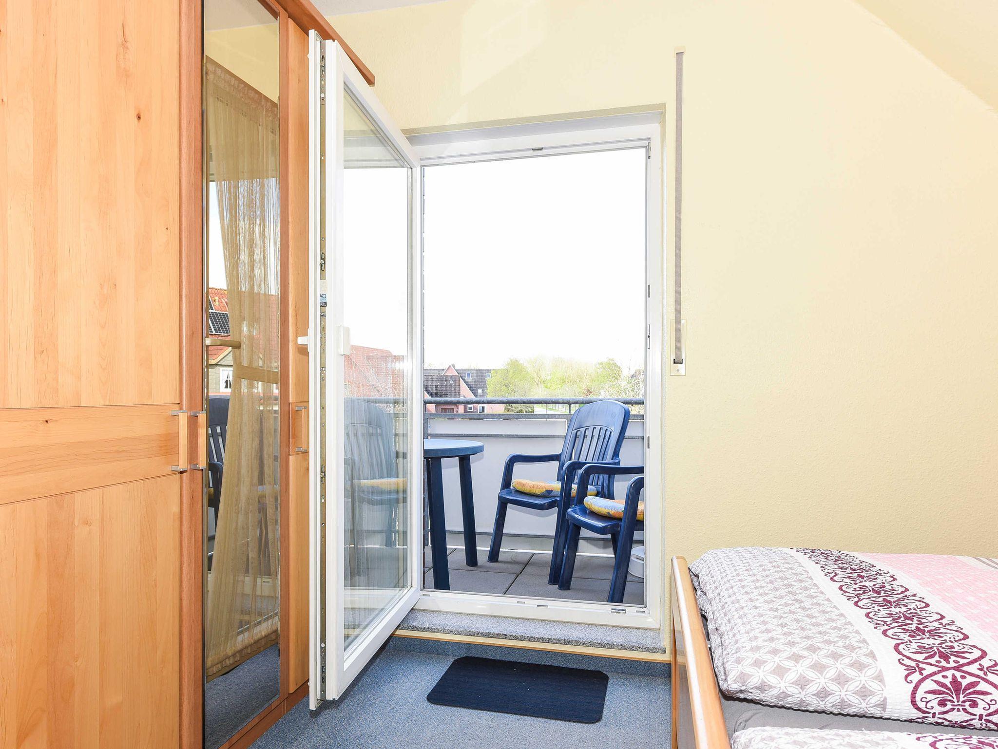 Größe ca. 65 Quadratmeter, Wohnraum mit integrierter Küche, Schlafzimmer, zweites, separates Schlafzimmer, Badezimmer mit Dusche, Waschtisch und WC, Obergeschoss, Balkon, Internetzugang über WLAN möglich, optimal für 2 bis 4 Personen.