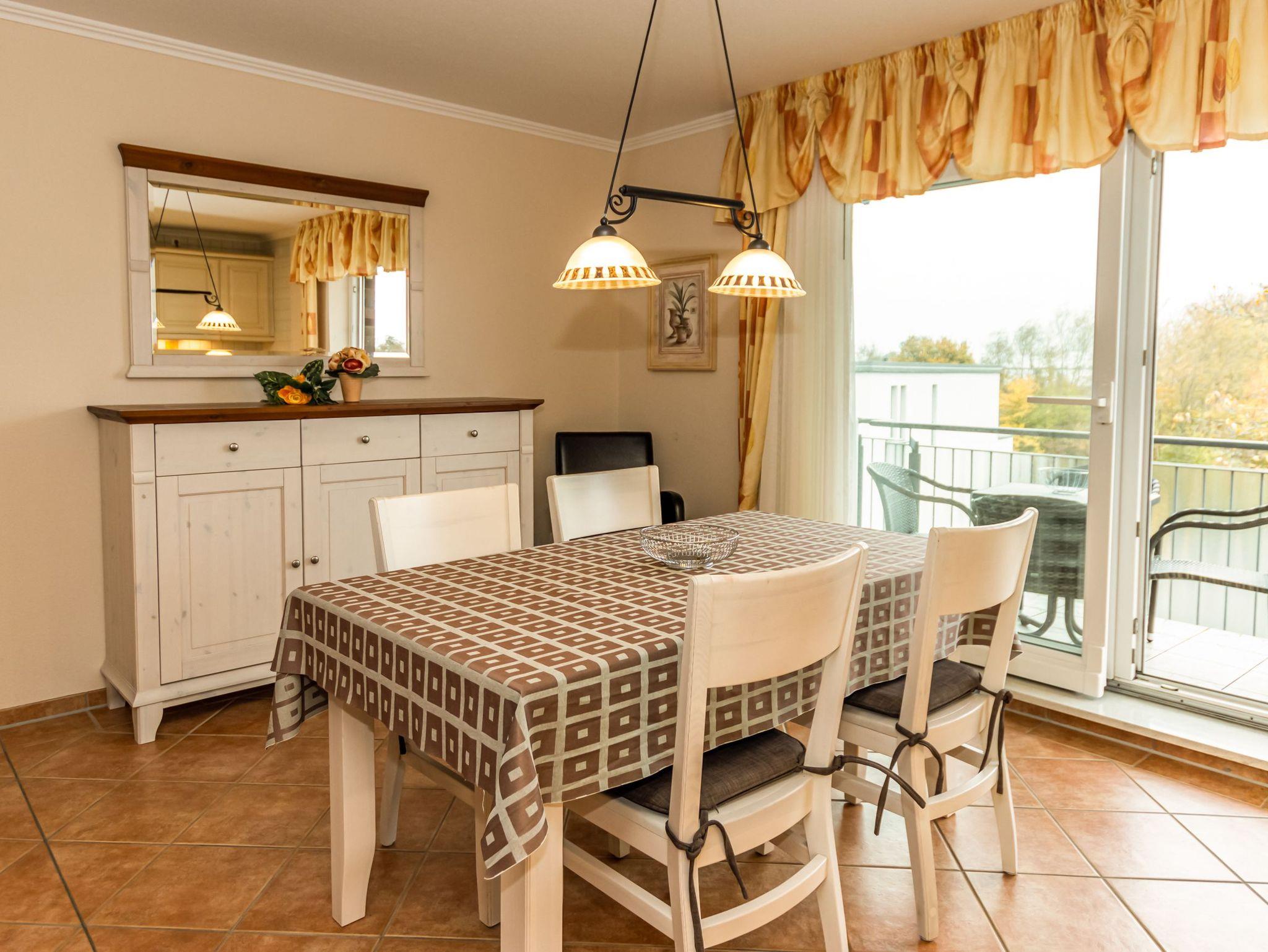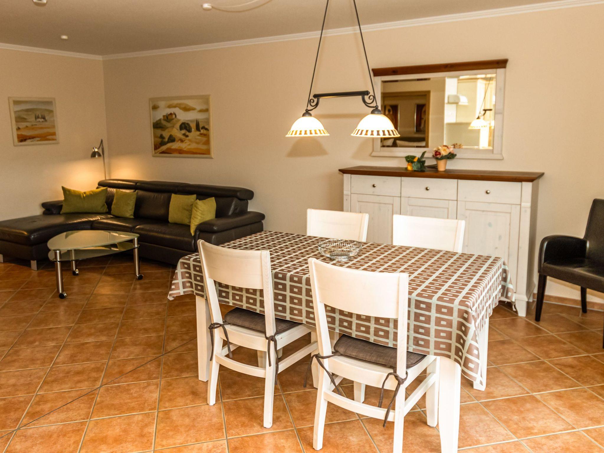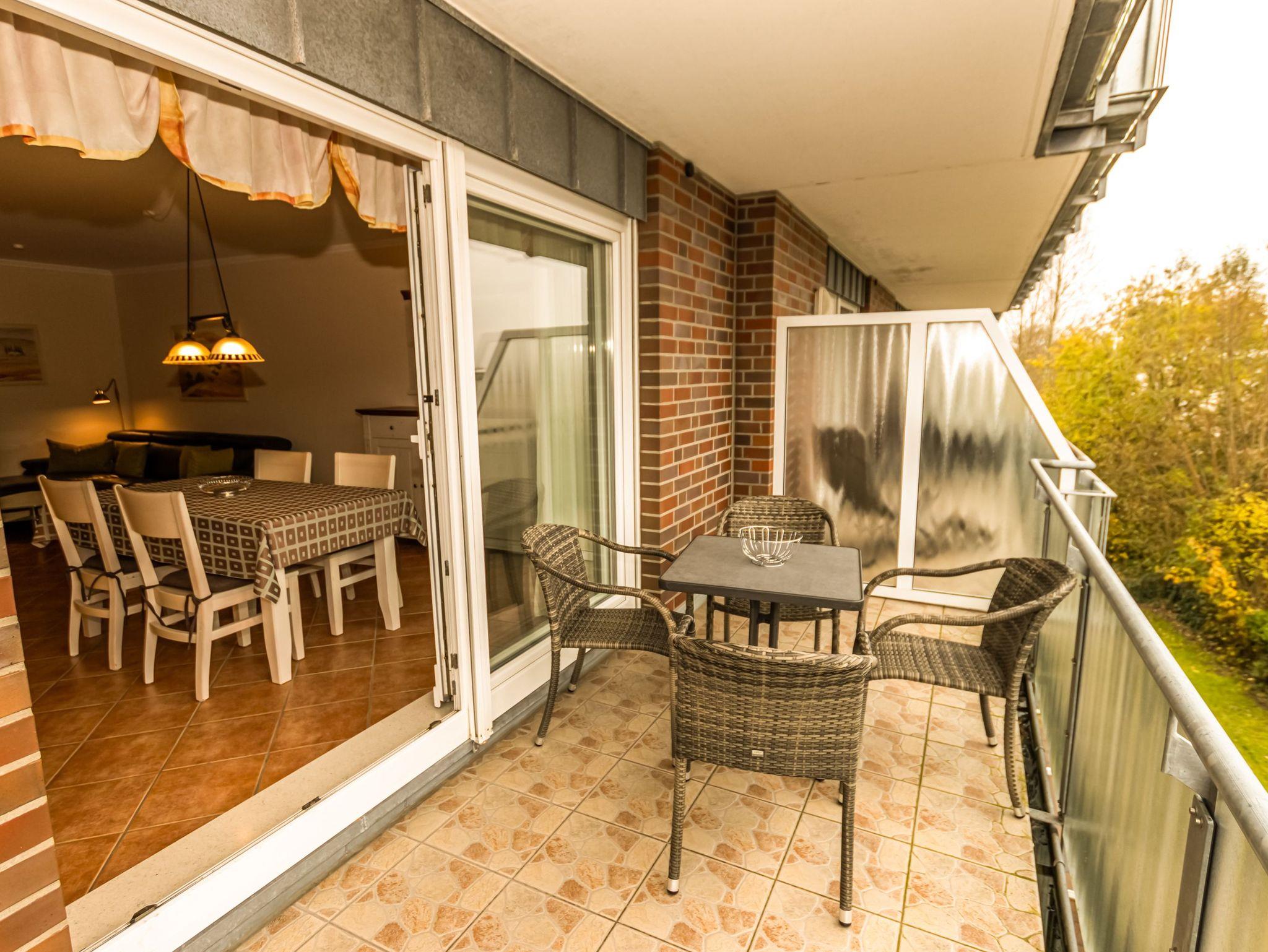 Moderne Ferienwohnung Pamir im Nordseegartenpark Bensersiel, nahe Nordsee und Hafen, mit Balkon und Tiefgarage.