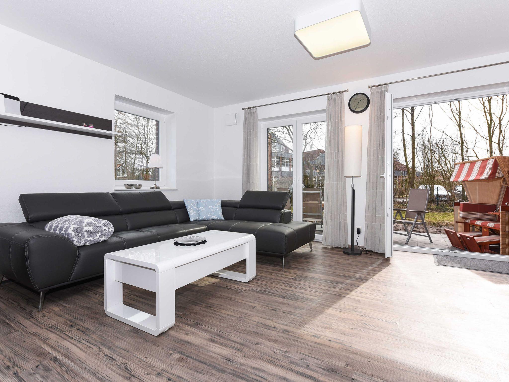 Modernes Ferienhaus Weiße Muschel in Bensersiel nahe Nordseetherme, ideal für erholsamen Nordsee-Urlaub mit Komfort und Terrasse.