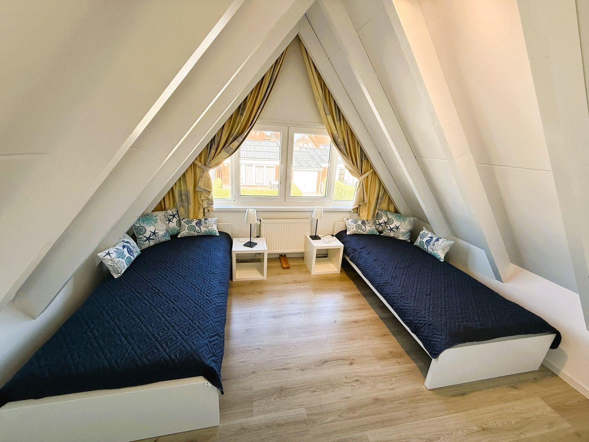 2. Schlafzimmer (Dachgeschoss) mit 2 feststehenden Einzelbetten und Einbau-Kleiderschränken. Auch dieses Zimmer bietet viel Platz.