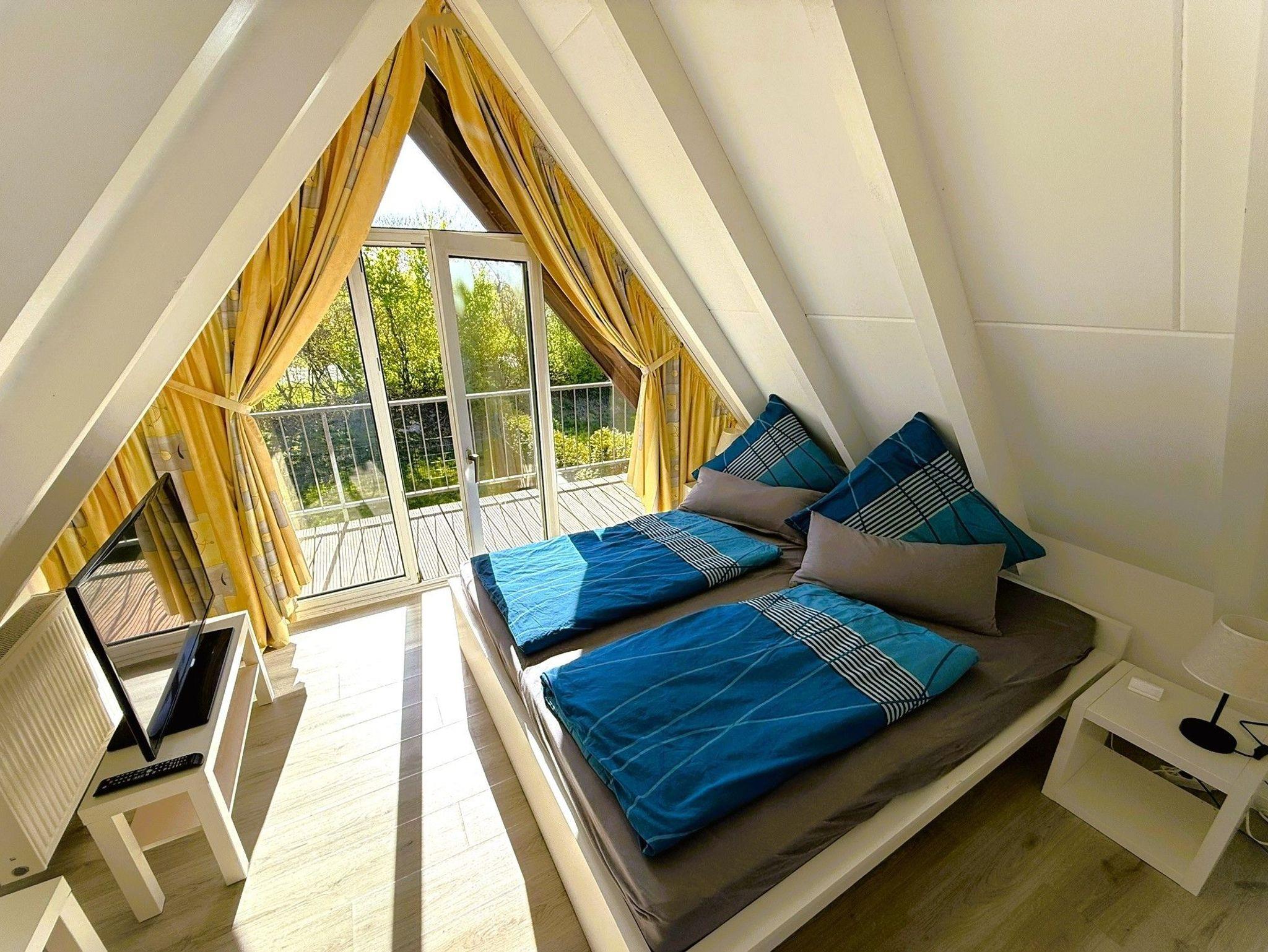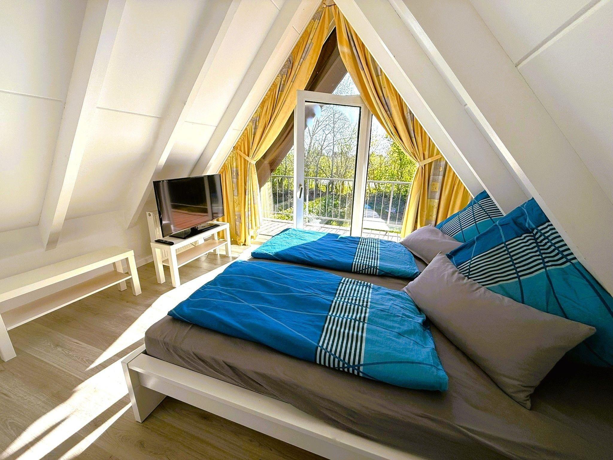 1. Schlafzimmer (Dachgeschoss): ein großzügig geschnittener Raum mit einem Doppelbett und Einbau-Kleiderschränken. Das besondere ist die Loggia mit Blick ins Grüne.