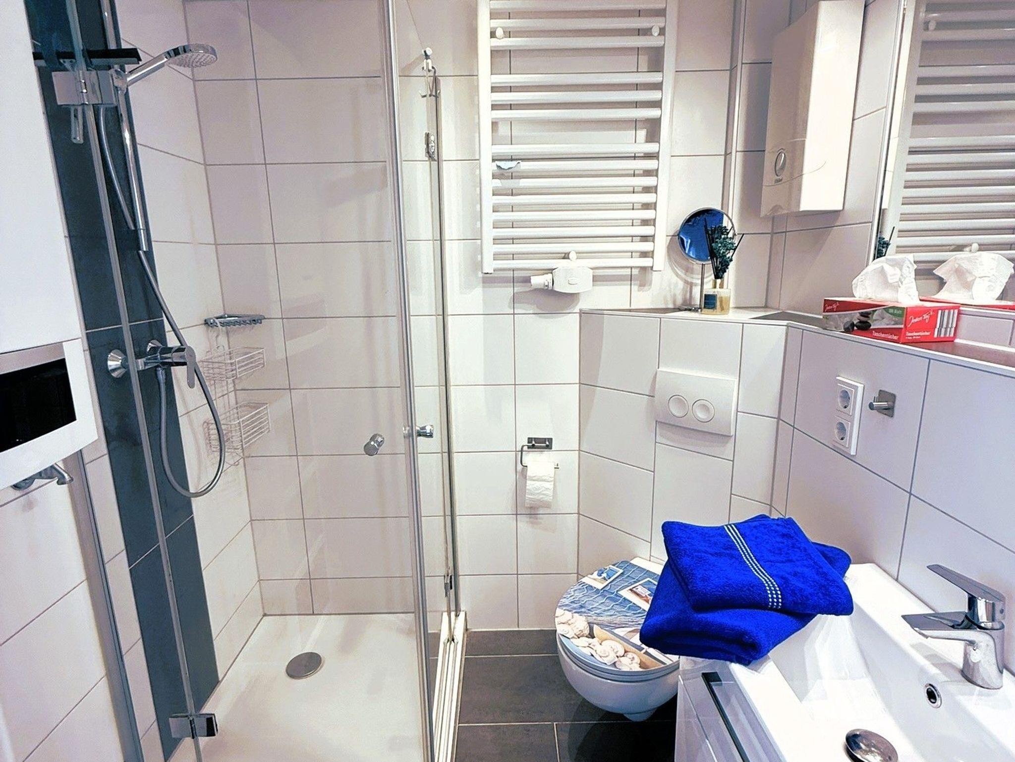 Das Badezimmer ist hell gefliest. Dusche, Waschtisch, WC und genügend Stauraum im Schrank und Regal. (Fön, Handspiegel, Badhocker).