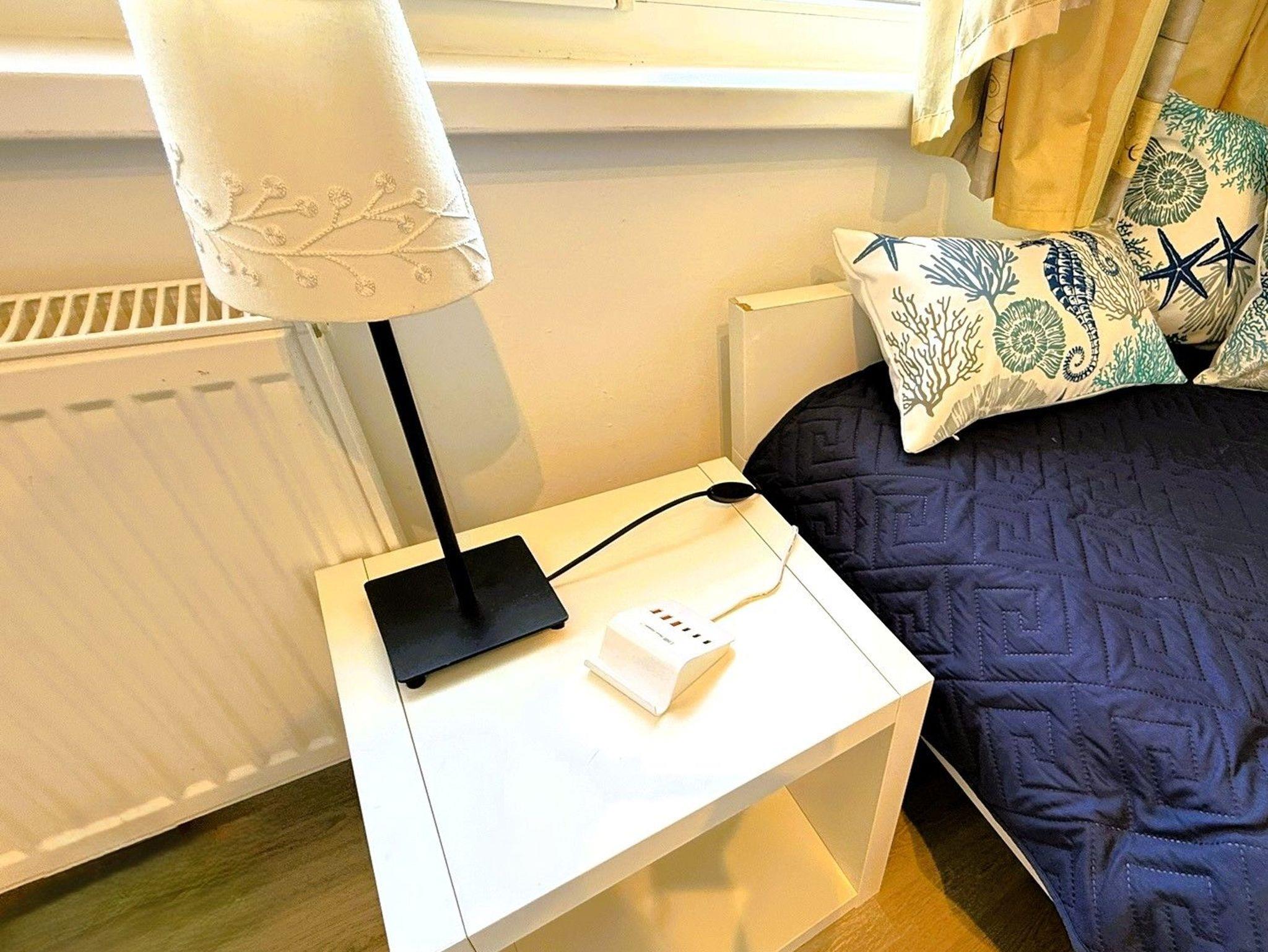 Alle 6 Betten haben jeweils einen Nachttisch mit passender Lampe und USB-Ladestationen.