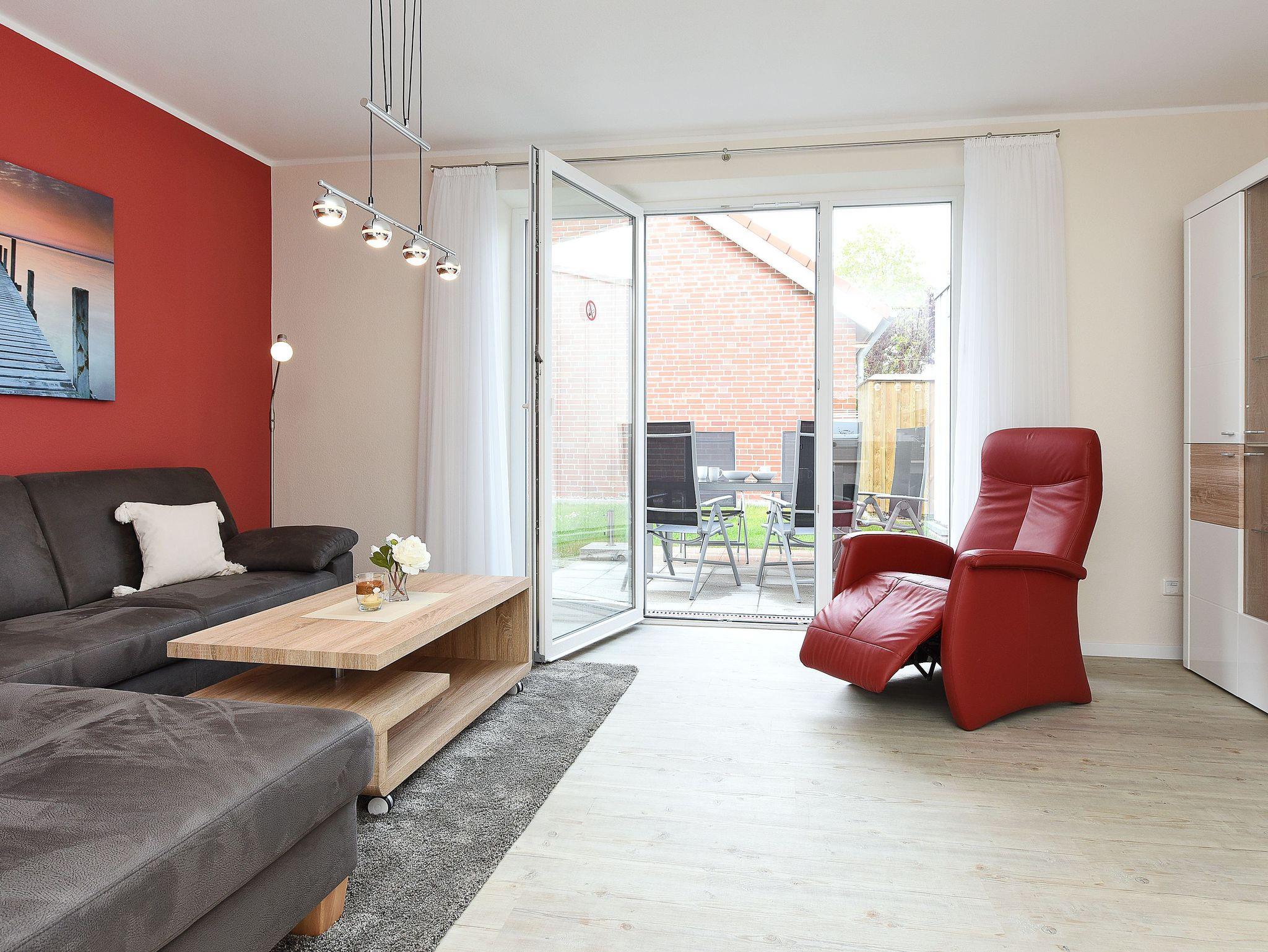 Modernes Ferienhaus Antares in Bensersiel, 200 m vom Deich und nahe UNESCO-Wattenmeer gelegen, ideal für Familien und Naturfreunde.