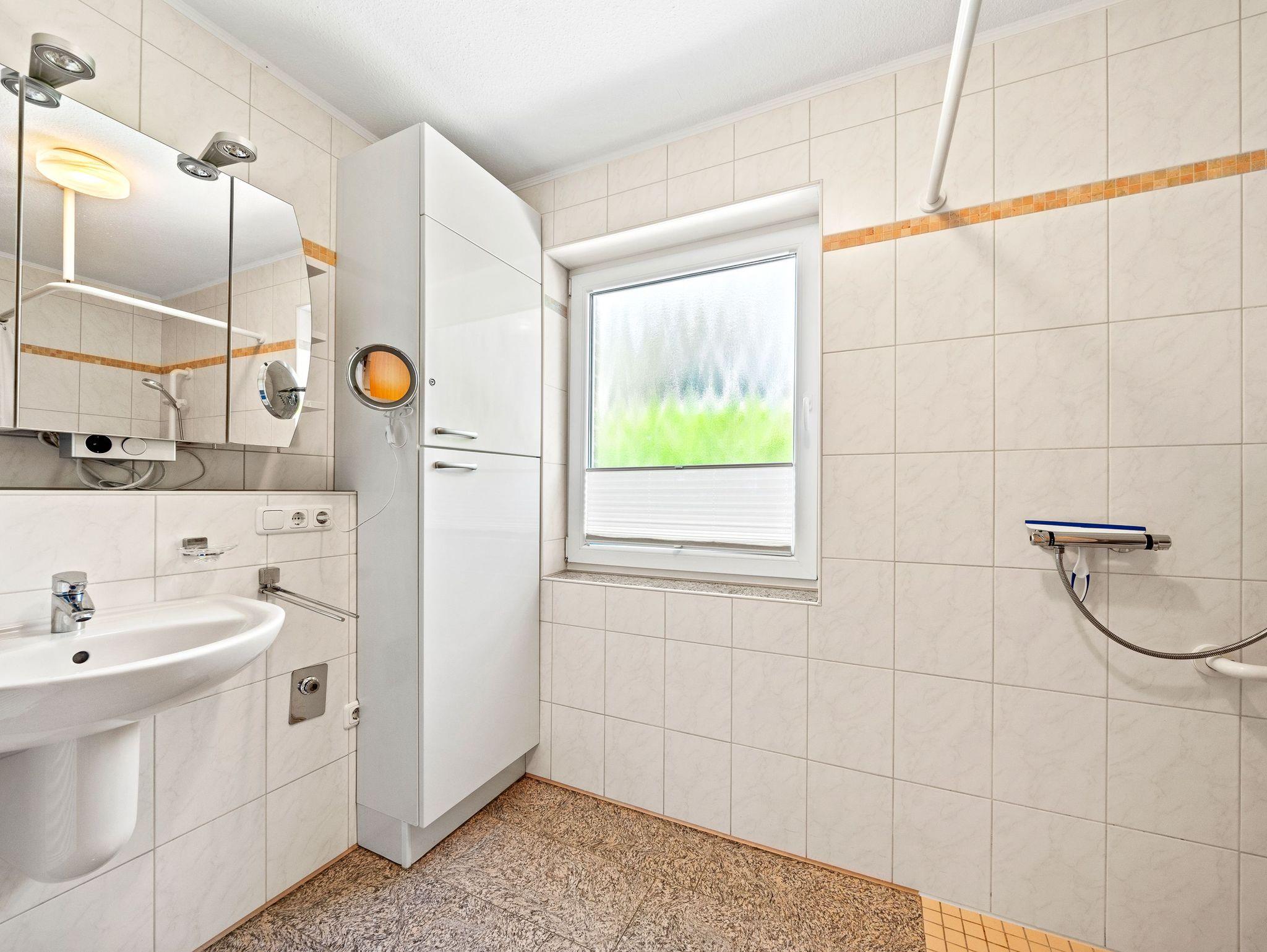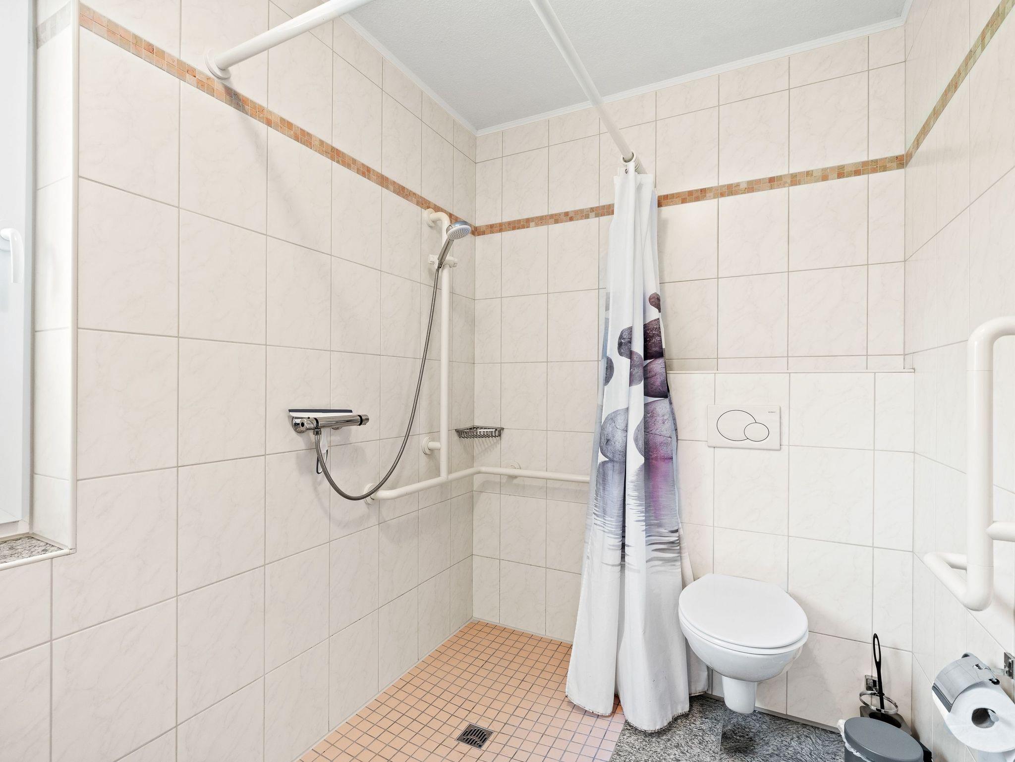 - Badezimmer mit ebenerdiger Dusche, Waschtisch und WC