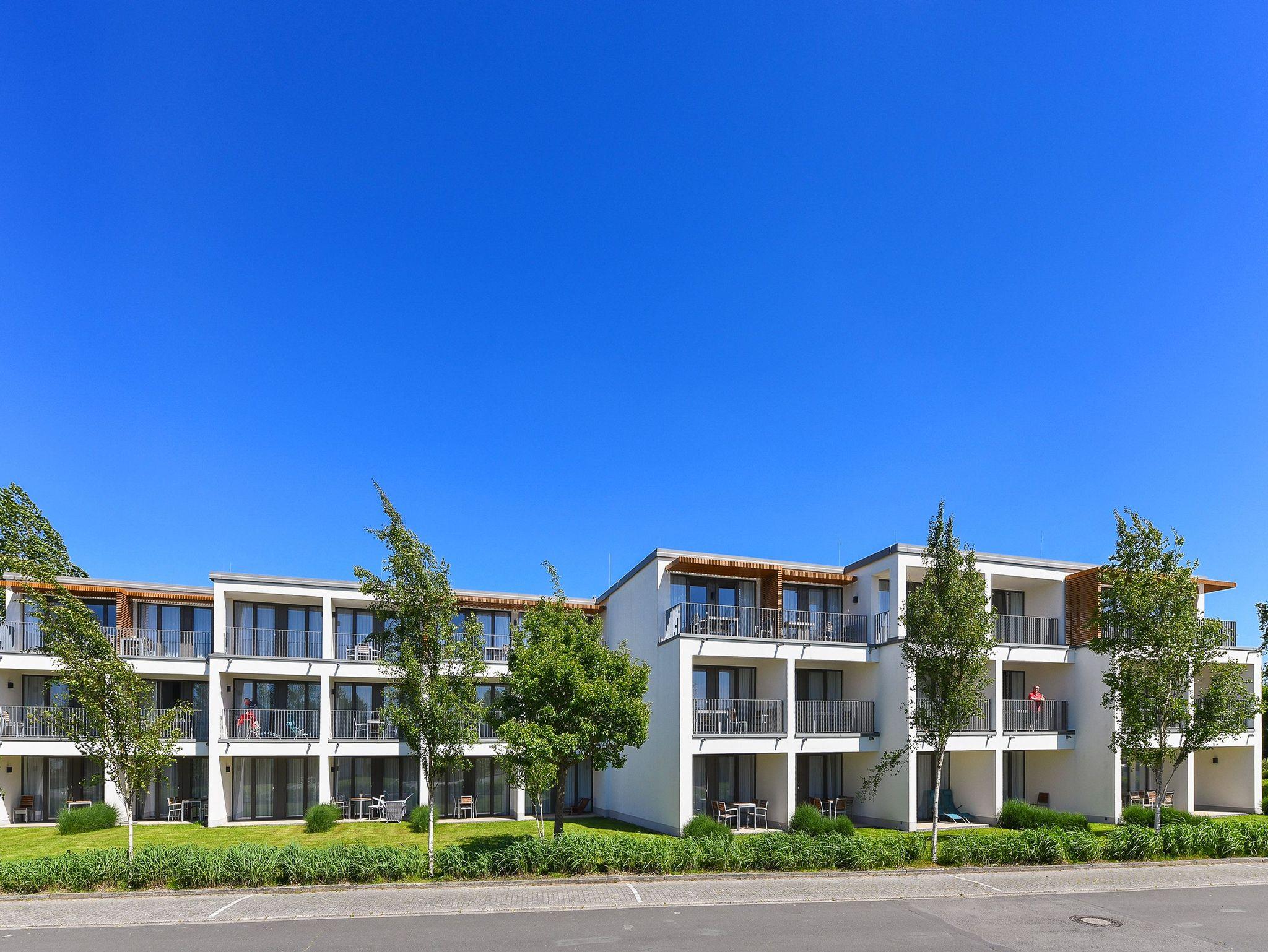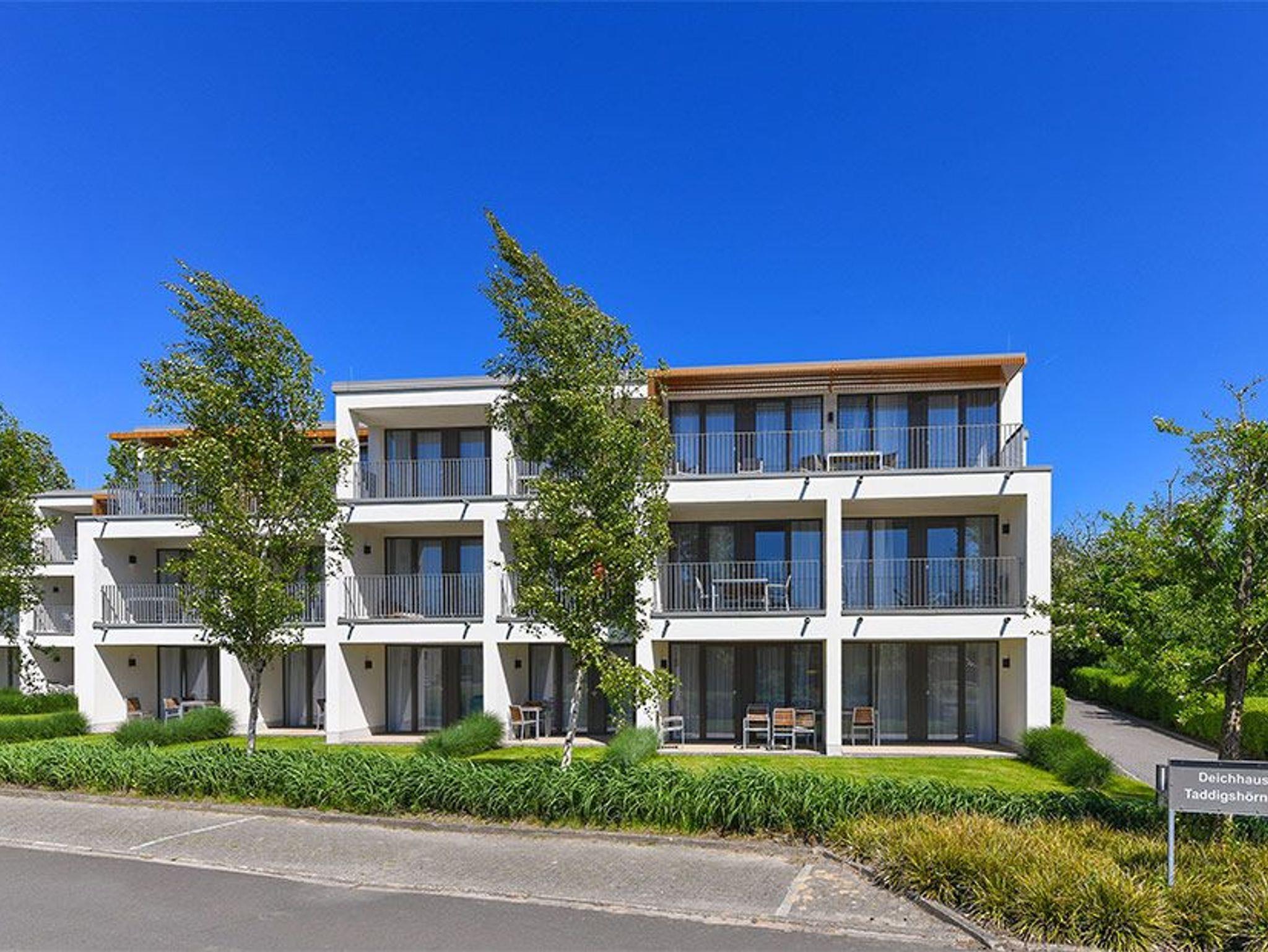 Die 61 m² große moderne 3-Zimmer Ferienwohnung ist für bis zu 5 Personen geeignet. Besonders hervorzuheben sind die zwei großzügigen und überdachten Terrassen in sonniger West-Lage mit eigener Grünfläche. Hier lässt sich den ganzen Tag das wohltuende Meeresklima des Nordseeheilbades genießen.