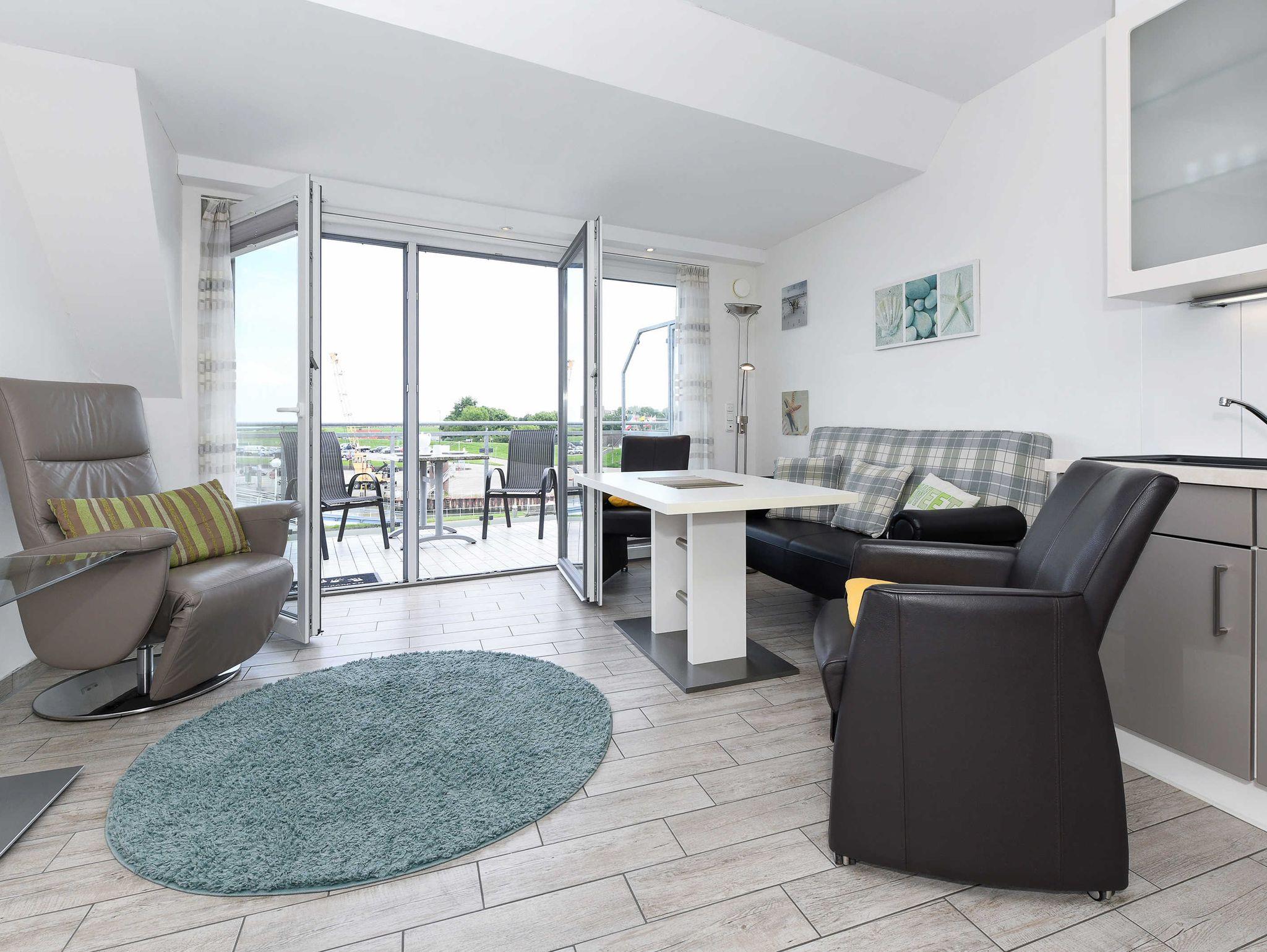 Die Residenz Hafenidyll in Bensersiel bietet moderne Ferienwohnungen mit traumhaftem Blick auf Nordsee und Hafen.