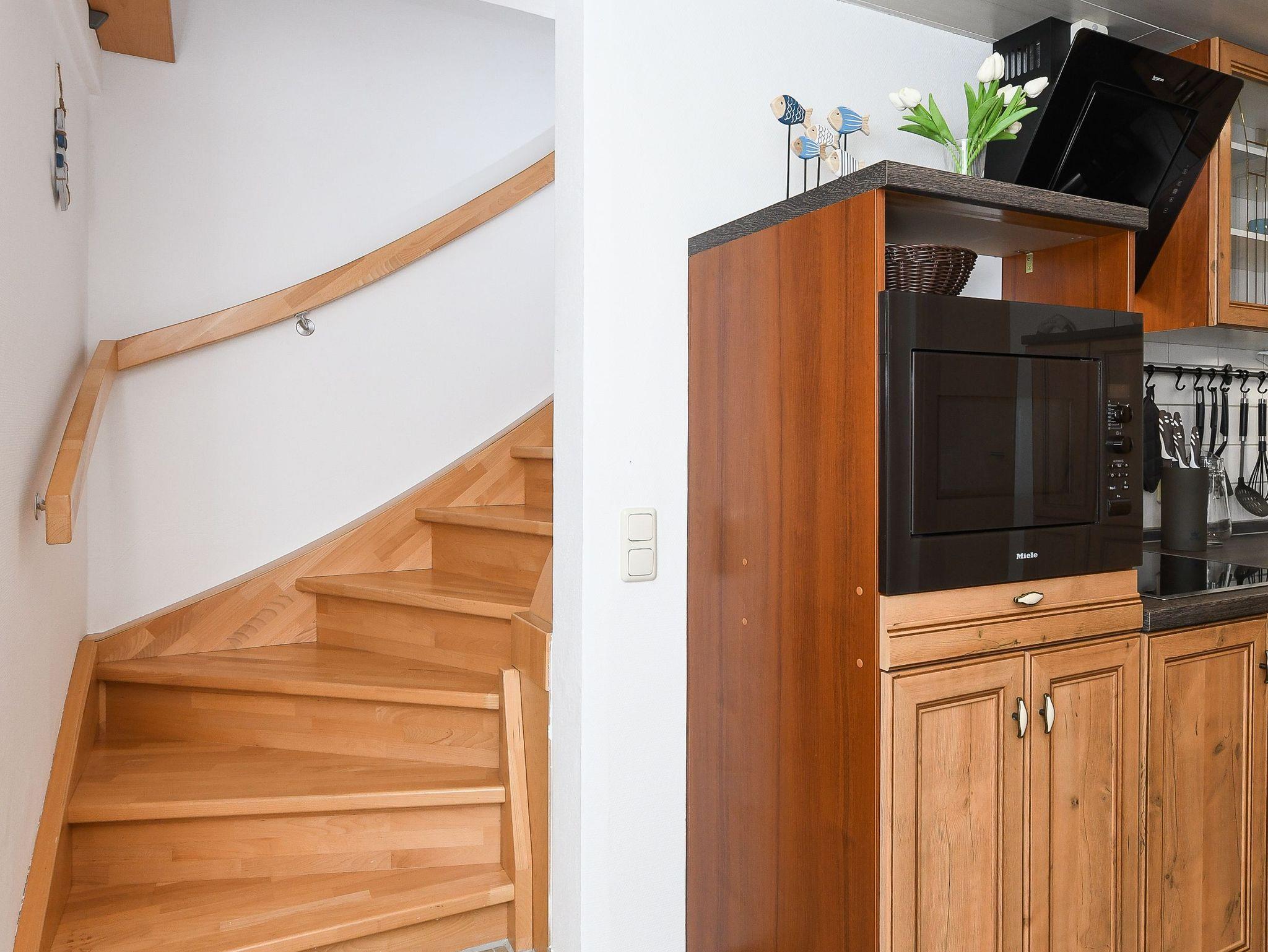 Die Küche und das Badezimmer befinden sich im Erdgeschoss. Das Wohnzimmer und das Schlafzimmer befinden sich im Obergeschoss.
