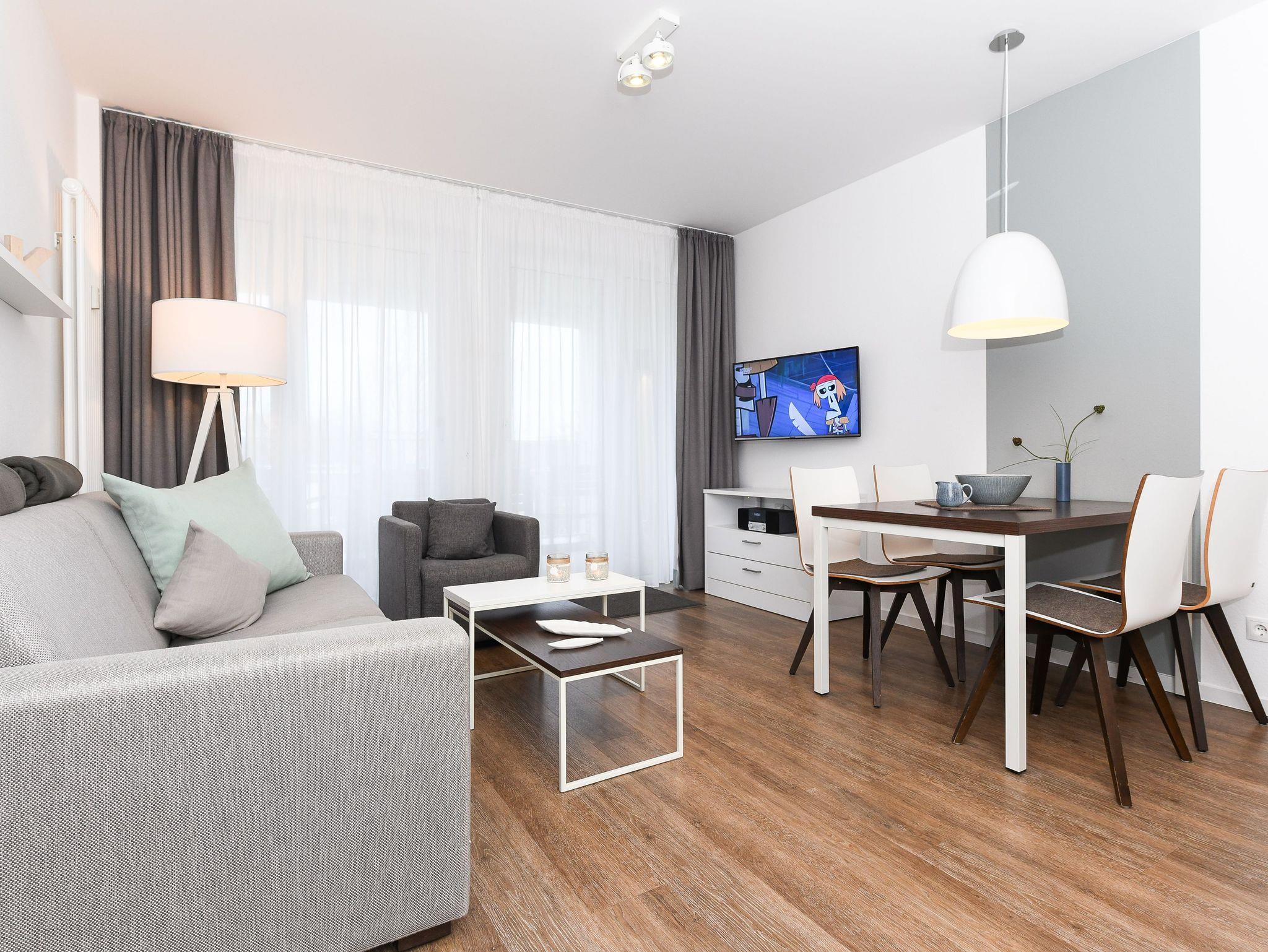 Die 61 m² große moderne 3-Zimmer Ferienwohnung ist für bis zu 5 Personen geeignet. Besonders hervorzuheben sind die beiden überdachten Balkone, ähnlich einer Loggia, in sonniger West-Lage. Hier lässt es sich den ganzen Tag über herrlich entspannen.