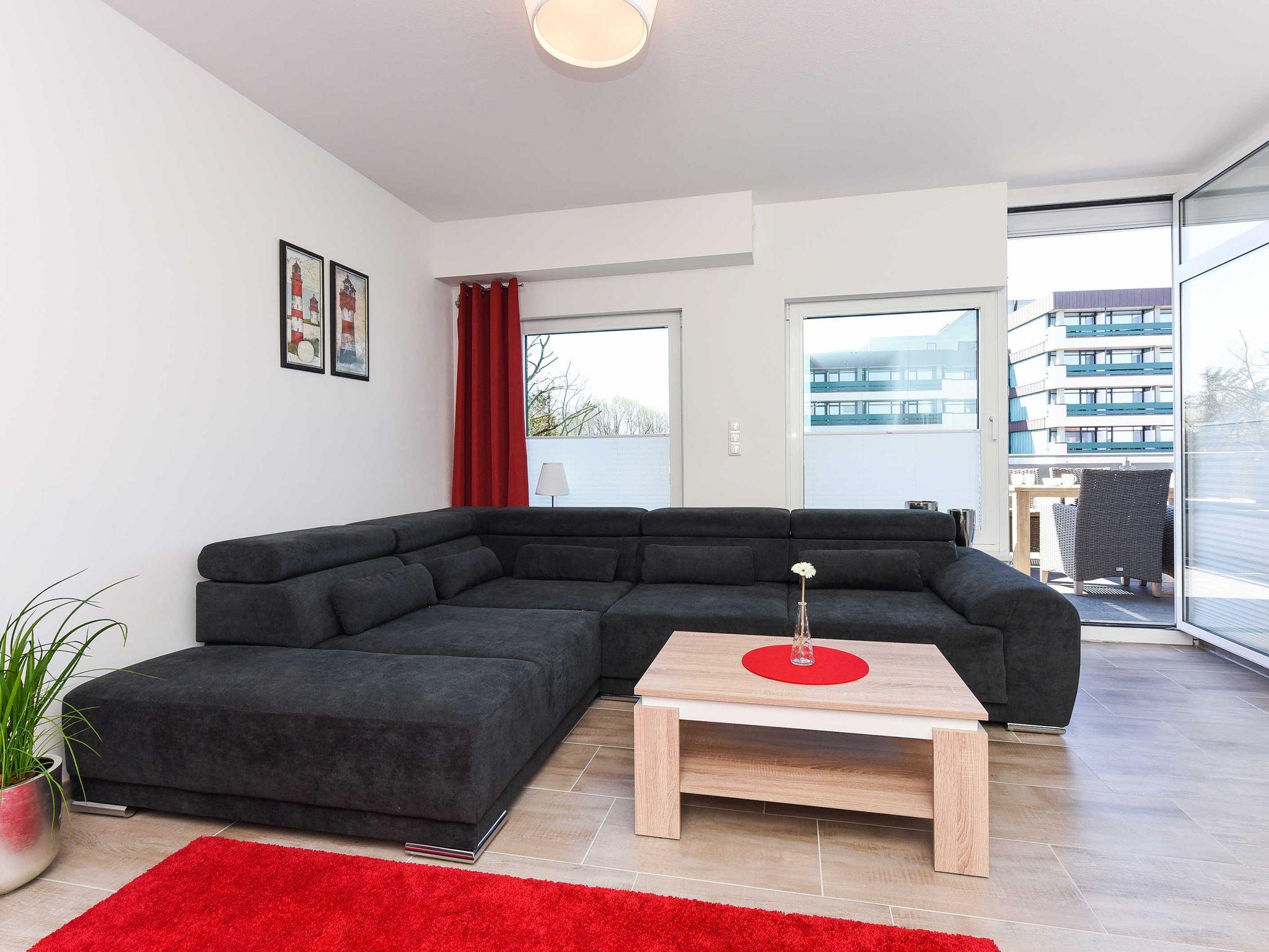 Moderne Ferienwohnung im Nordseegartenpark Bensersiel mit Balkon und Blick auf Hafen und Nordsee.