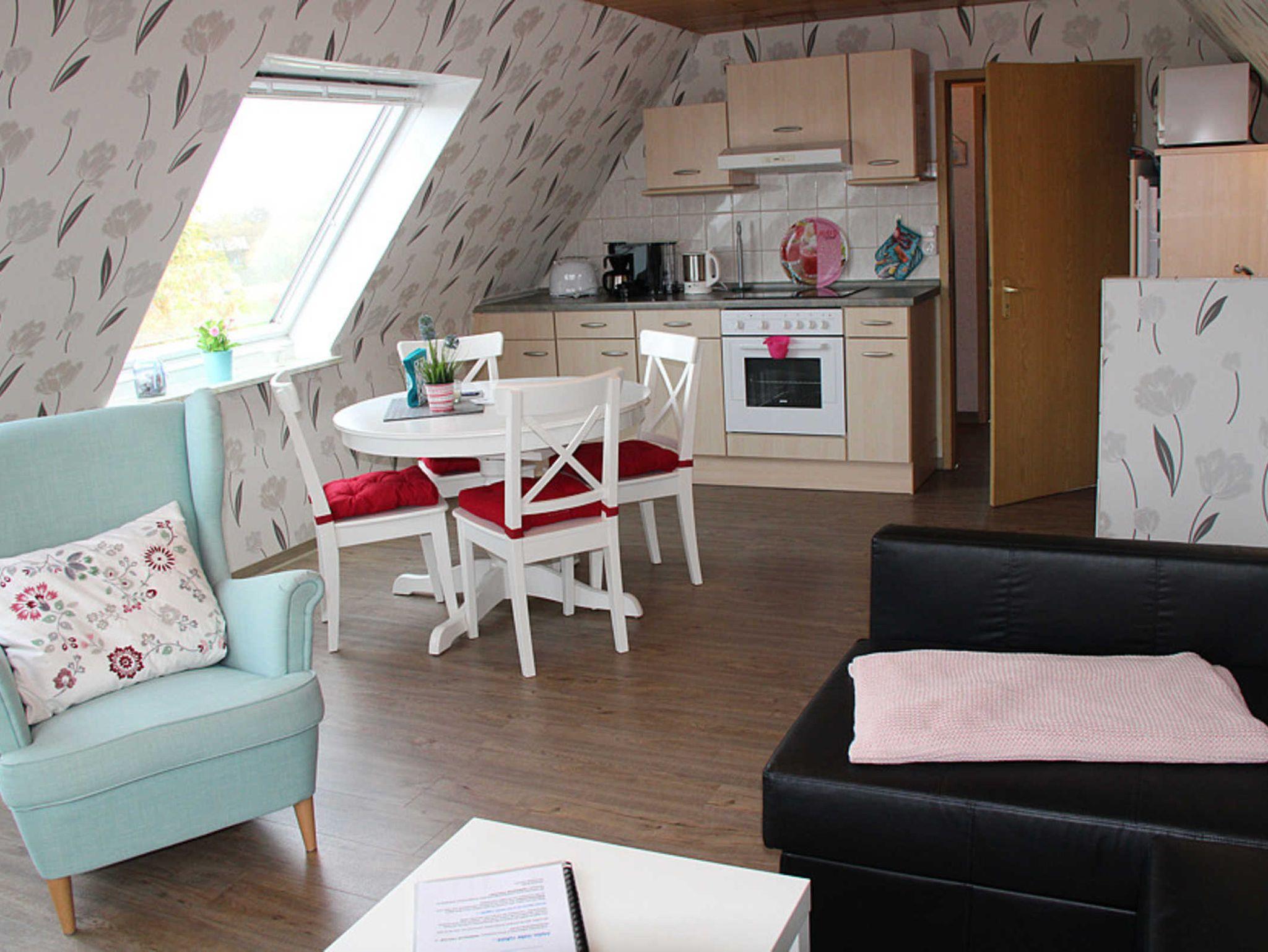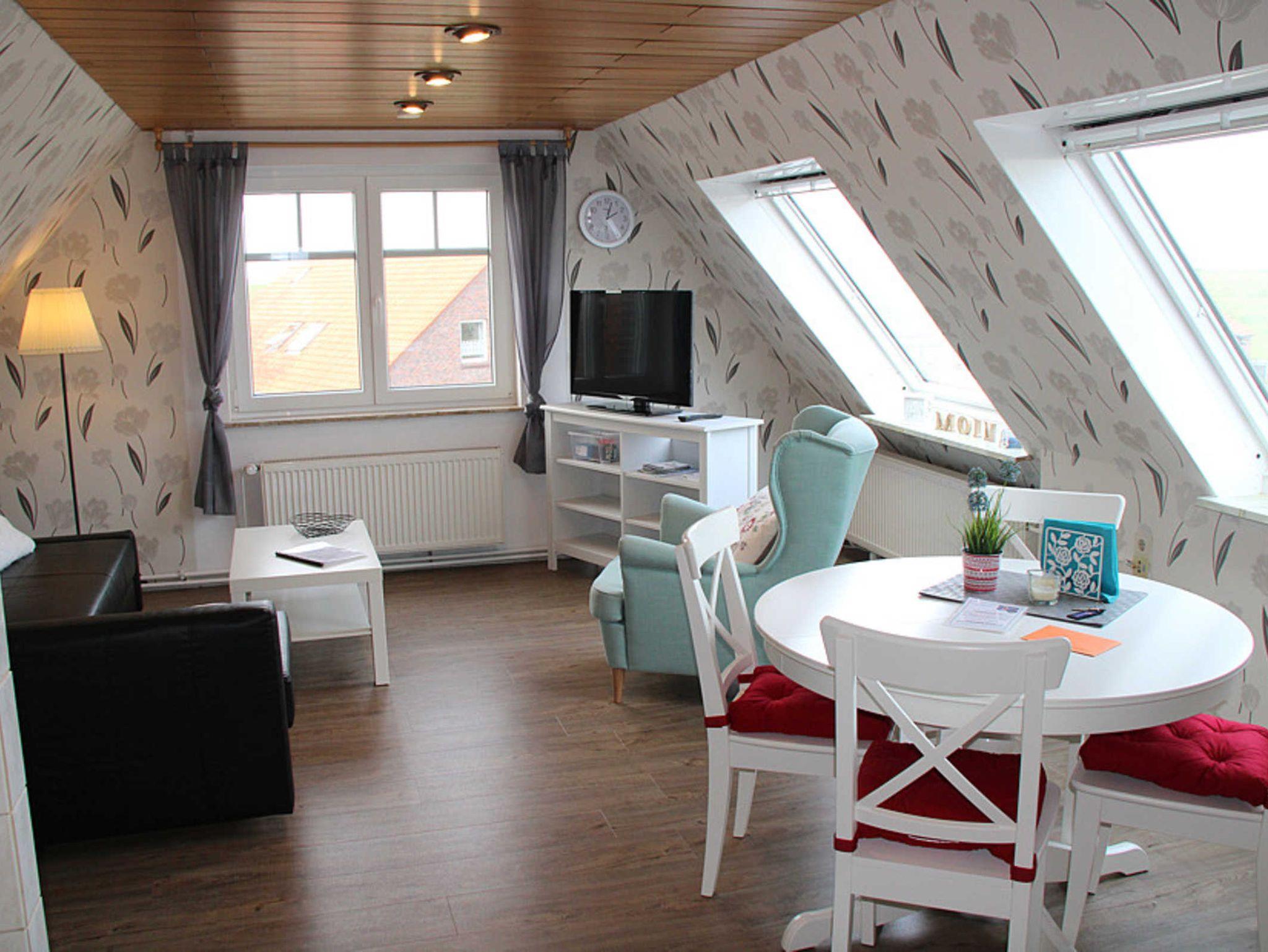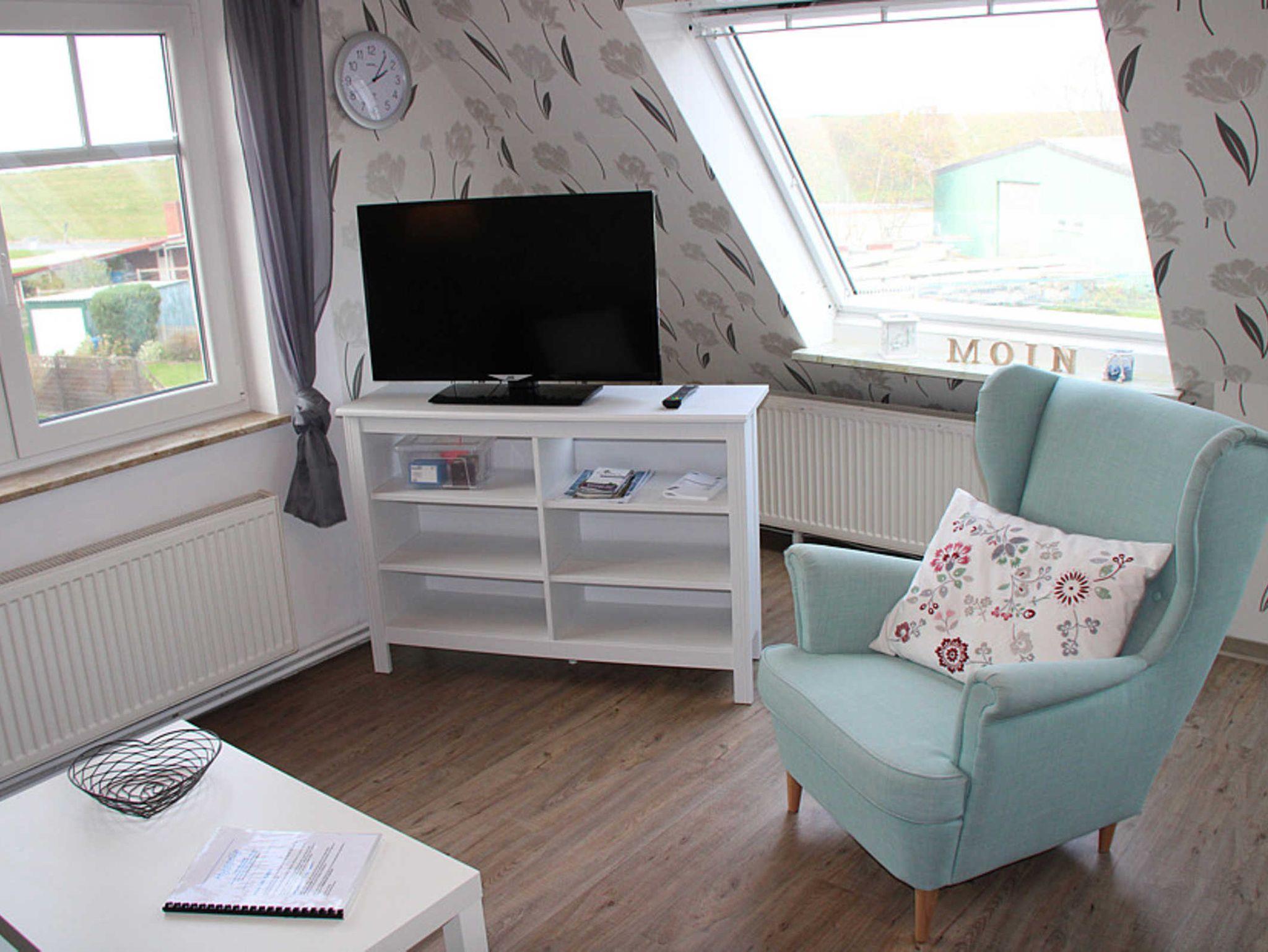 Die fünfte Wohnung heißt „Island“ und ist ganz oben im Haus untergebracht, so dass ein Blick über den Deich auf die Nordsee und die vorgelagerten Inseln möglich ist. Diese Wohnung „Island“, geeignet für 1 bis 2 Personen nebst zusätzlichem Kleinkind, verfügt über einen Wohnraum mit integrierter vollständiger Küche, ein Schlafzimmer sowie ein Badezimmer mit Dusche, Waschtisch und WC.