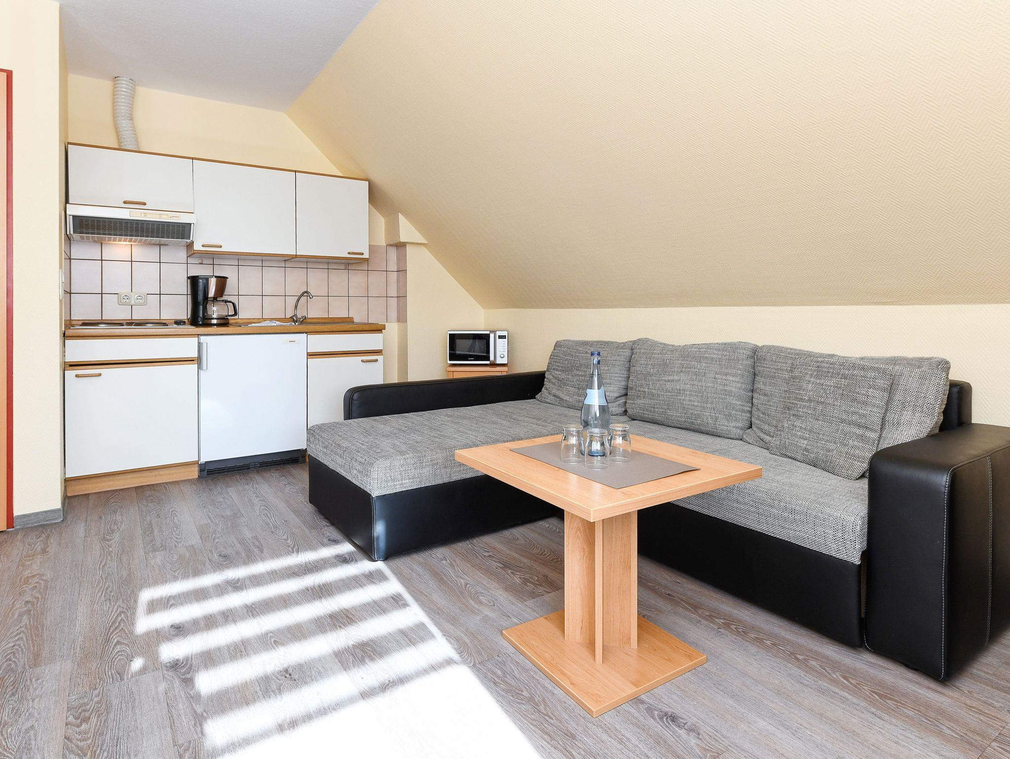 Größe ca. 38 Quadratmeter, Wohnzimmer mit integrierter Küche, Schlafzimmer, Badezimmer mit Dusche, Waschtisch und WC, 2. Obergeschoss, optimal für 2 Personen.