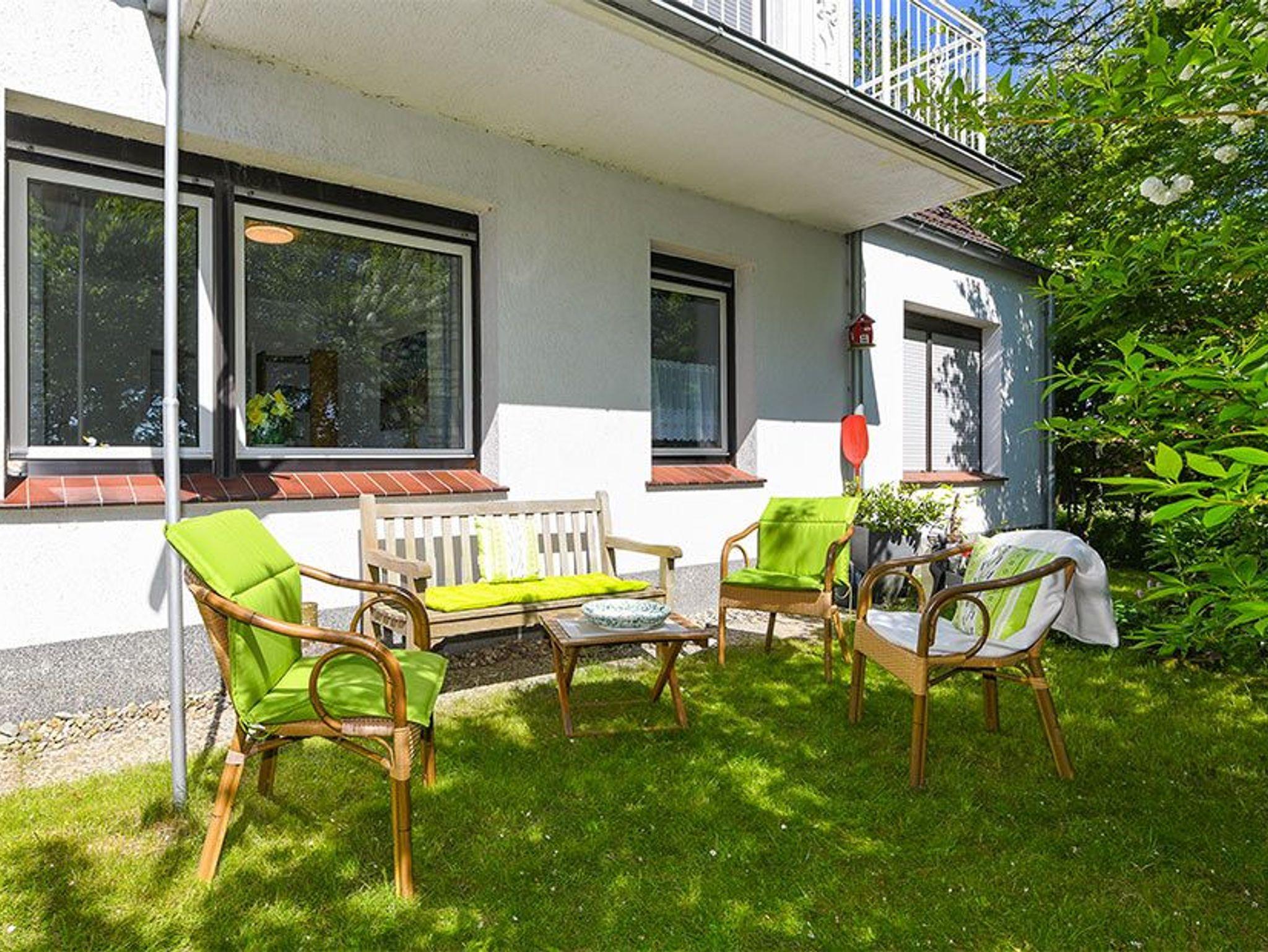 Es gibt eine überdachte Möglichkeit draußen vor dem Wohnzimmer auf dem Rasen zu sitzen; Der Zugang erfolgt über die Wohnungstür.