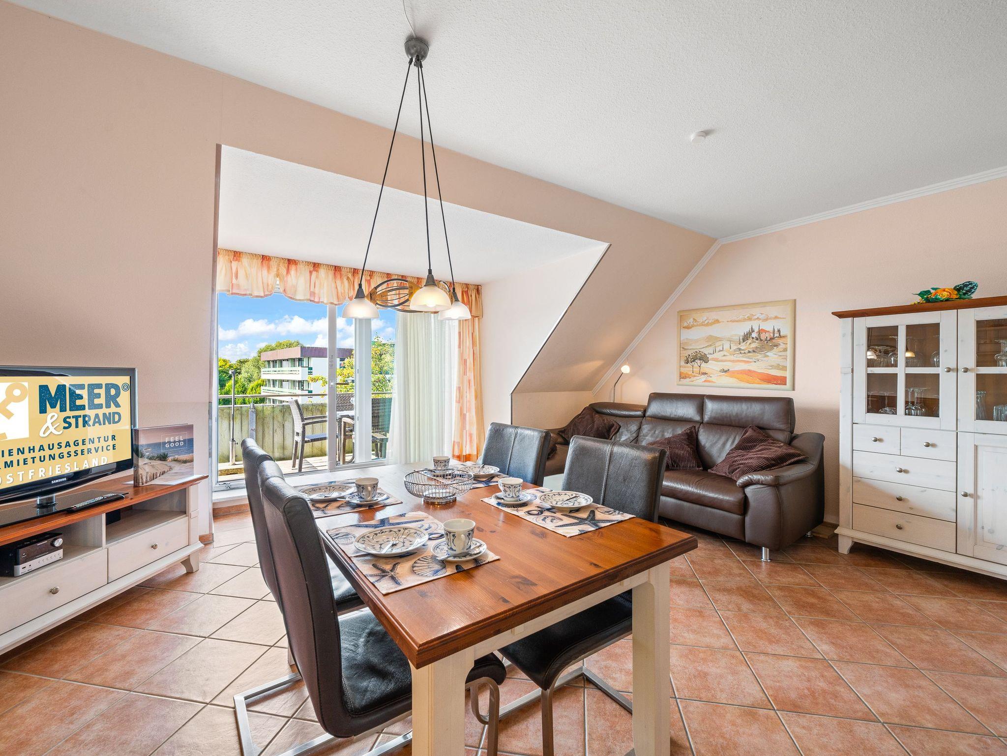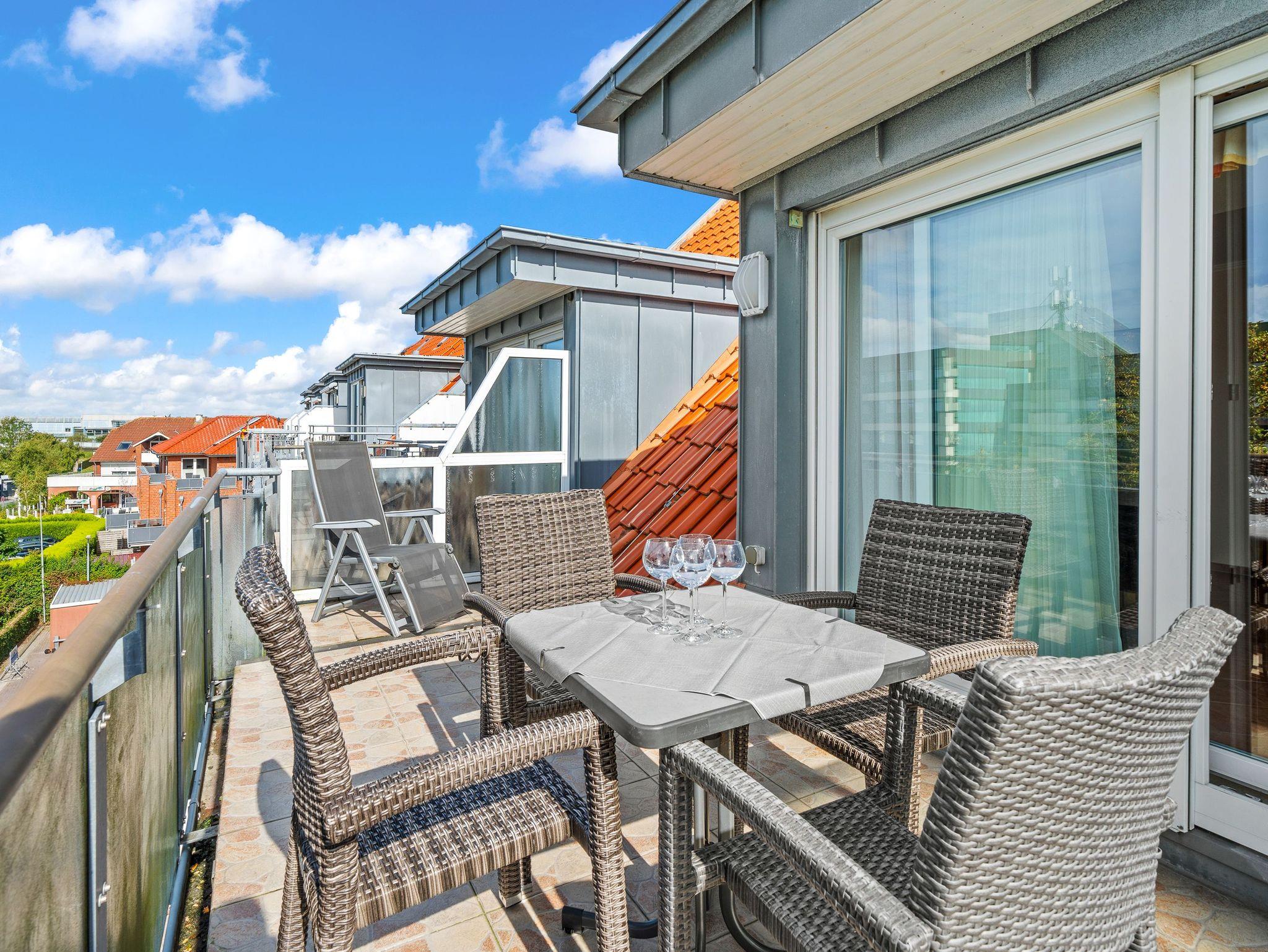 Moderne Ferienwohnung Krusenstern im Nordseegartenpark Bensersiel, nahe Nordsee und Hafen, mit Balkon und großer Dachterrasse.
