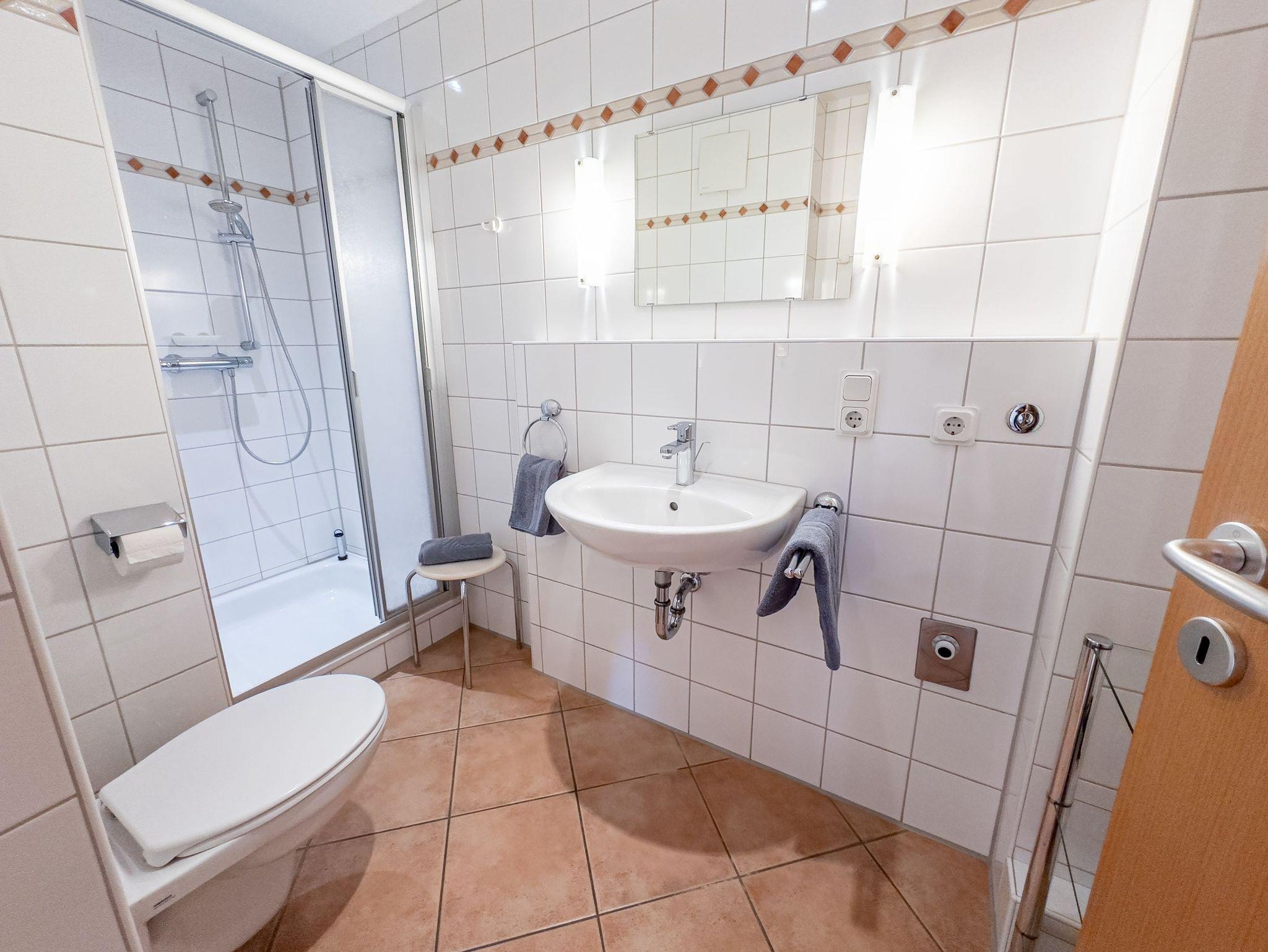 - Badezimmer mit Dusche, Waschtisch und WC