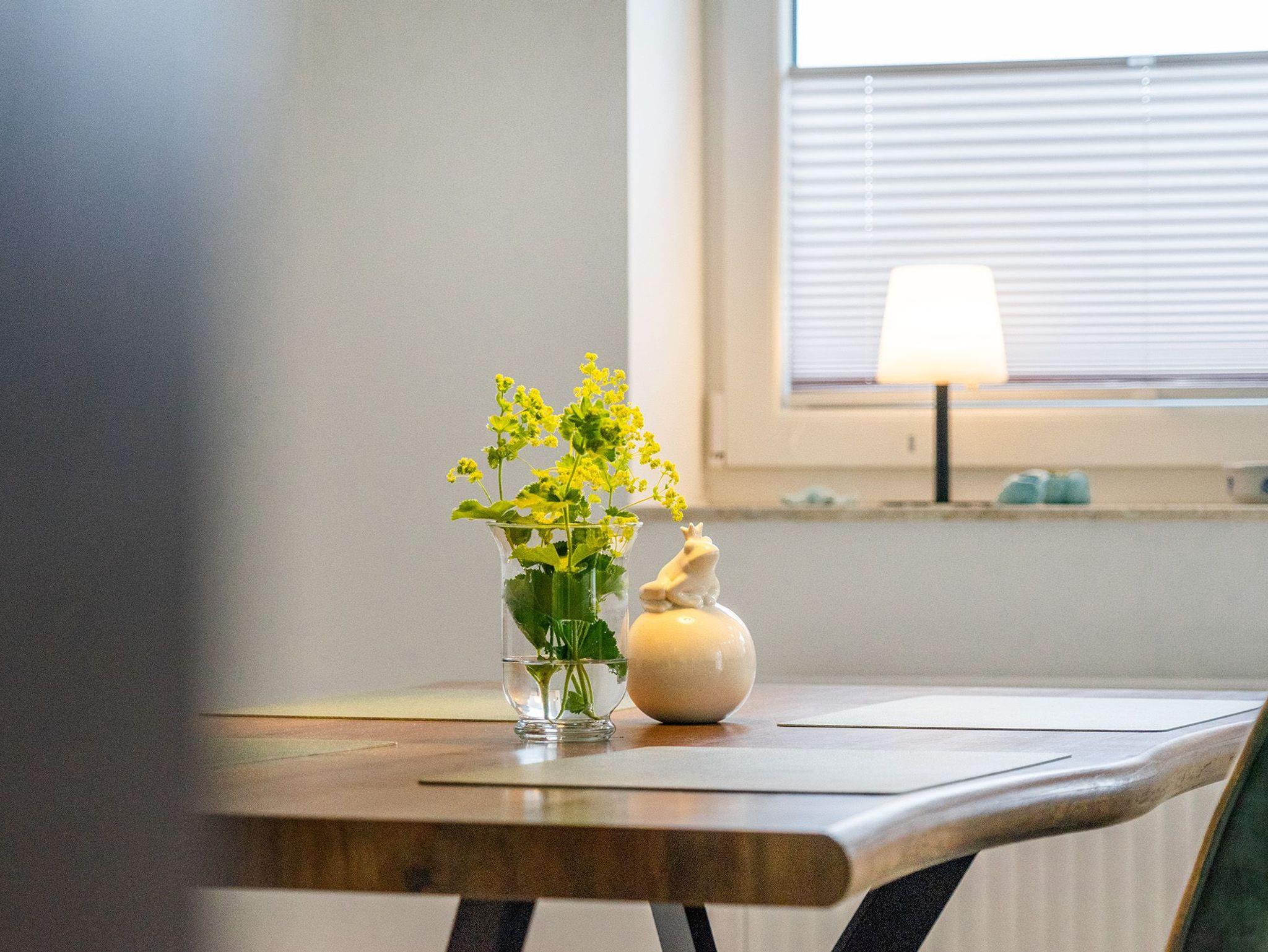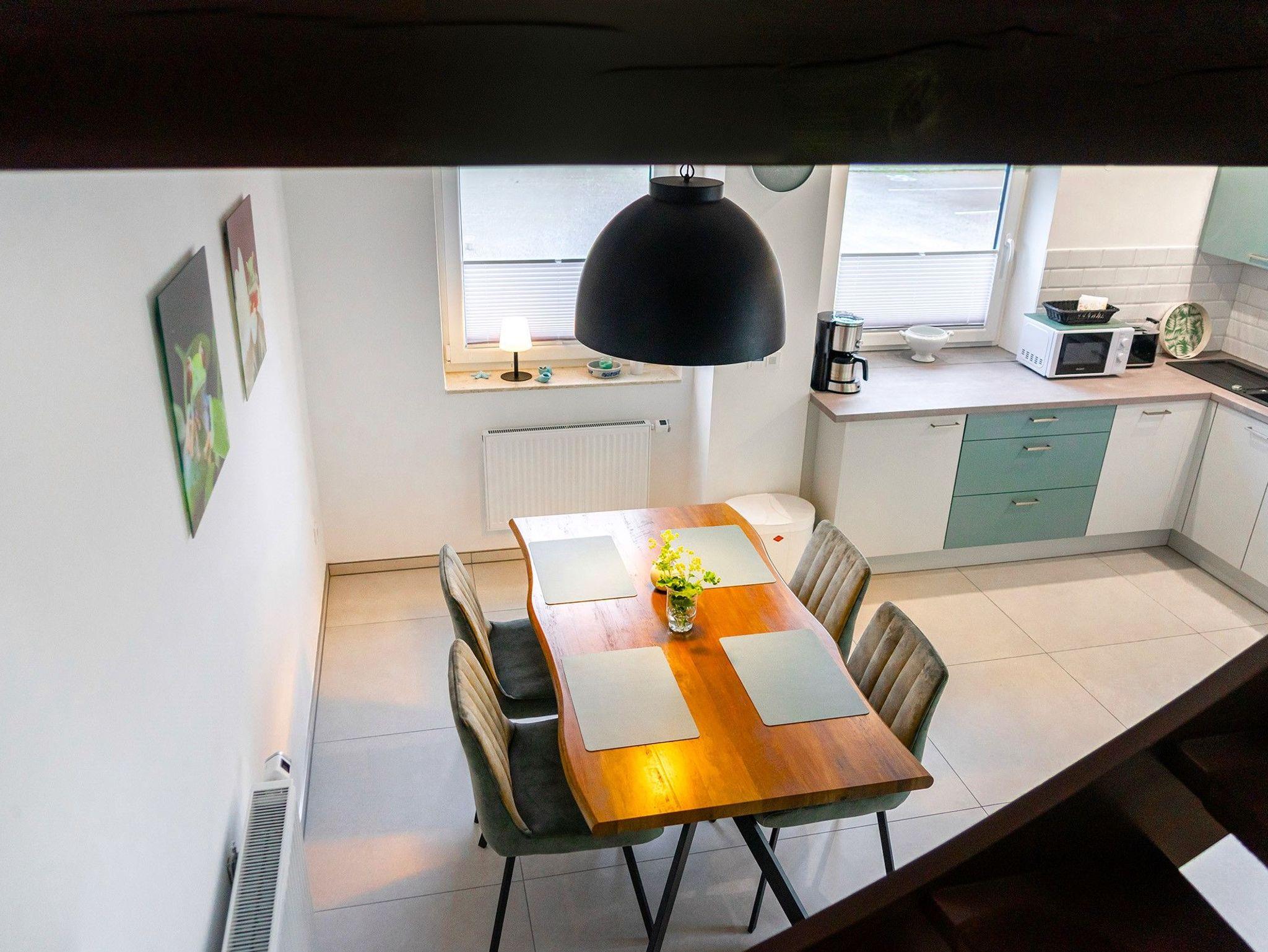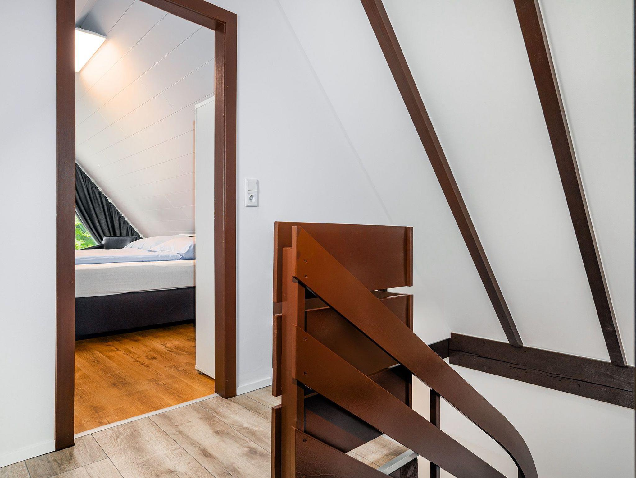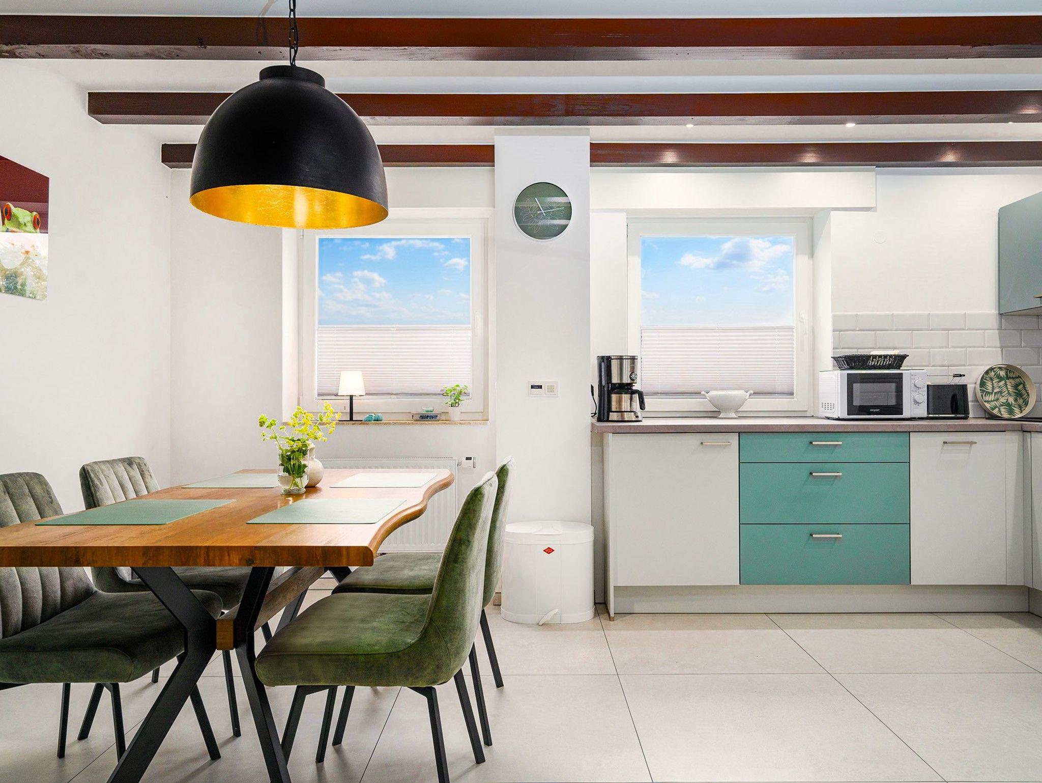 Das Ferienhaus „Kleine Hütte“ ist modern und gemütlich eingerichtet und gestaltet sowie sehr gut ausgestattet. Es gibt zum Beispiel eine Küche mit Geschirrspülmaschine und eine große Terrasse am Wohnzimmer mit direktem Gartenzugang und ein großzügiges Badezimmer.