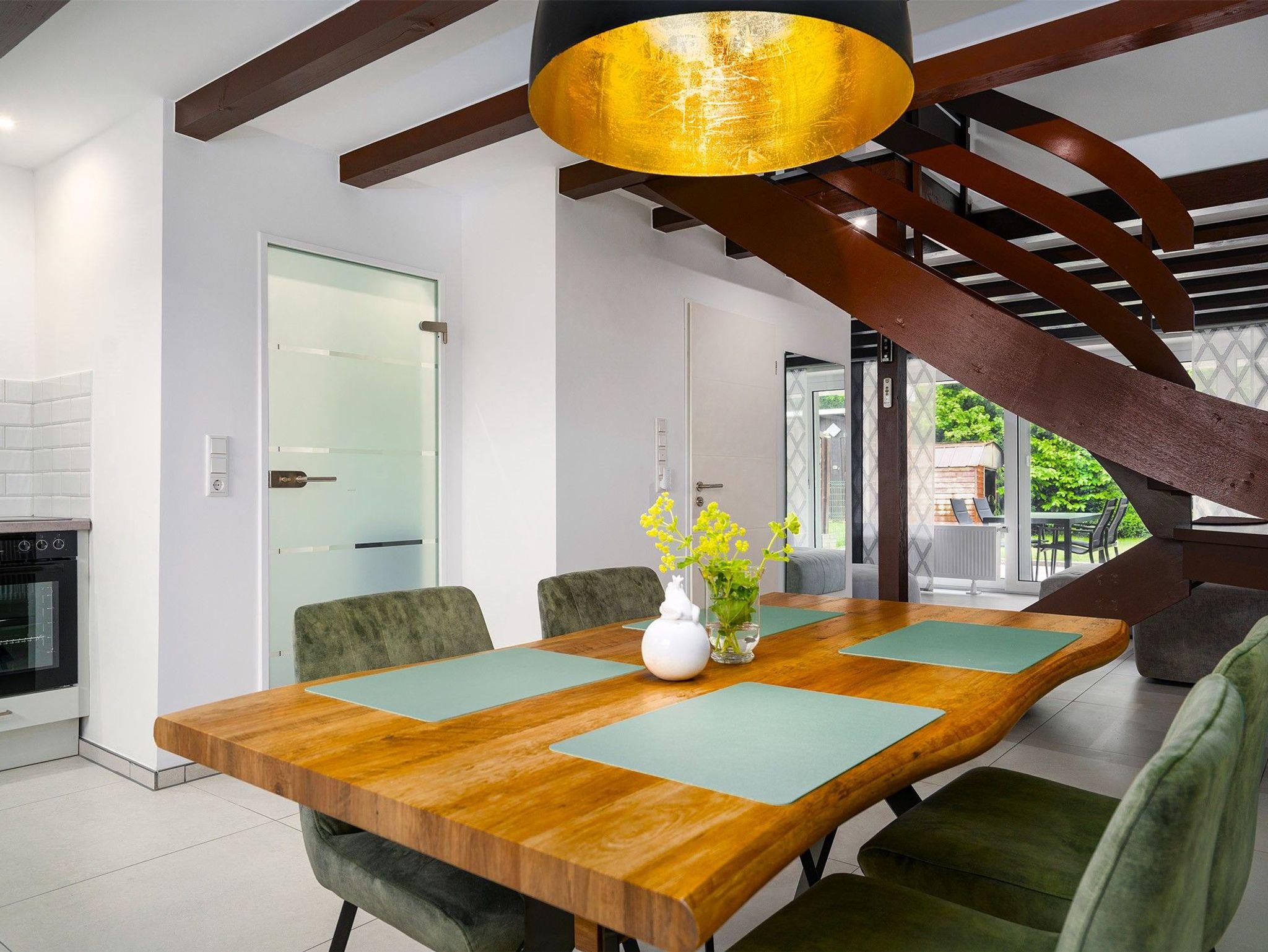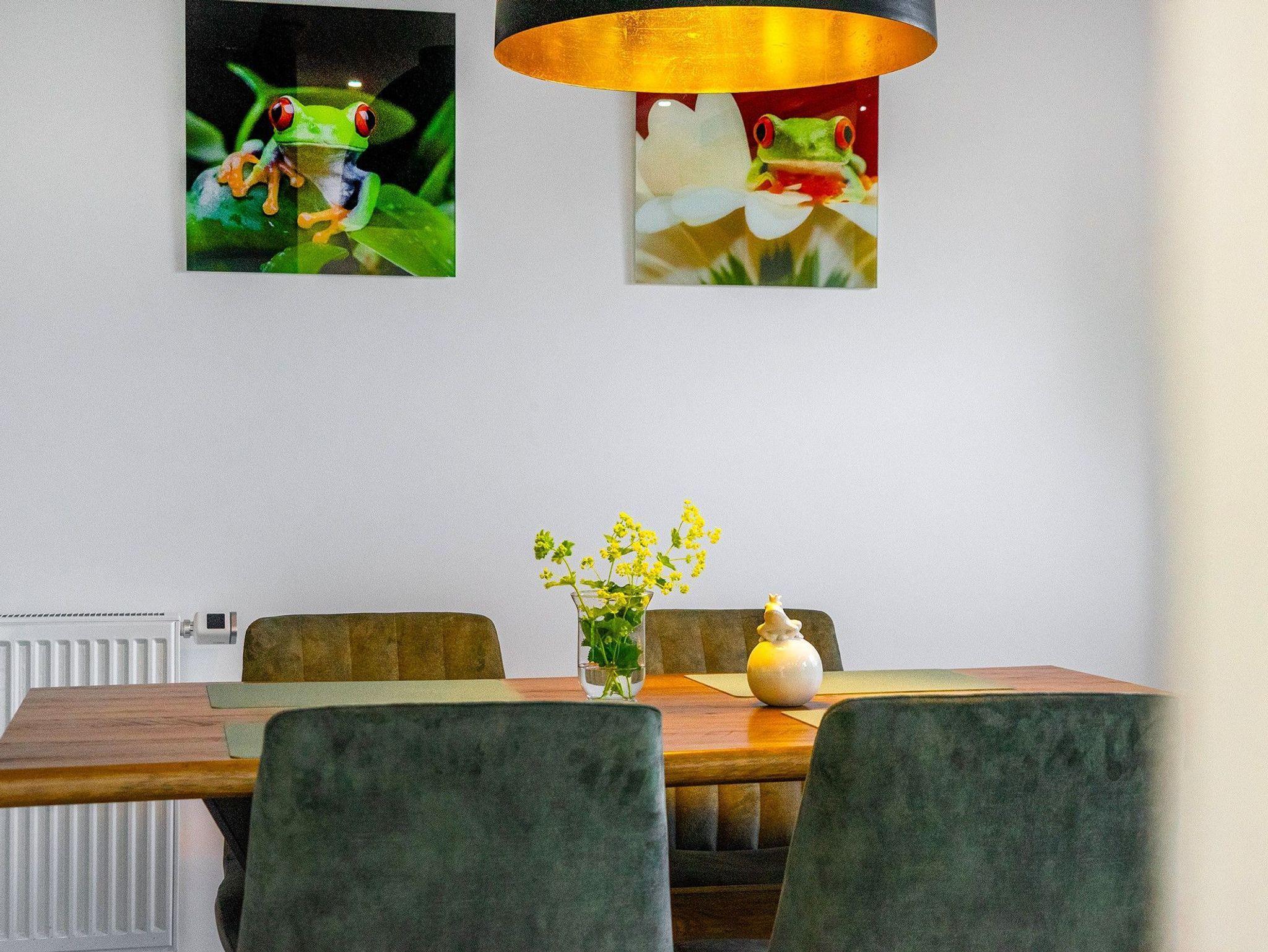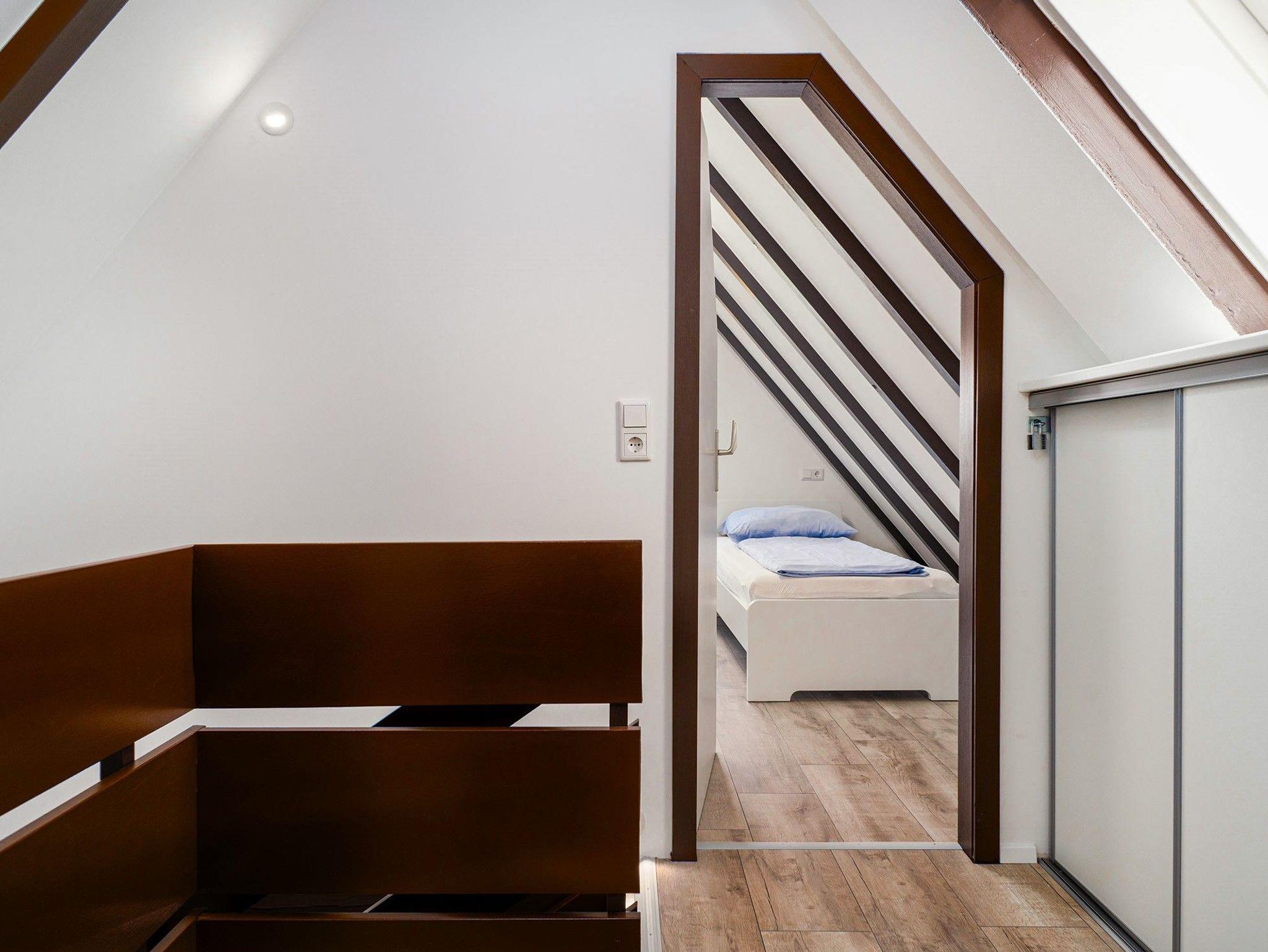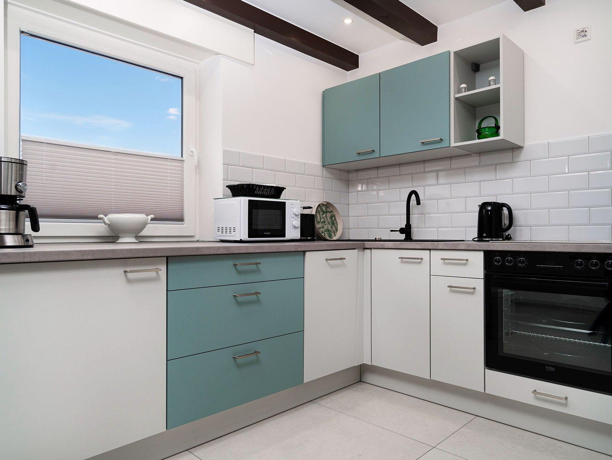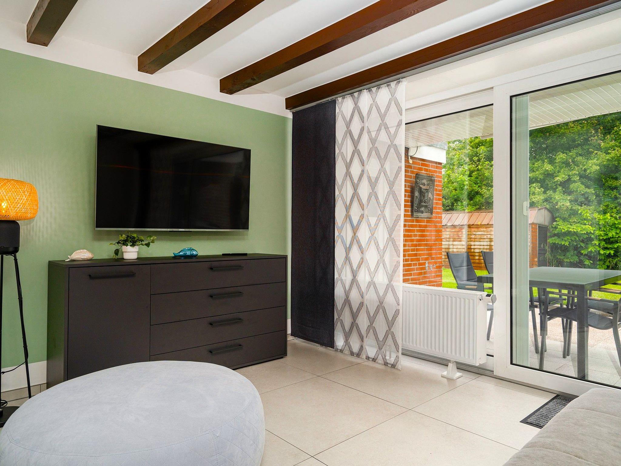 Das Ferienhaus „Kleine Hütte“ ist modern und gemütlich eingerichtet und gestaltet sowie sehr gut ausgestattet. Es gibt zum Beispiel eine Küche mit Geschirrspülmaschine und eine große Terrasse am Wohnzimmer mit direktem Gartenzugang und ein großzügiges Badezimmer.