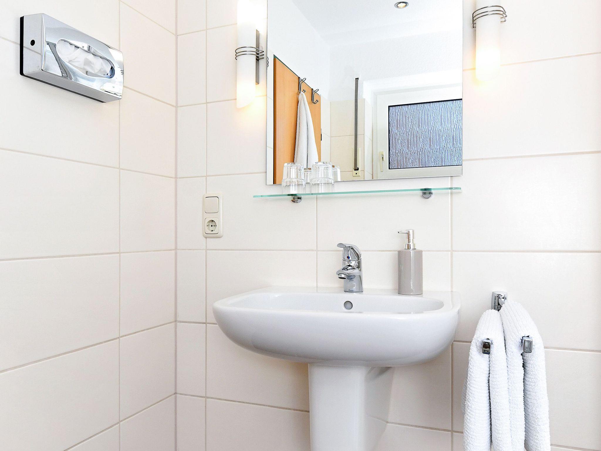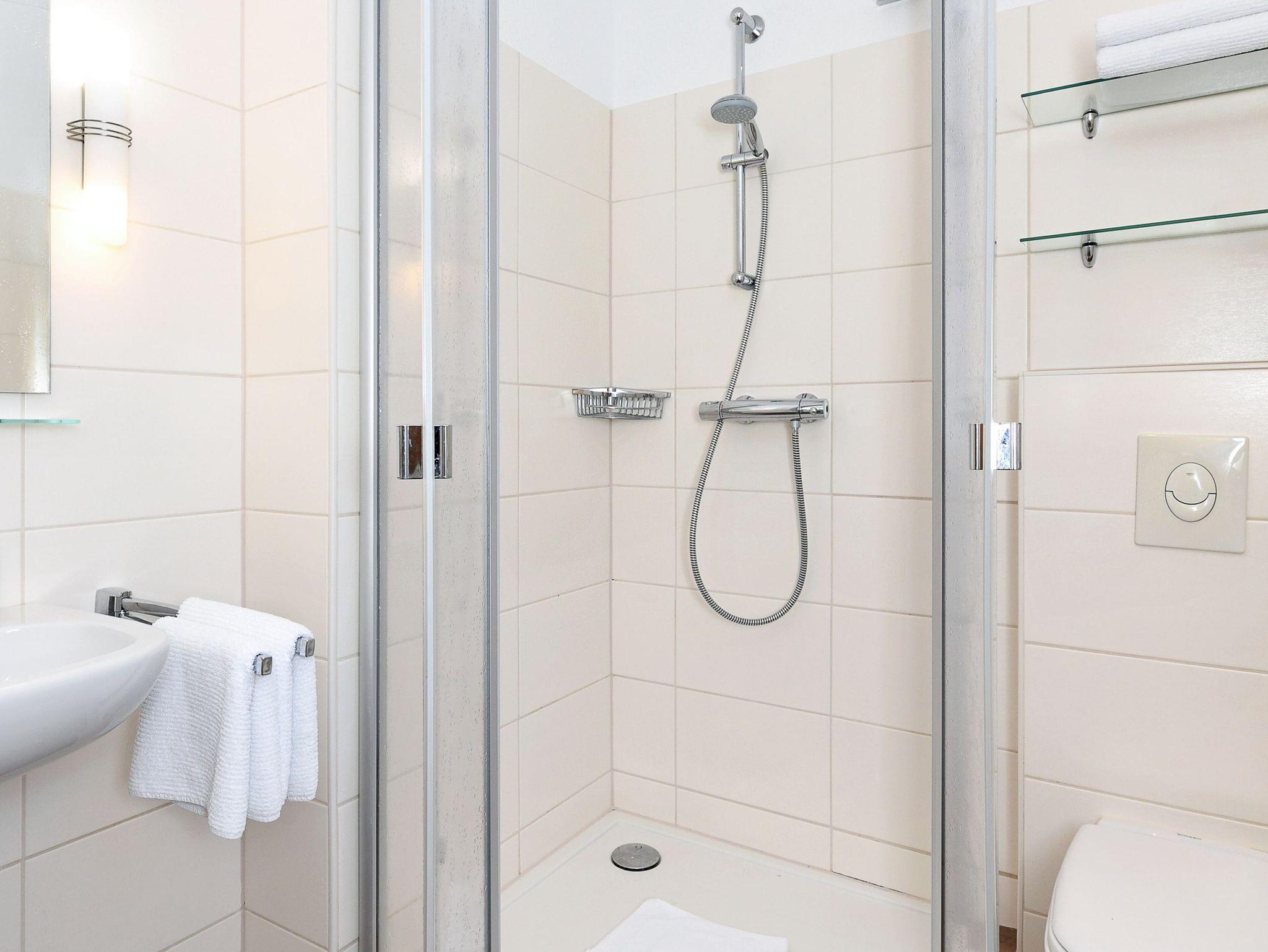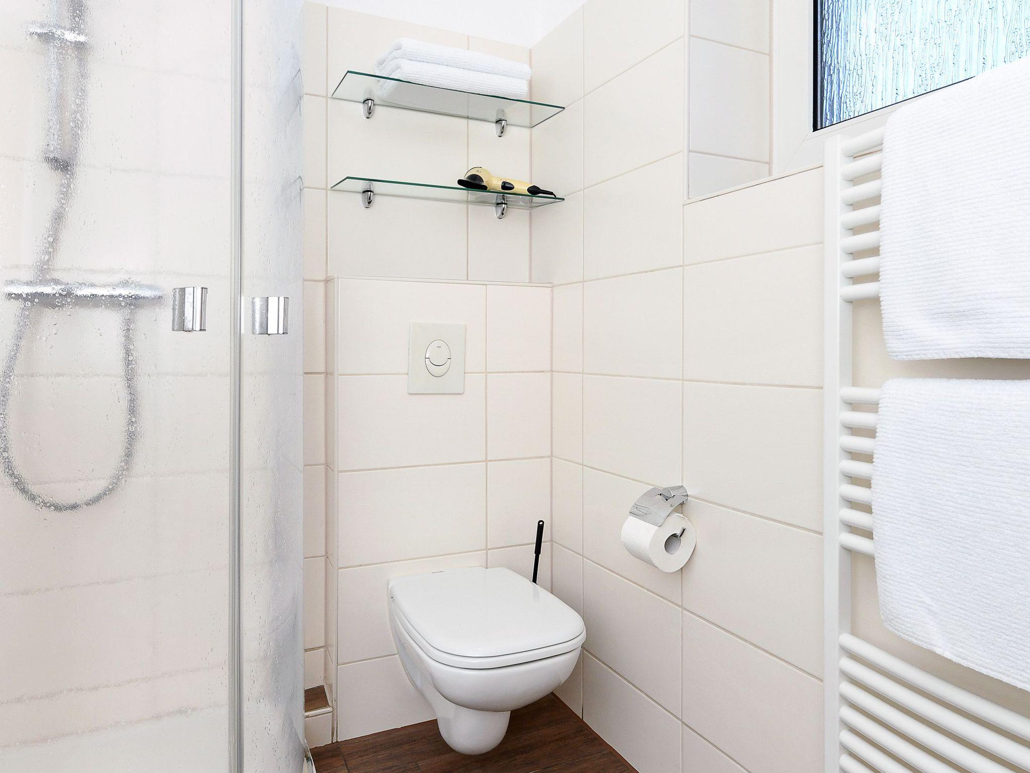 Größe ca. 16 Quadratmeter, Zimmer, Badezimmer mit Dusche, Waschtisch und WC, Erdgeschoss, optimal für 1 bis 2 Personen.