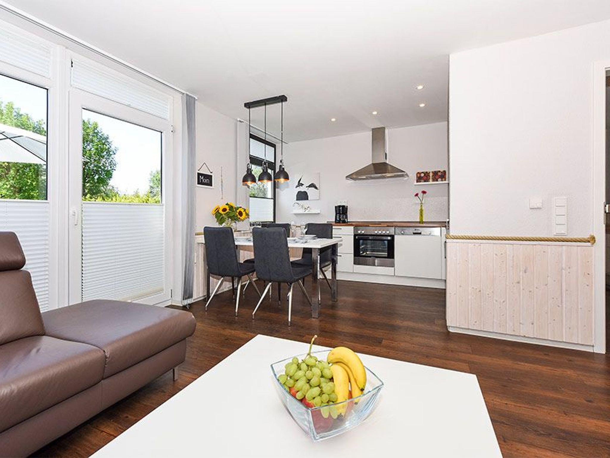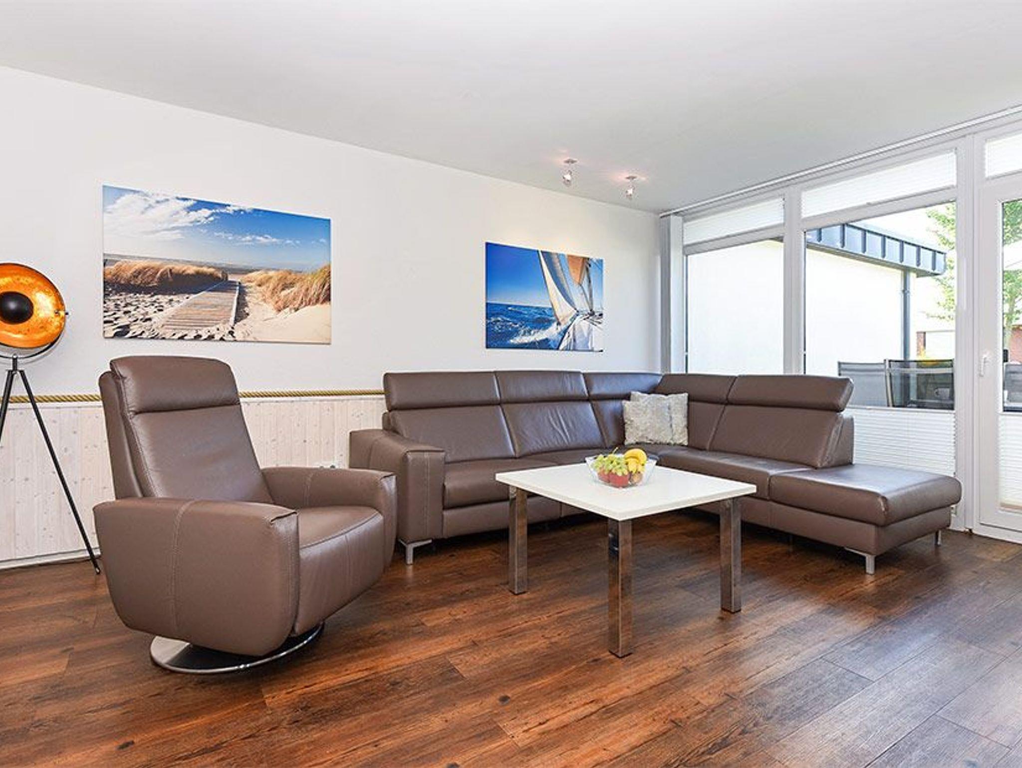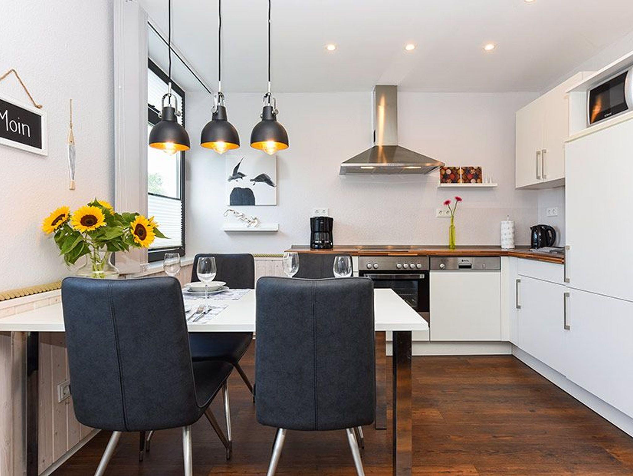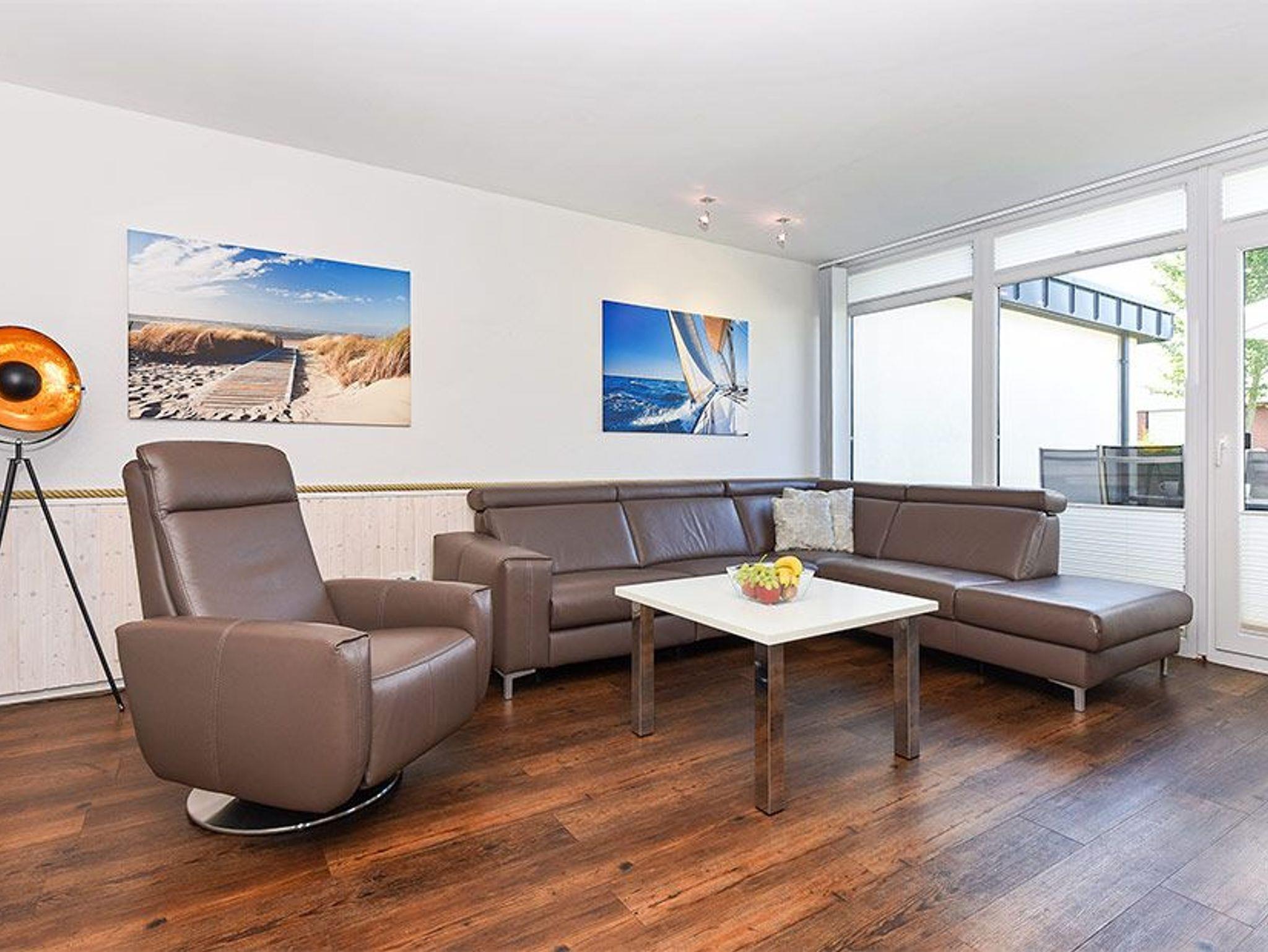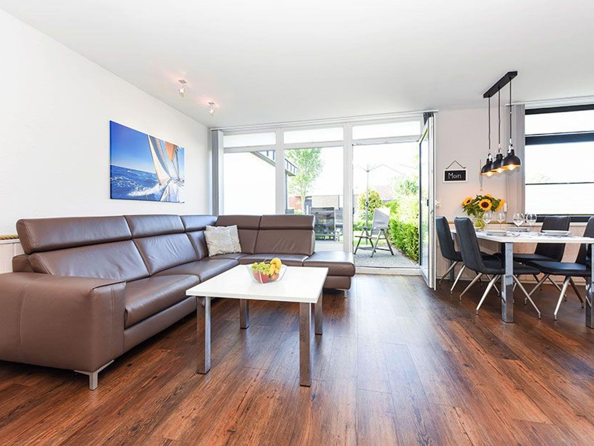 Modern eingerichtete Ferienwohnung in Bensersiel mit Terrasse, ideal für einen stilvollen Nordseeurlaub.