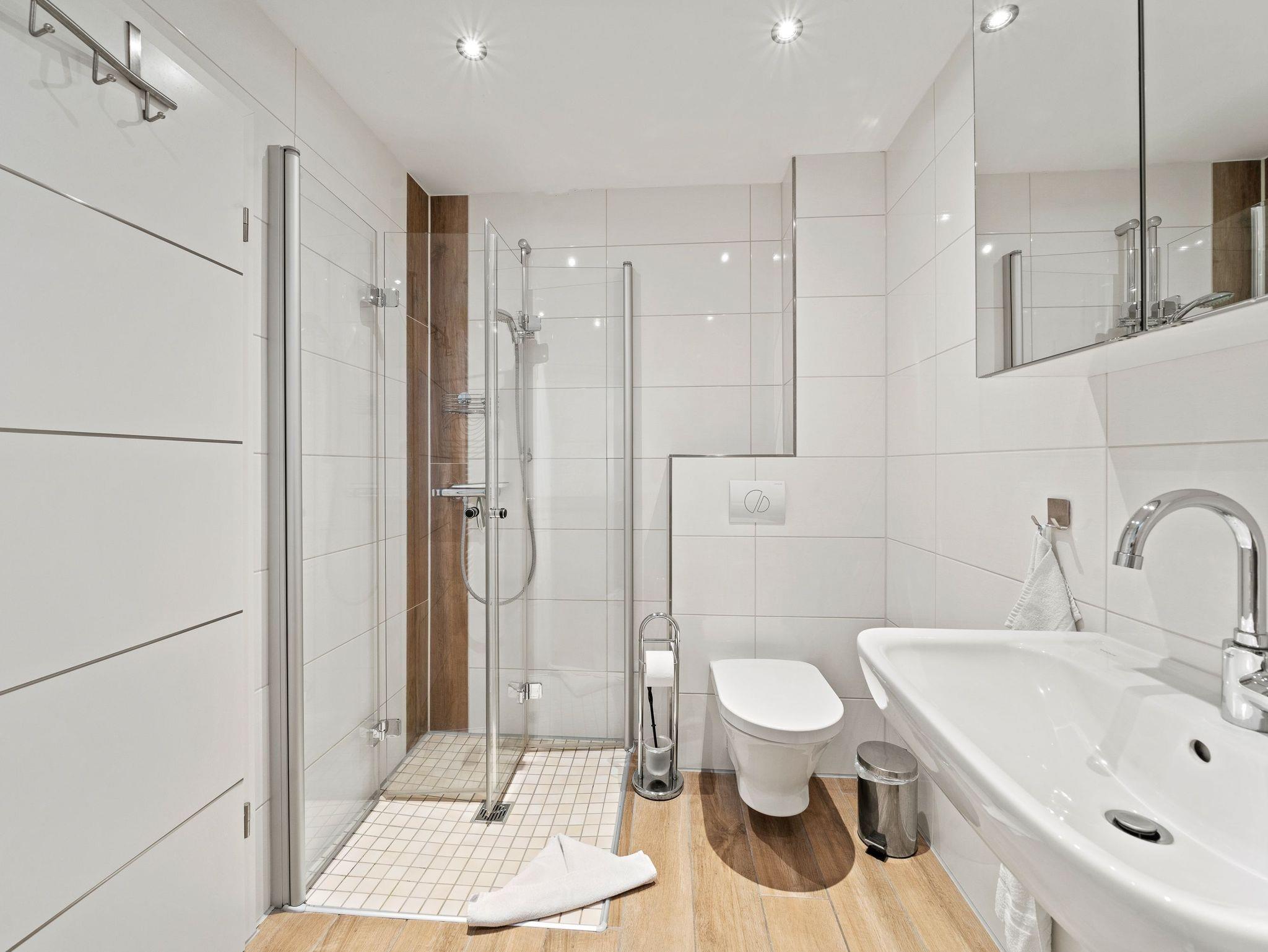 - Badezimmer mit Dusche, Waschtisch und WC