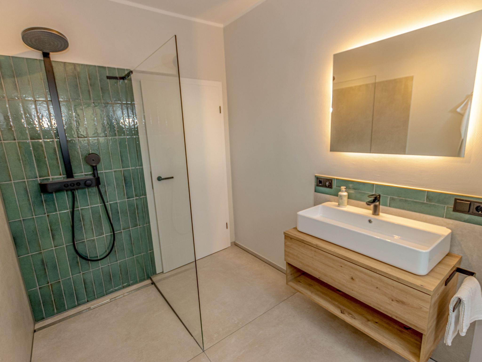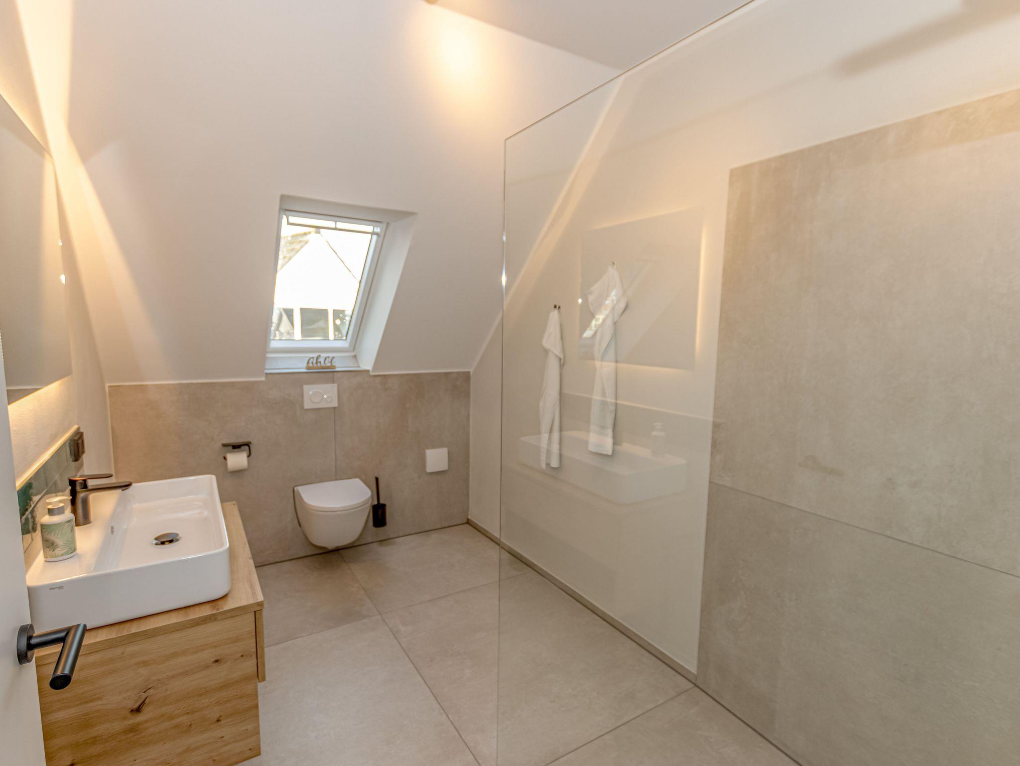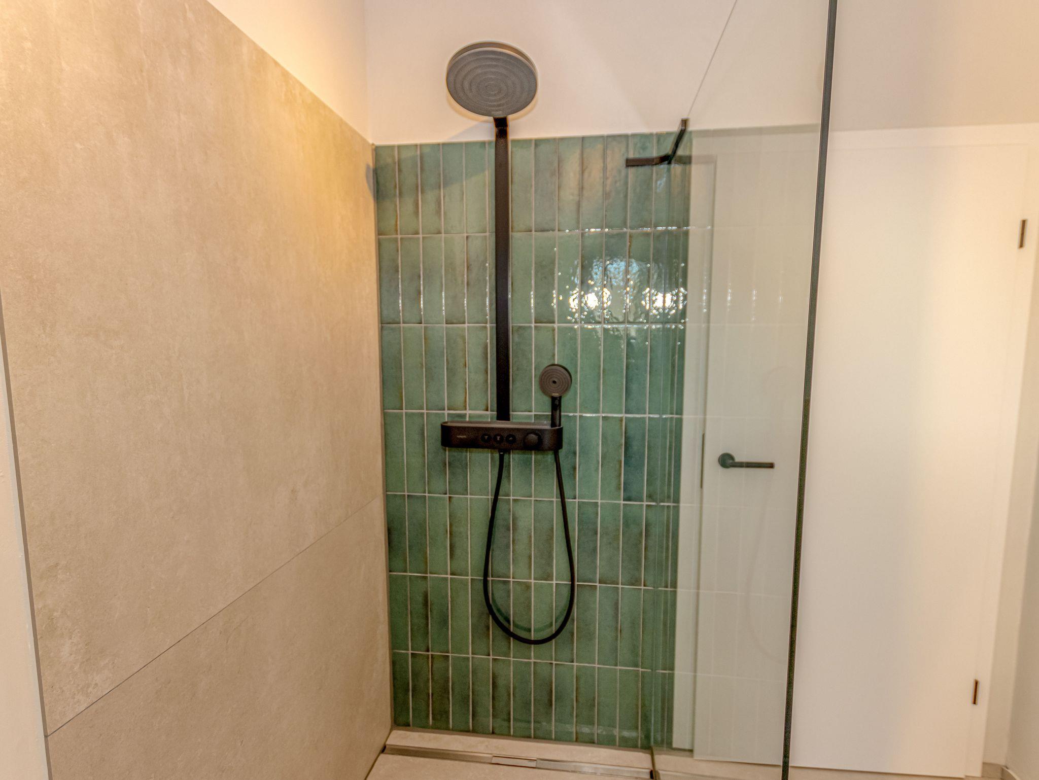 Großzügiges, modernes Badezimmer mit einer großen, geräumigen und sehr modernen Duscharmatur.