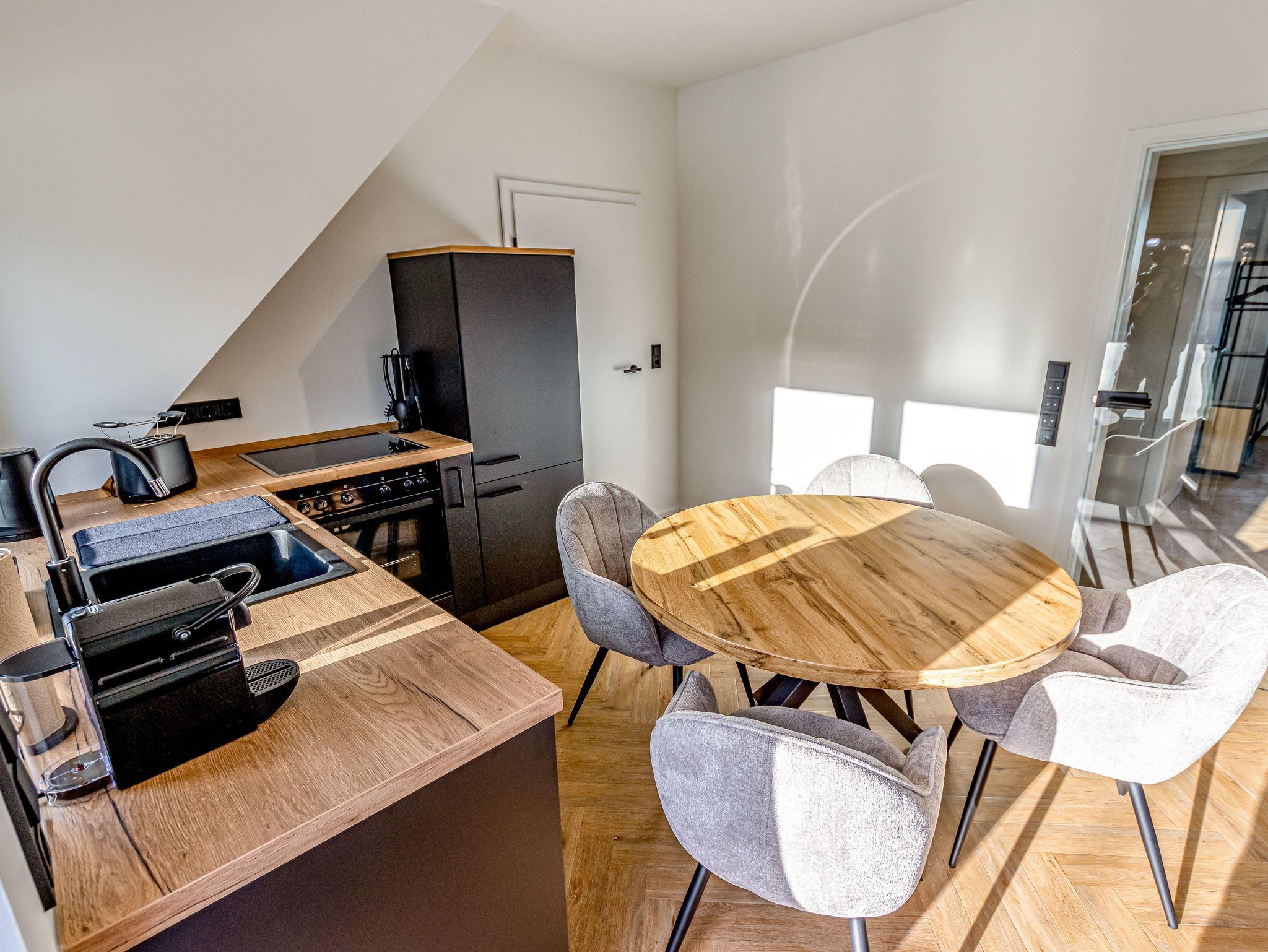 Der offene Wohnbereich verfügt über eine moderne, voll ausgestattete Küche mit integriertem Essbereich.