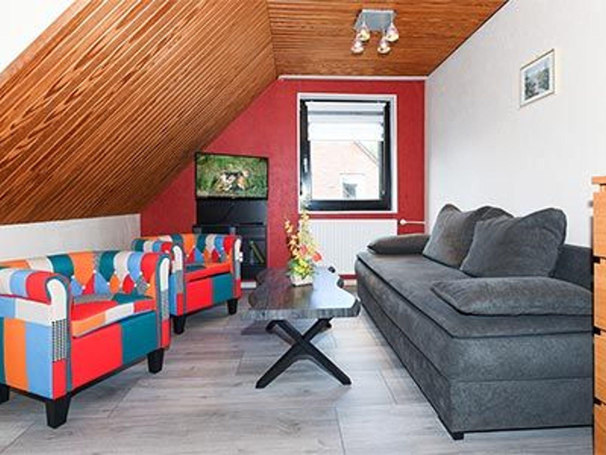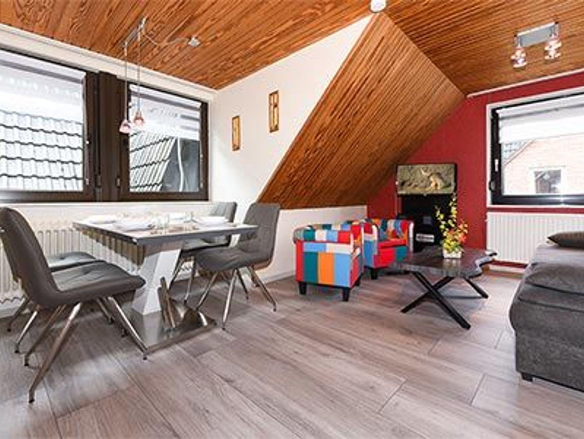 Größe ca. 48 Quadratmeter, Wohn- und Schlafraum, Küche abgeteilt bei offener Wohnraumgestaltung, zweites separates Schlafzimmer, Badezimmer mit Dusche, Waschtisch und WC, Obergeschoss, optimal für 2 bis 4 Personen und zusätzlich ein Kleinkind.