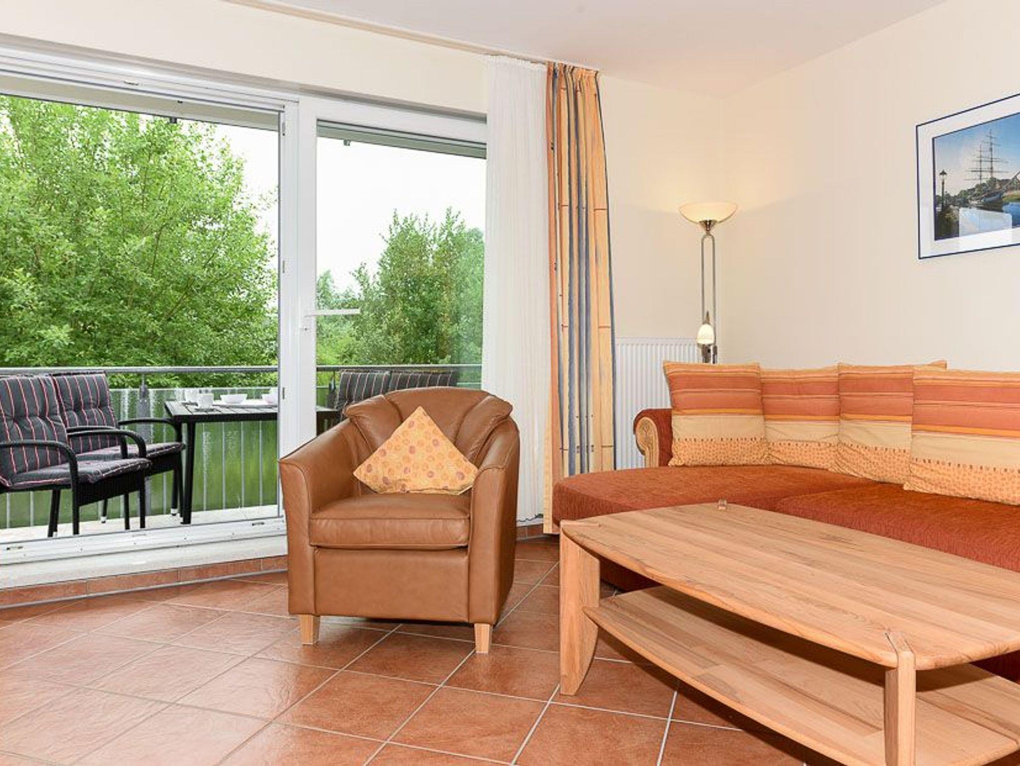 Moderne Ferienwohnung Gesine im Nordseegartenpark Bensersiel mit Balkon, Blick auf Hafen und Nordsee, nahe Strand und Zentrum.