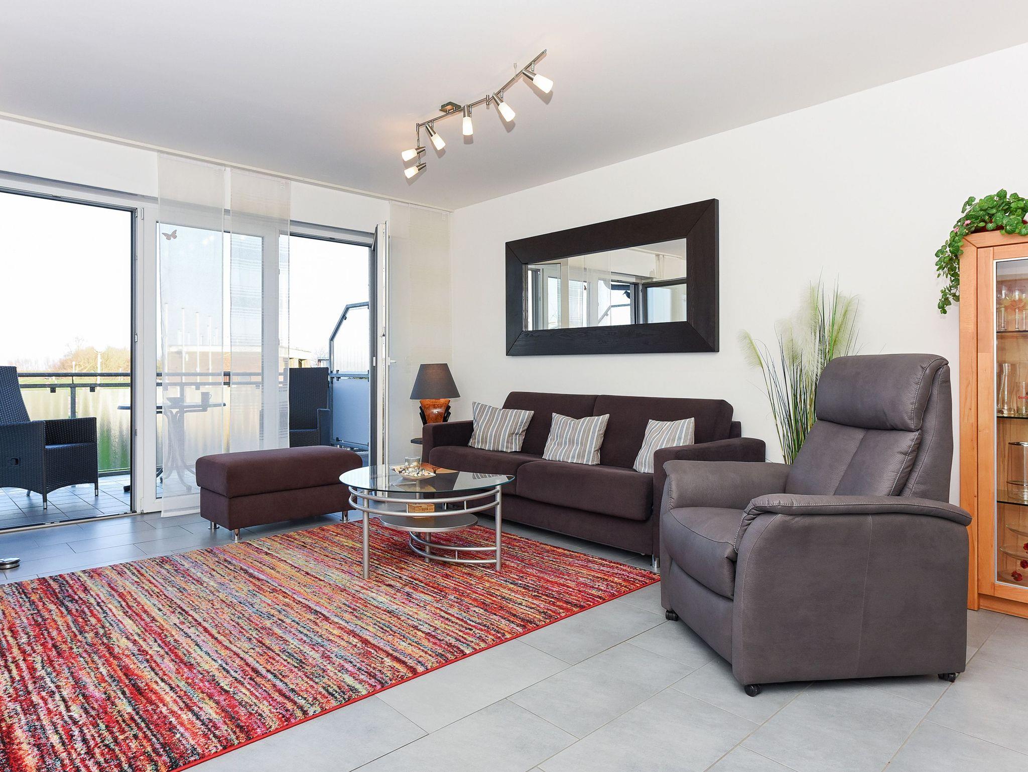 Genießen Sie Meerblick und Komfort in der Ferienwohnung Queen Mary II in Bensersiel nahe Strand und Hafen.
