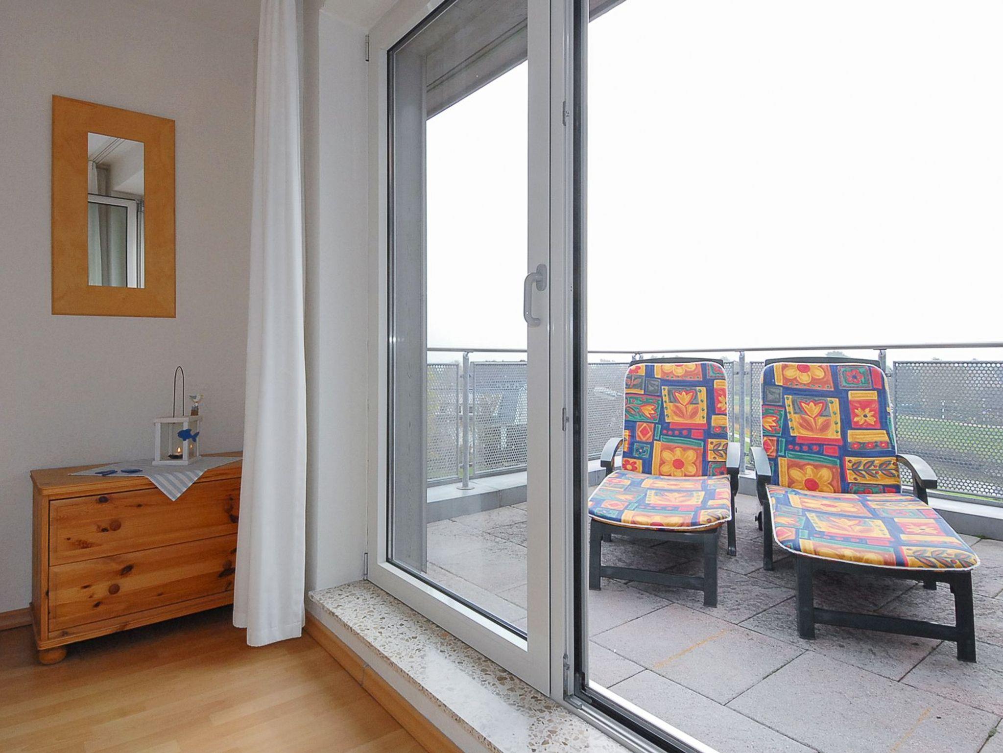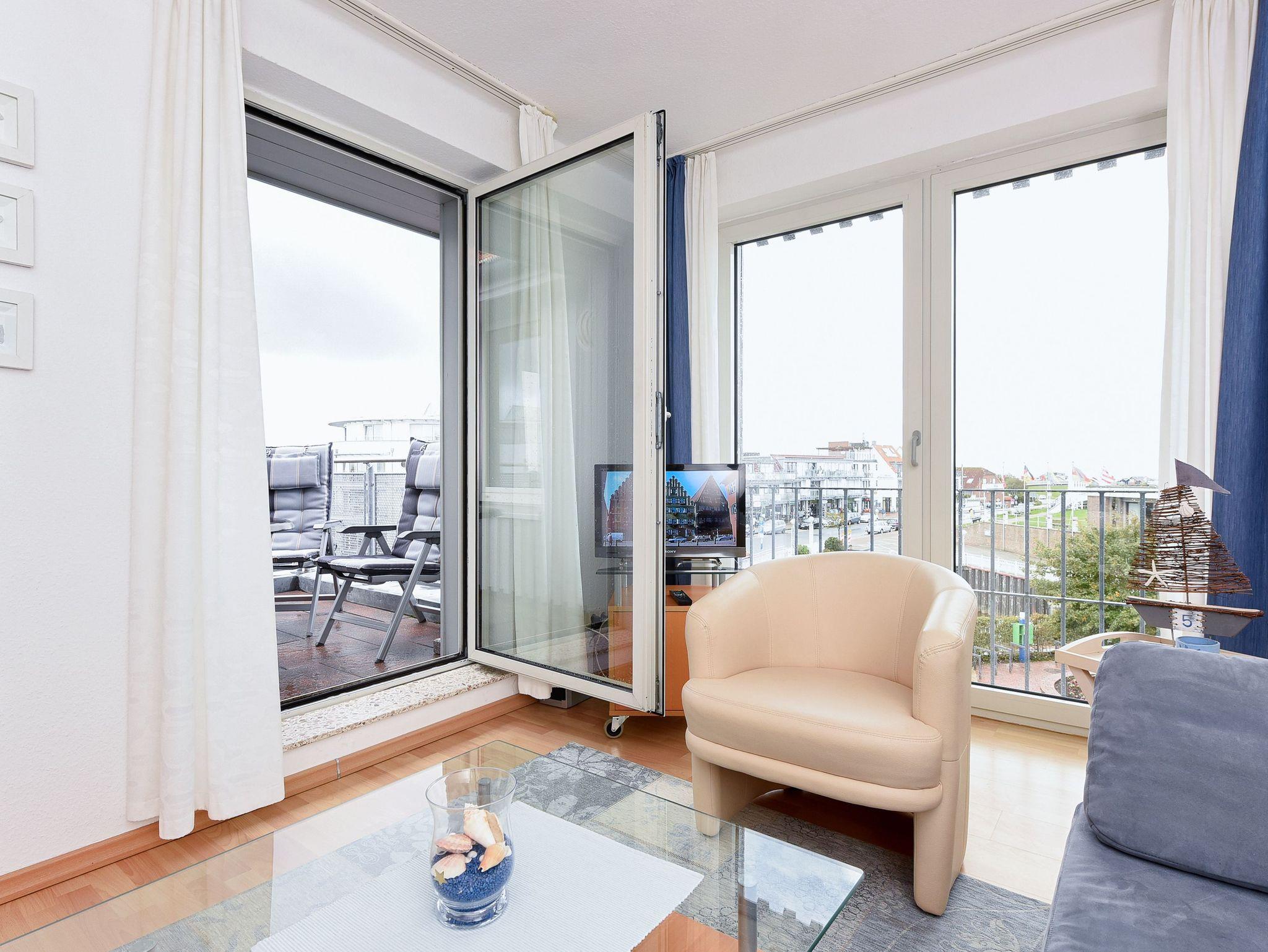 Die Wohnung „Lee“ verfügt über zwei Balkone. Einen in Richtung Westen mit Blick auf den Hafen und die Nordsee sowie einen in Richtung Süden mit Blick auf das Nordseeheilbad Bensersiel.
