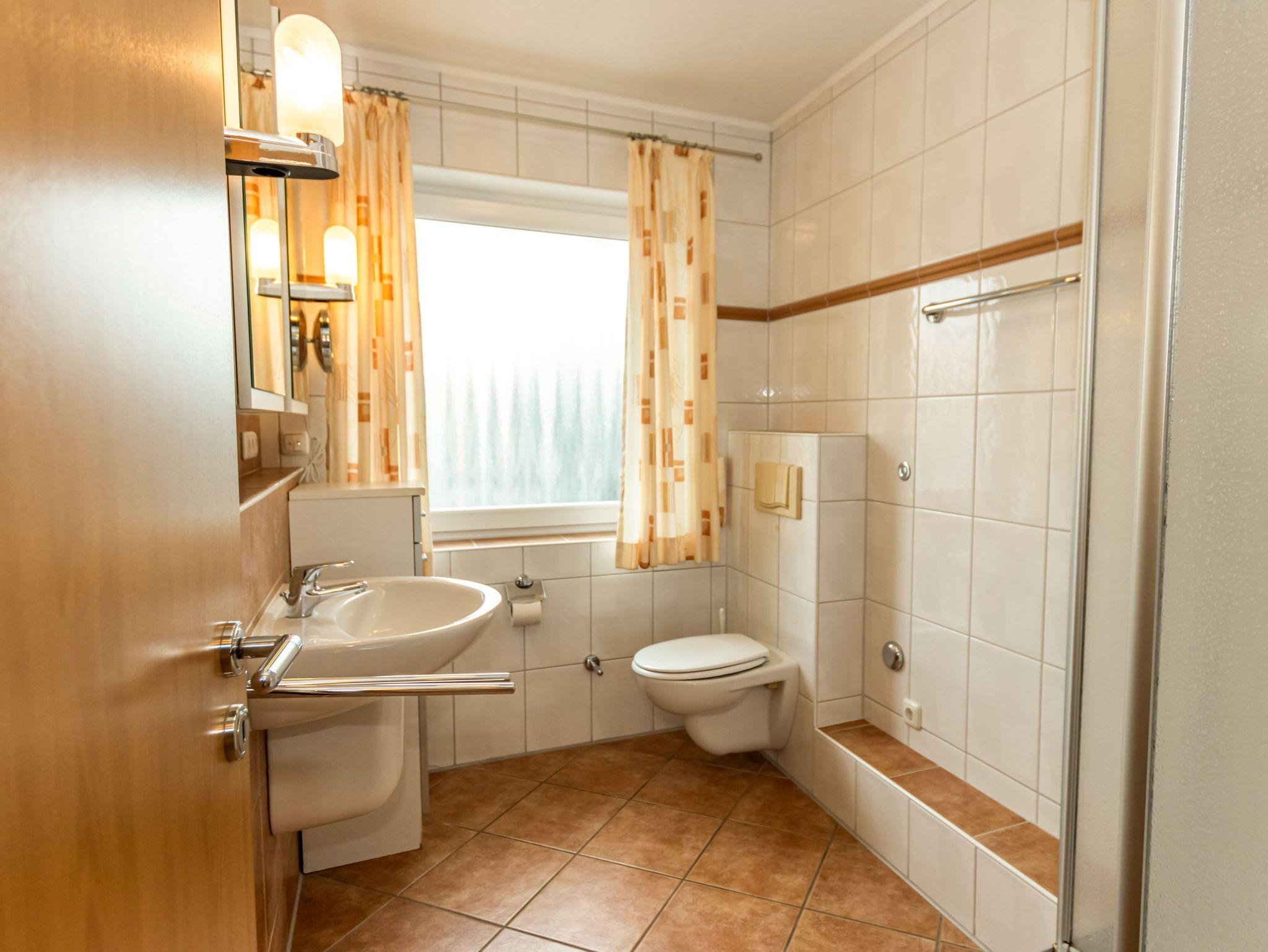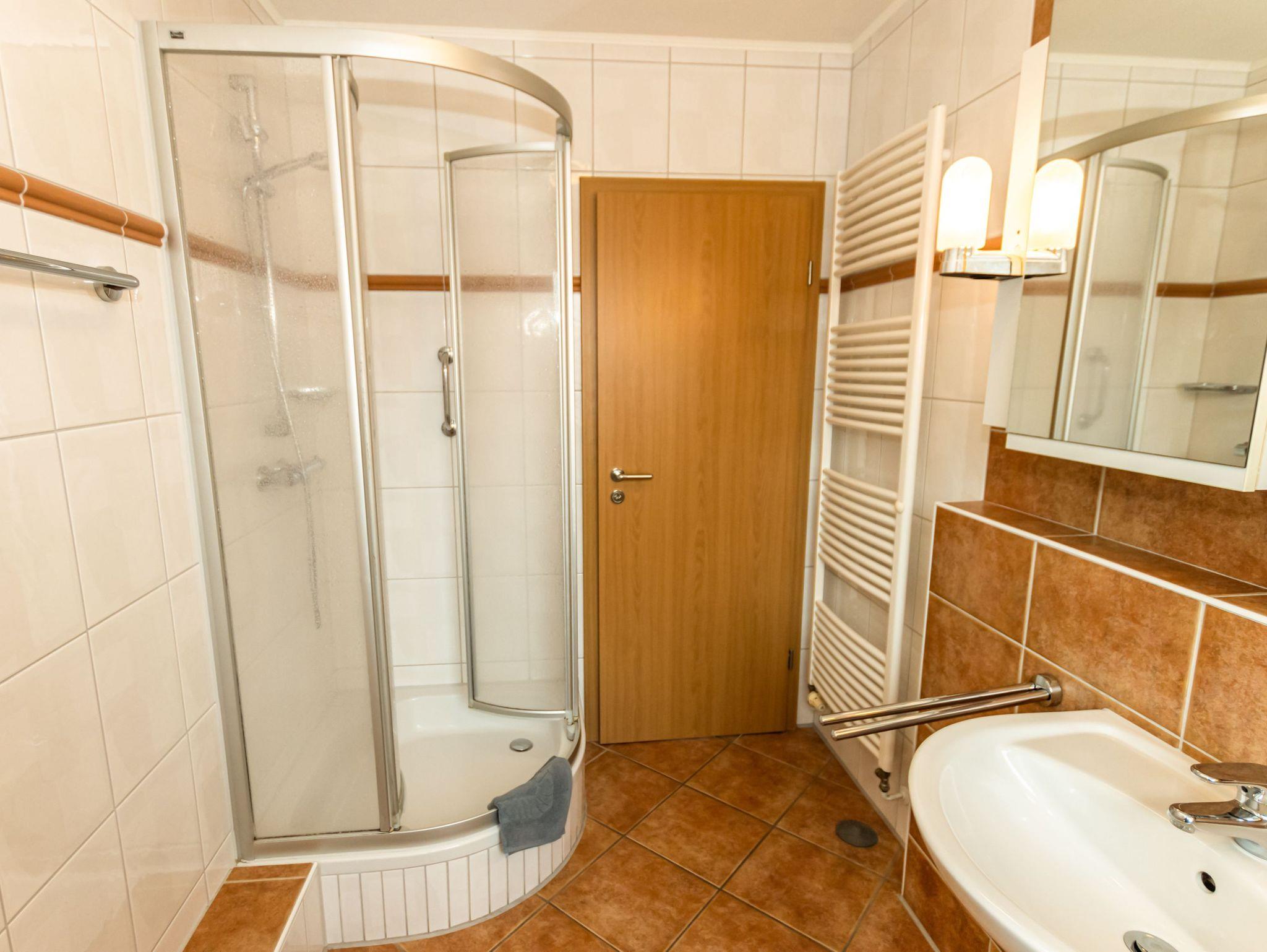 - Badezimmer mit Dusche, Waschtisch und WC