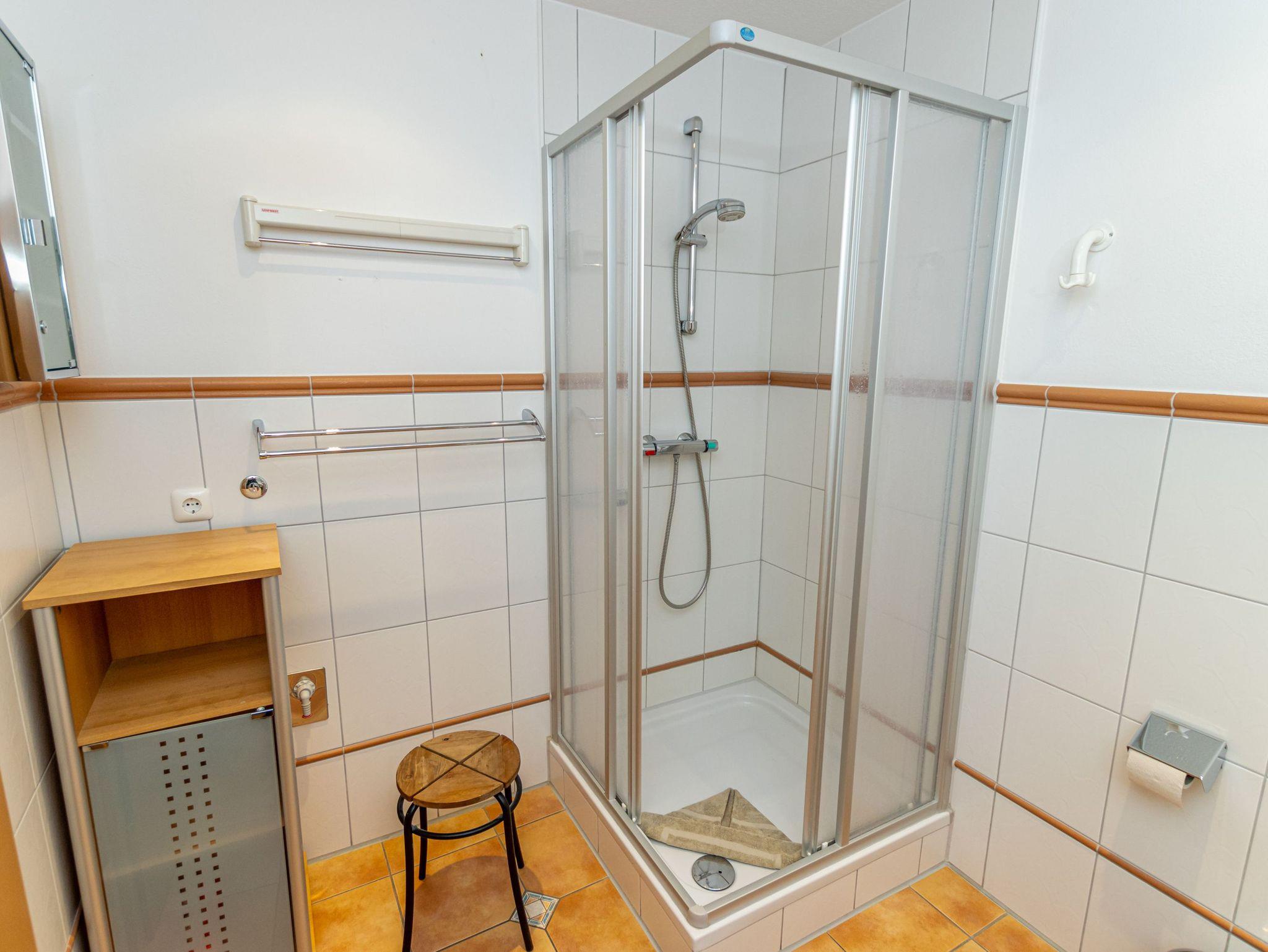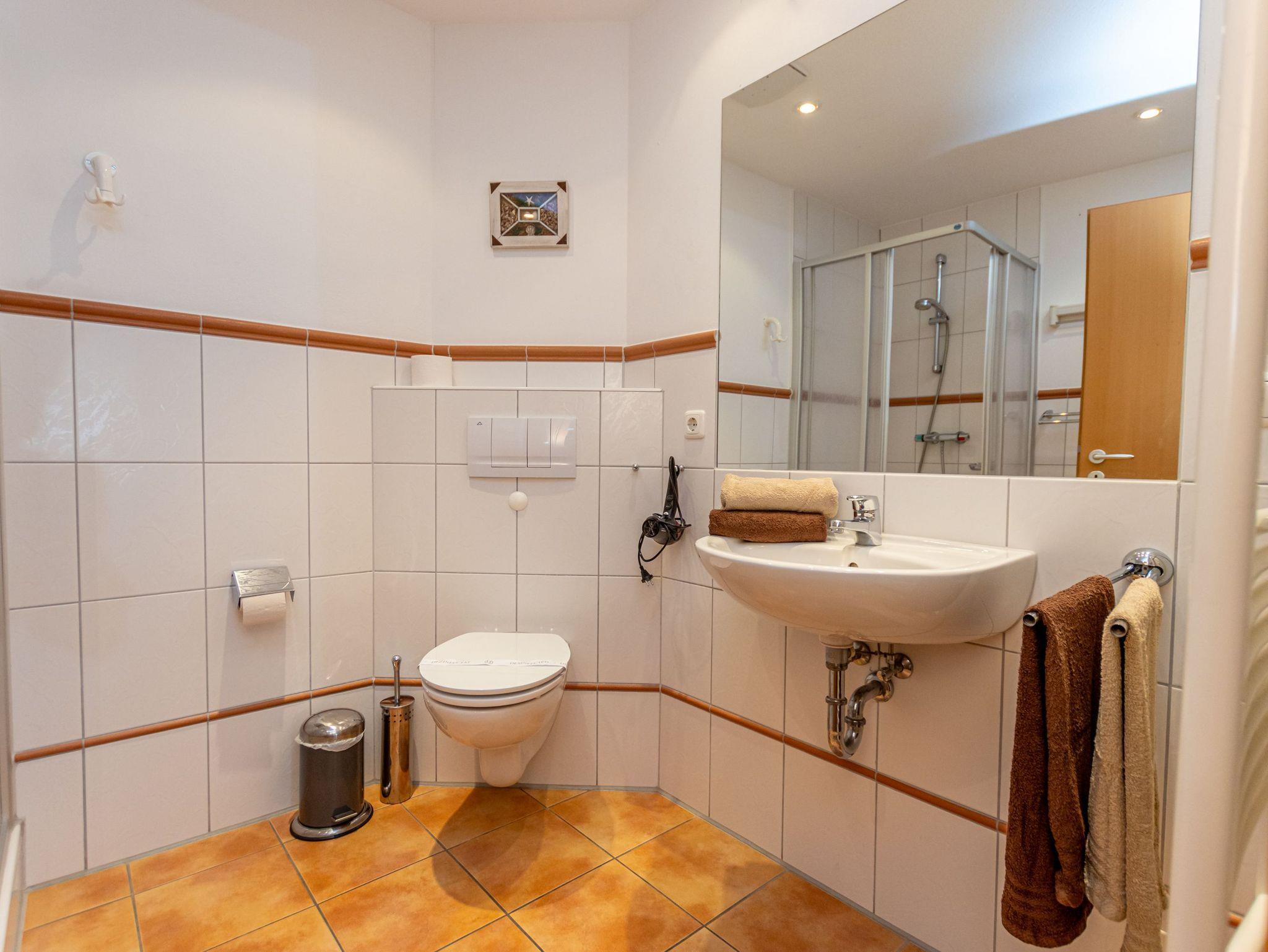 - Badezimmer mit Dusche, Waschtisch und WC