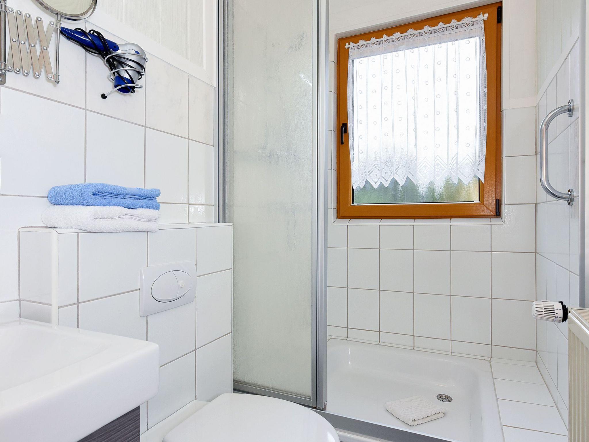 Badezimmer mit Dusche, Waschtisch und WC