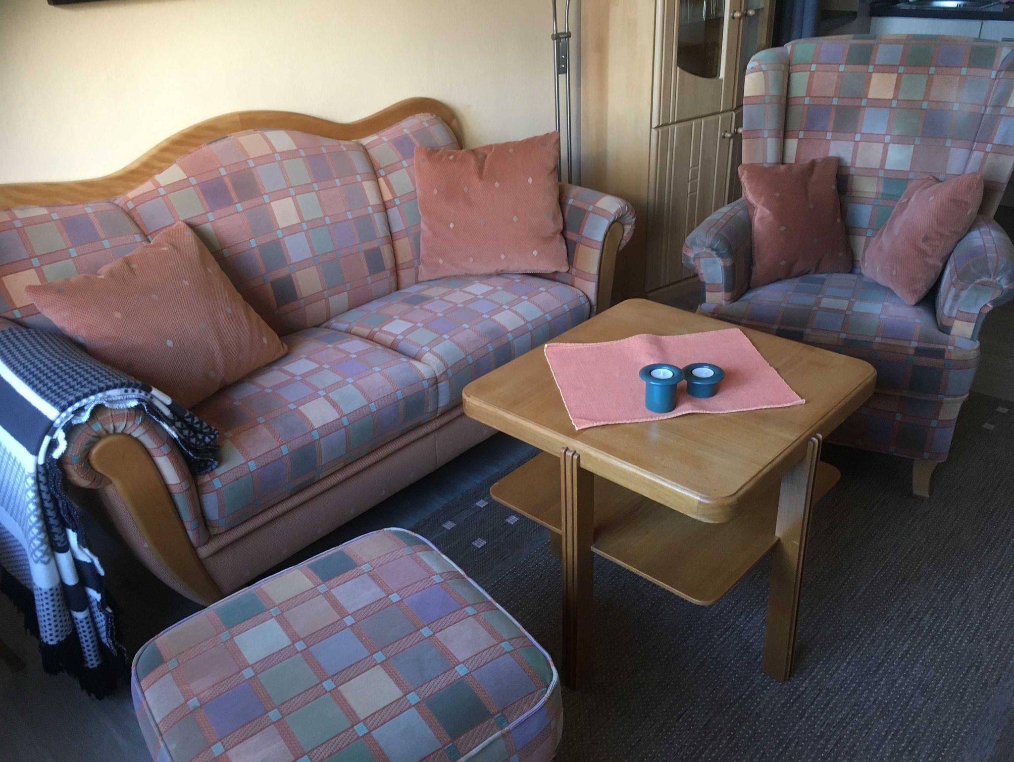 Nach dem Eingangsbereich erreichen sie das Bad mit WC/Dusche, dann finden sie die kleine Küchenecke mit Kaffeemaschine, Toaster, Wasserkocher, Tischbackofen, Eierkocher, Töpfe und Geschirr sind auch ausreichend da. Im anschließenden Wohnraum mit Essecke, gibt es einen Fernseher und CD- Player. Für wohlige Wärme in der kälteren Jahreszeit sorgt eine Infrarotheizung mit Temperaturregler. Im Schlafraum befinden sich zwei Einzelbetten (90x200cm) und ein Kleiderschrank. (Renovierung 2019, Wände, Fussboden, Zimmertüren, Möbel) Neue Matratzen 2022.