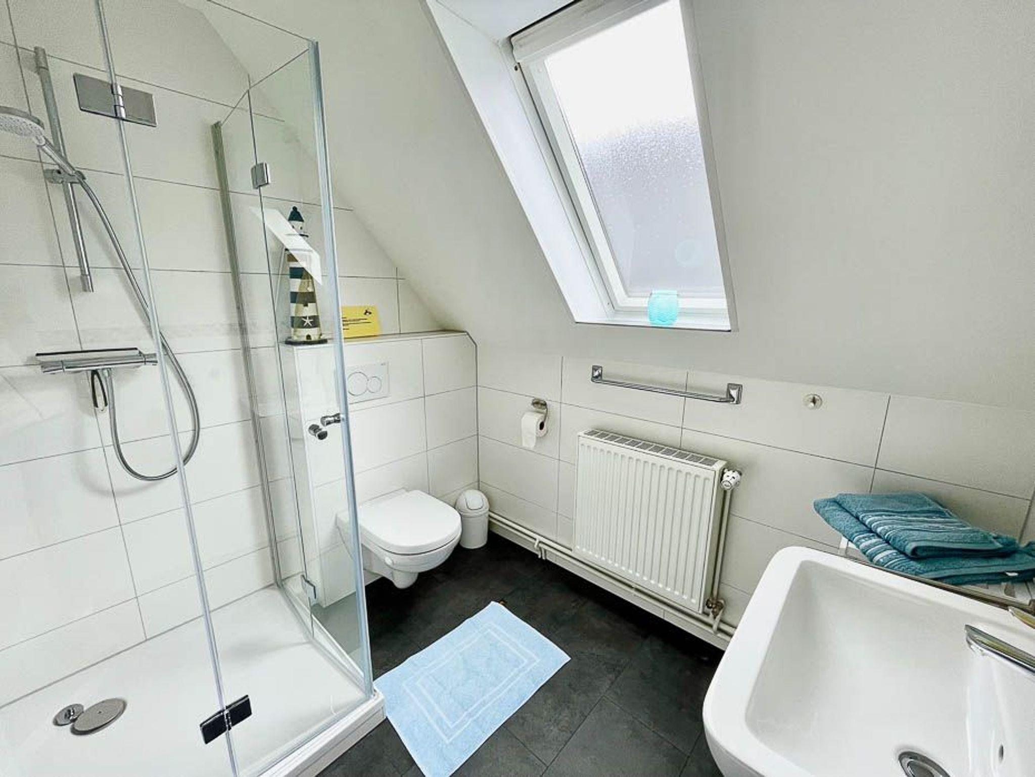 Badezimmer mit Dusche, Waschtisch und WC