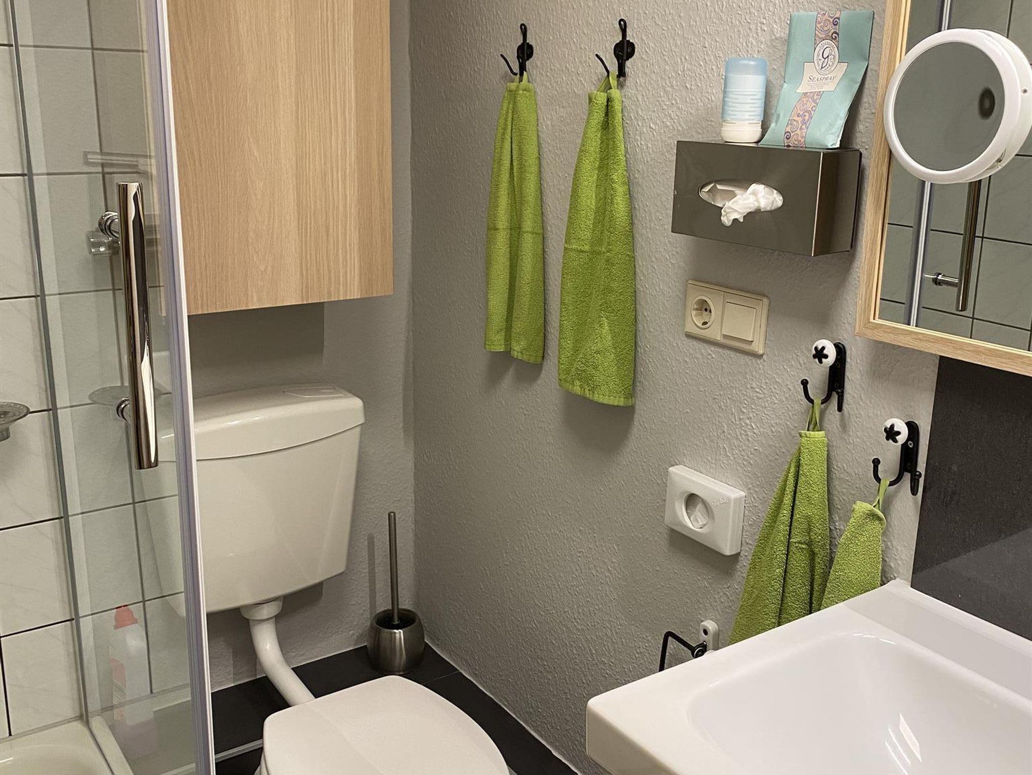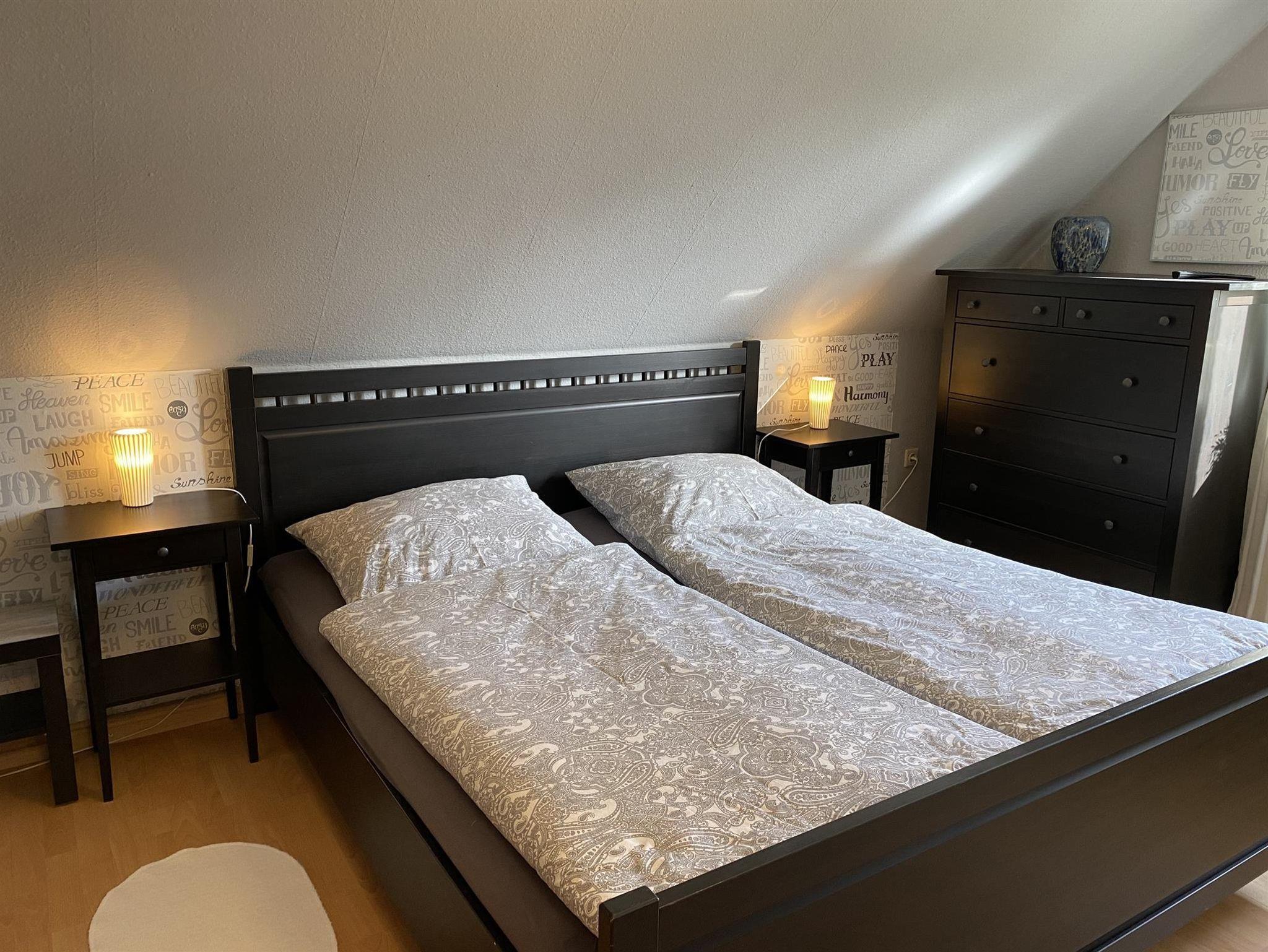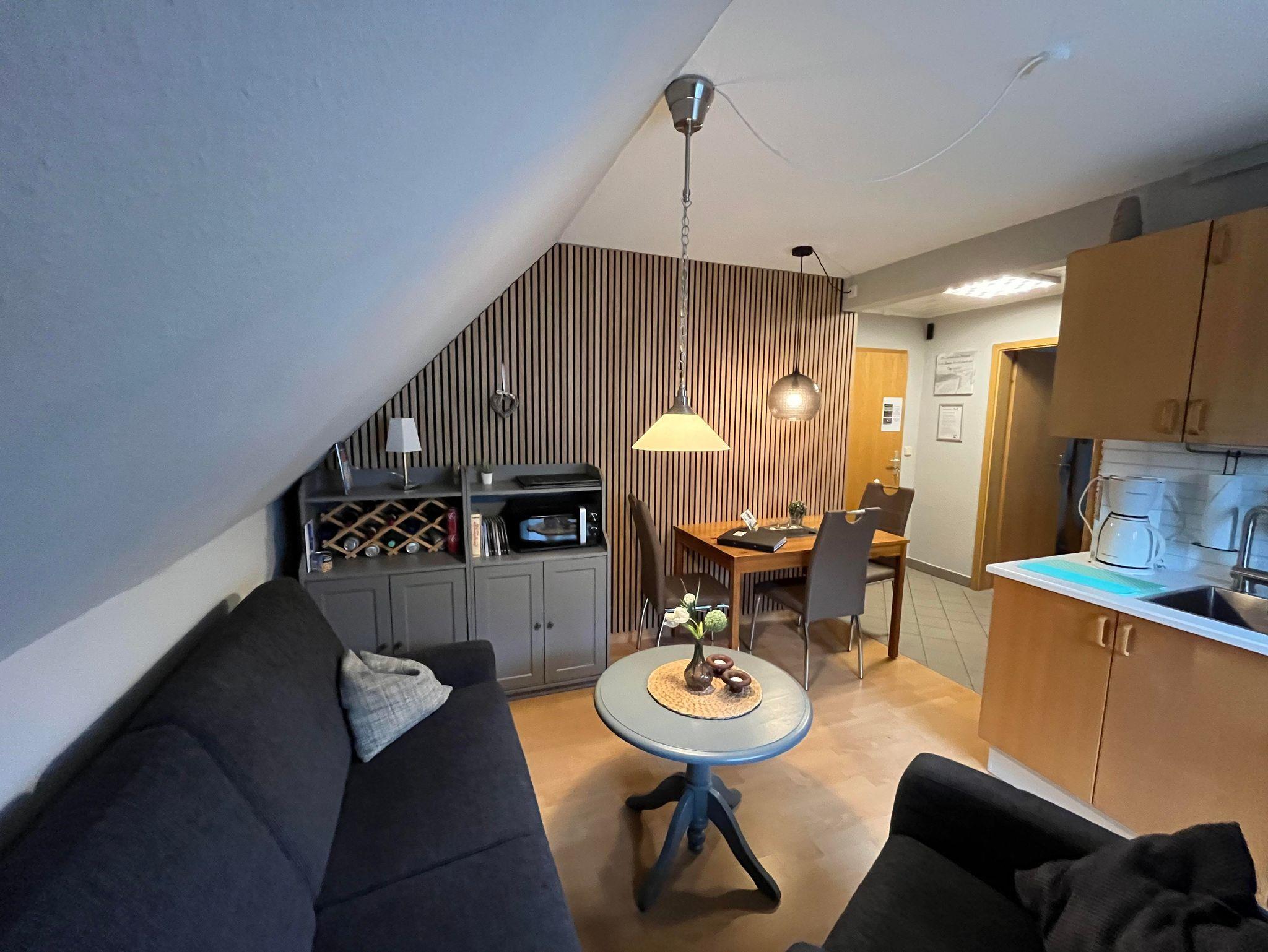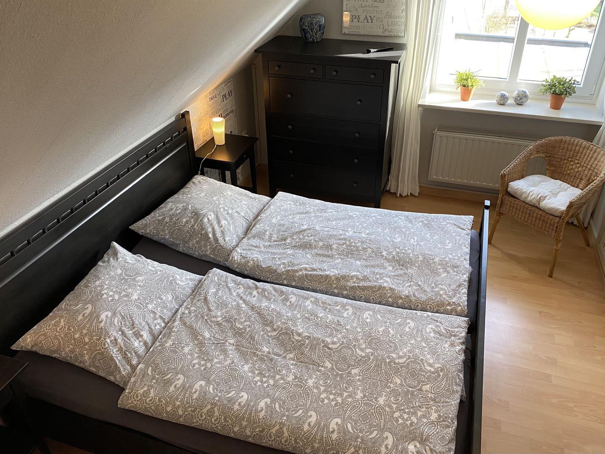 Die kleine Ferienwohnung liegt im Obergeschoß und bietet Platz für 2-4 Personen. Die Wohnküche ist komplett ausgestattet mit Herd (3 Platten), Backofen, Geschirrspüler, Mikrowelle, Kühlschrank, Kaffeemaschine und Wasserkocher. Das eine Schlafzimmer ist mit einem Doppelbett 1,80 x 2,00m ausgestattet. Über eine steile Treppe im Schlafzimmer erreicht man den oberen abgetrennten Schlafraum mit einem weiteren Doppelbett 1,40 x 2,00m. Es ist ein kleines Duschbad vorhanden. Wohnküche sowie beide Schlafräume verfügen über ein LED Farbfernsehgerät. Im Vorgarten befindet sich (nur für diese Wohnung,) eine kleine Terrasse mit einem Strandkorb und Gartenmöbeln.