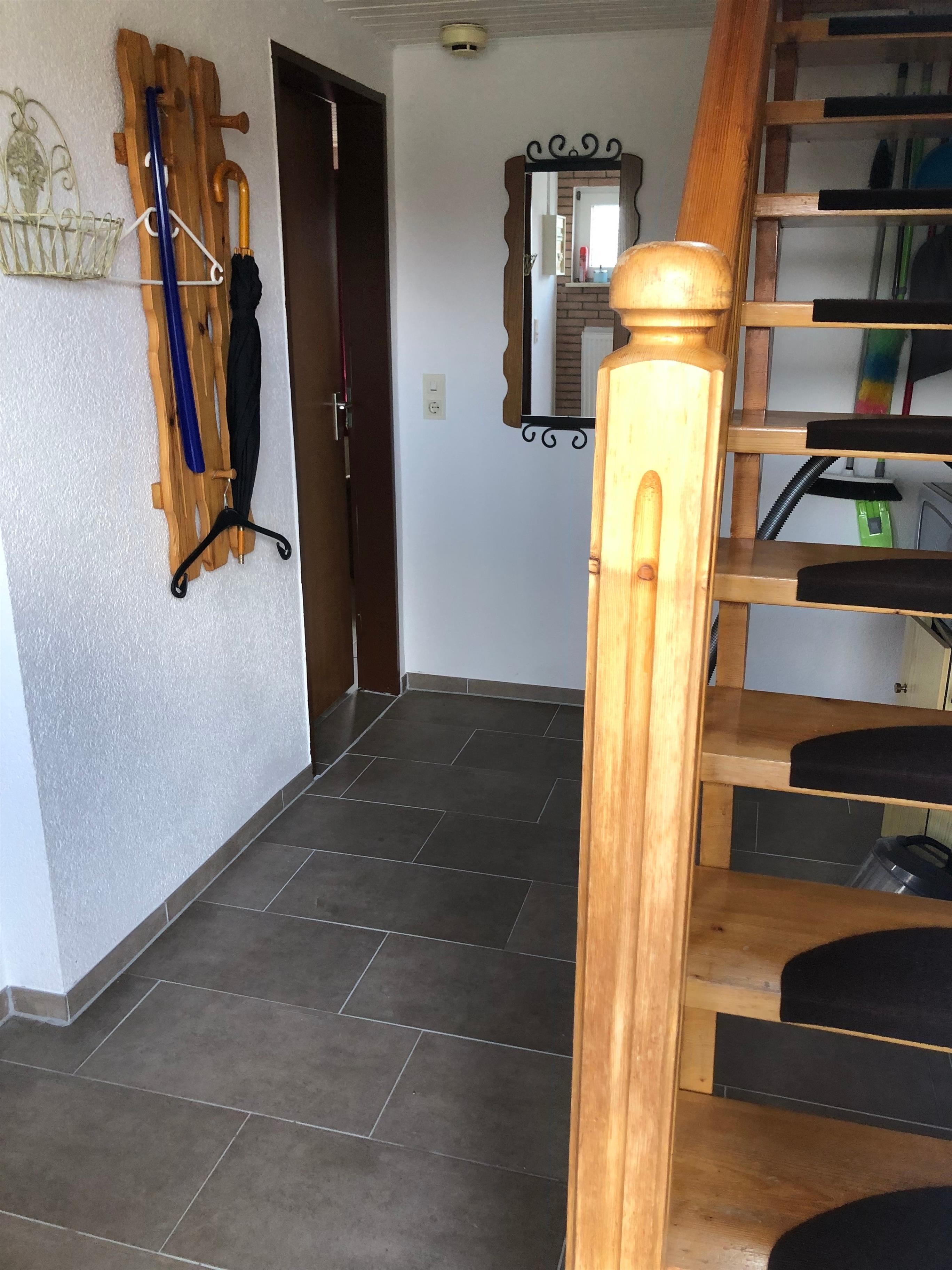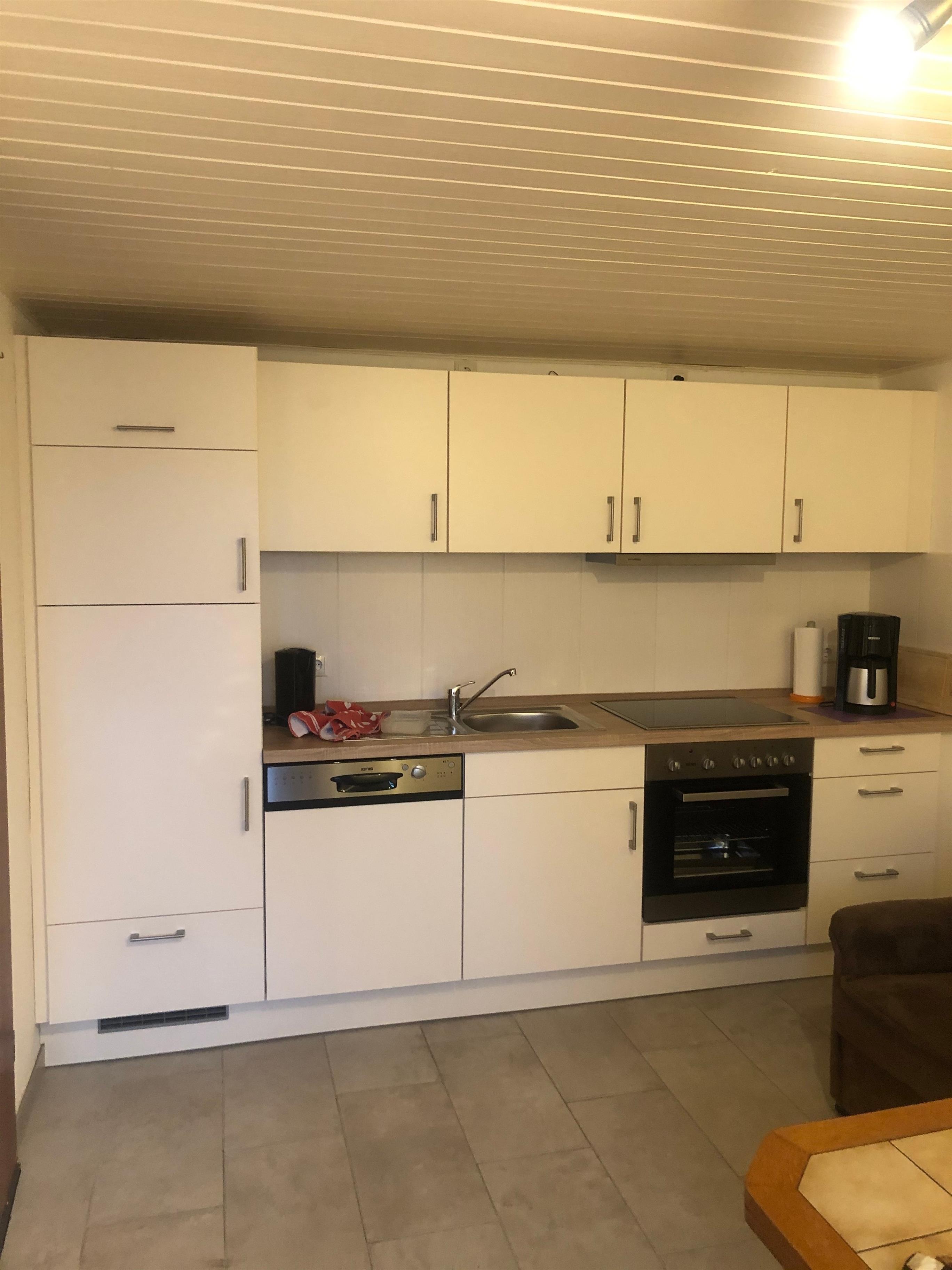 Im Erdgeschoß ist eine gut ausgestattete Wohnküche mit Spülmaschine und kleinem Gefrierschrank. Ein Fernseher sowie