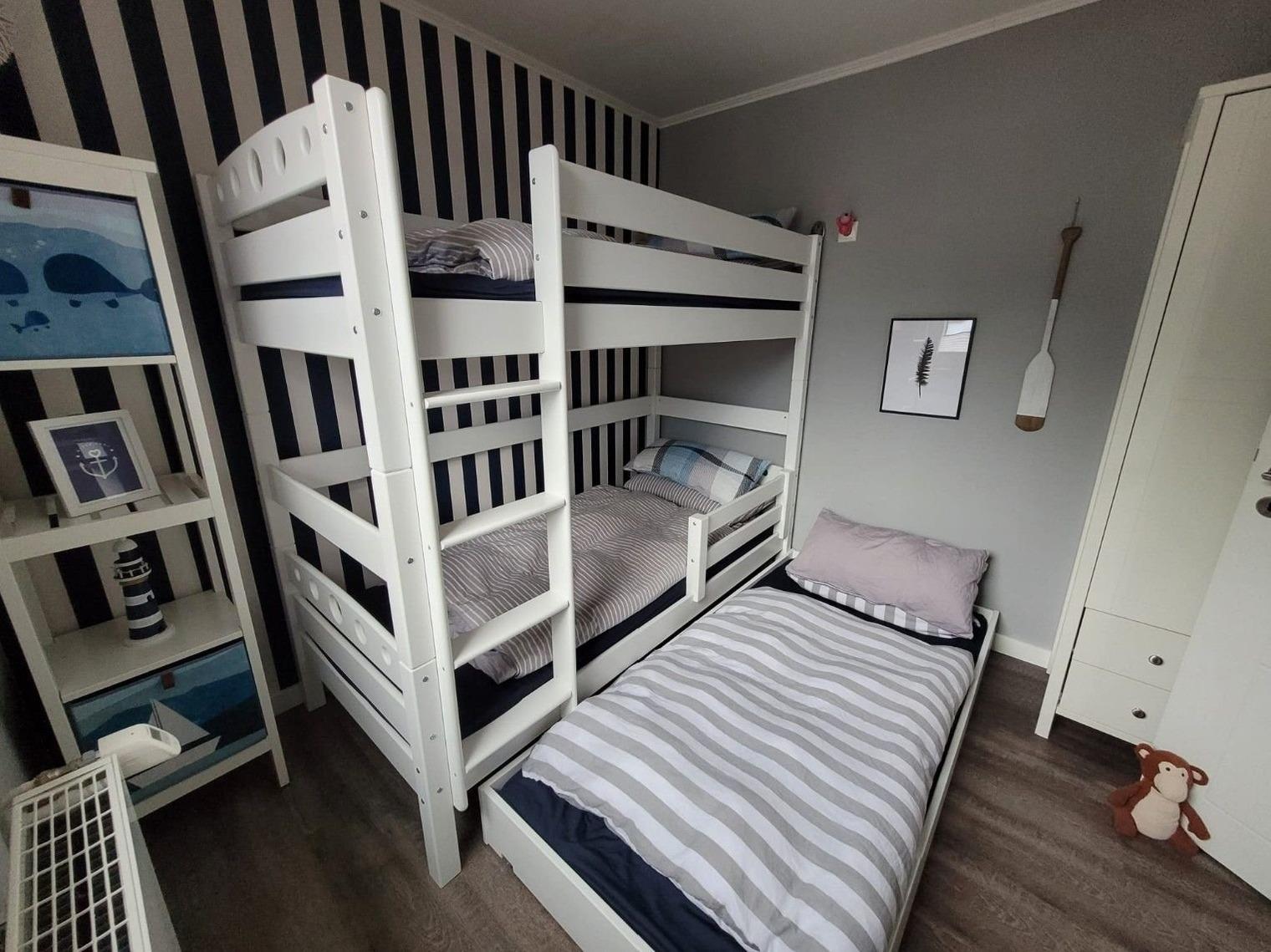 Das Schlafzimmer mit Doppelbett sorgt für erholsame Nächte, während das liebevoll gestaltete Kinderzimmer mit Etagenbett und zusätzlichem Einzelbett besonders bei den kleinen Gästen beliebt ist.