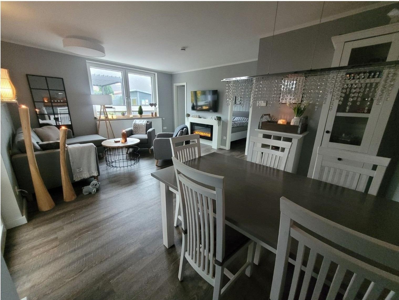 Im offenen Wohn- und Essbereich mit großem Esstisch, gemütlicher Couchlandschaft, Smart-TV und stimmungsvollem Elektrokamin können Sie entspannen und den Tag ausklingen lassen.