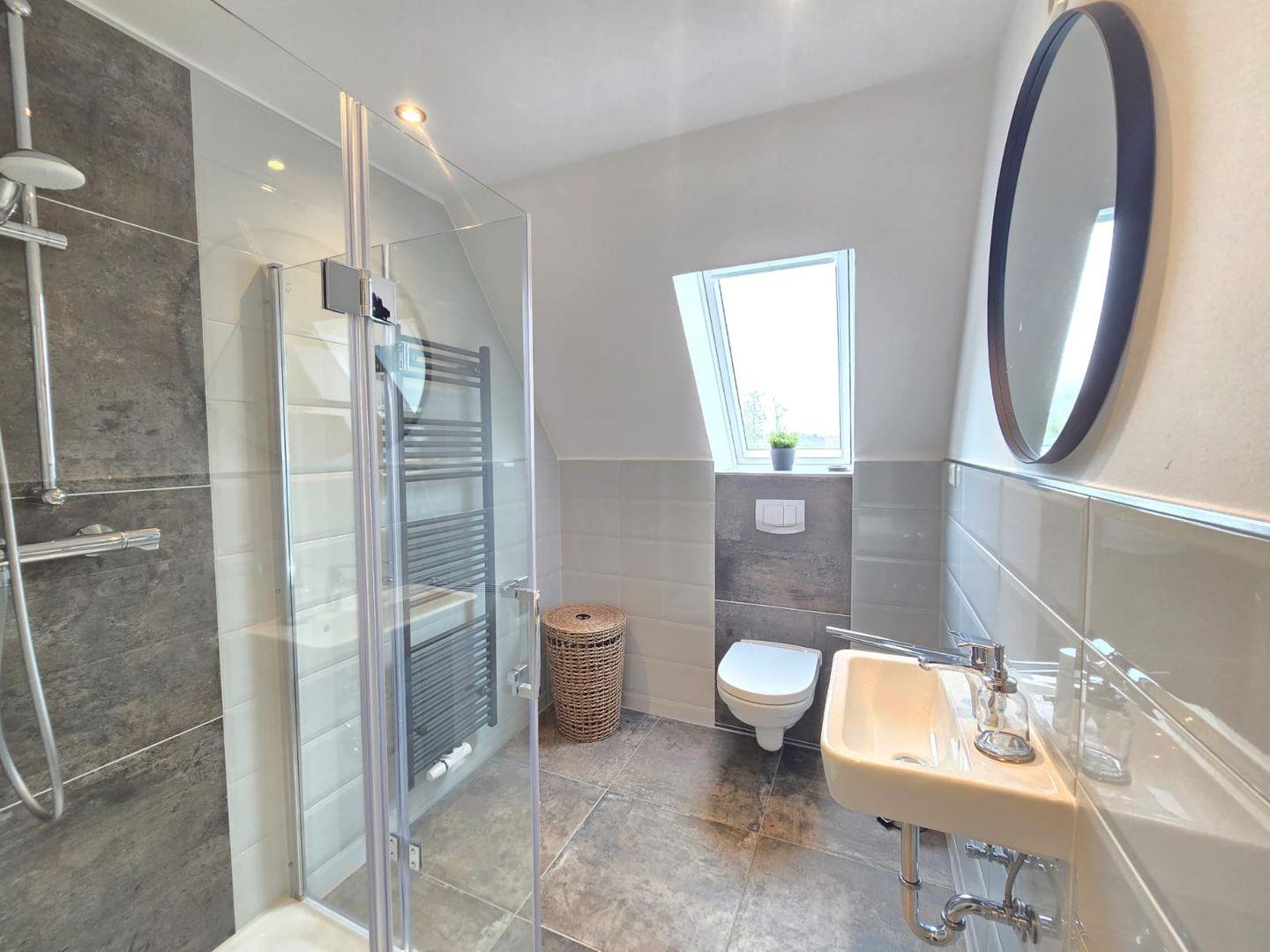 Das moderne Badezimmer überzeugt mit einer großzügigen Regendusche, Eckbadewanne, Waschbecken und WC. Das zweite Badezimmer ist ebenfalls mit einer Dusche ausgestattet, was besonders für Familien oder befreundete Paare praktisch ist. Nach einem erlebnisreichen Tag können Sie es sich im Wohnzimmer gemütlich machen und bei einem Film entspannen.
