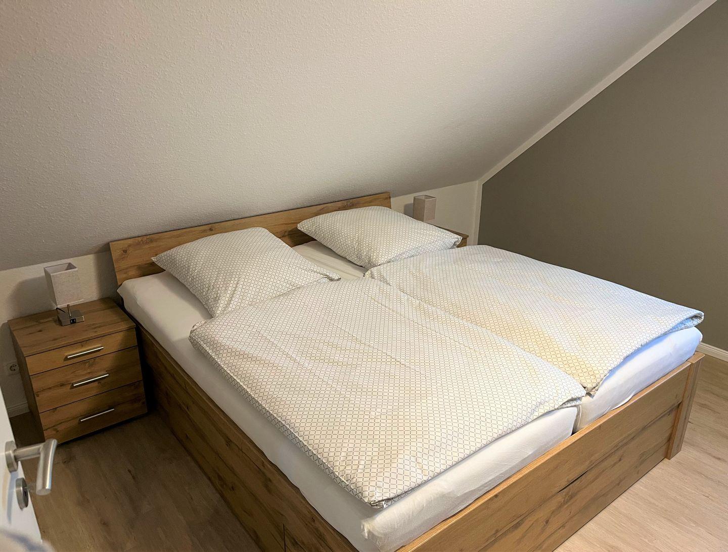 Das separate Schlafzimmer hat einen Kleiderschrank sowie einem Komfortbett in der Größe von 180 x 200 cm. Das Bad ist mit einem Spiegel, Fön, Waschtisch, Dusche und WC ausgestattet.