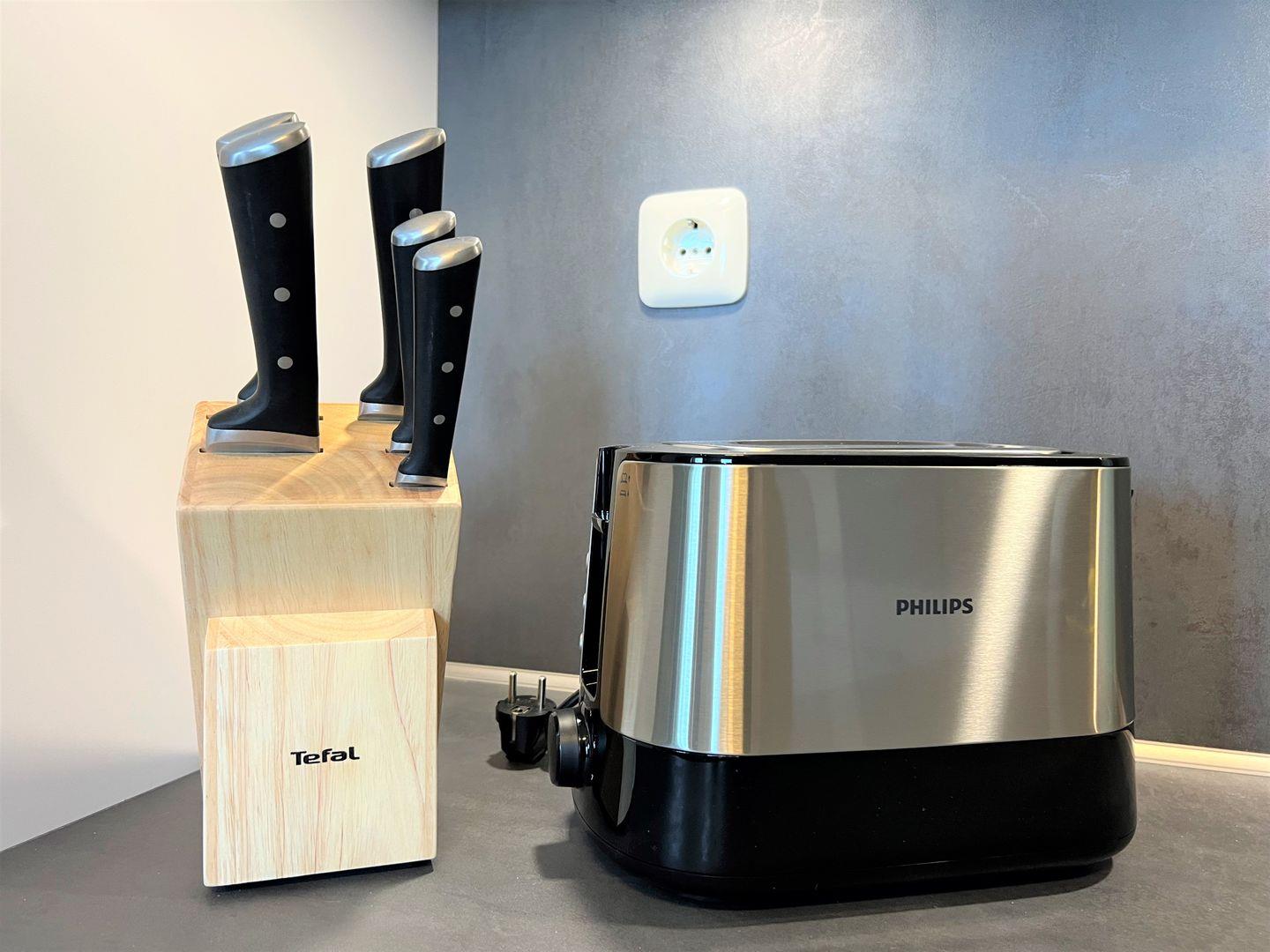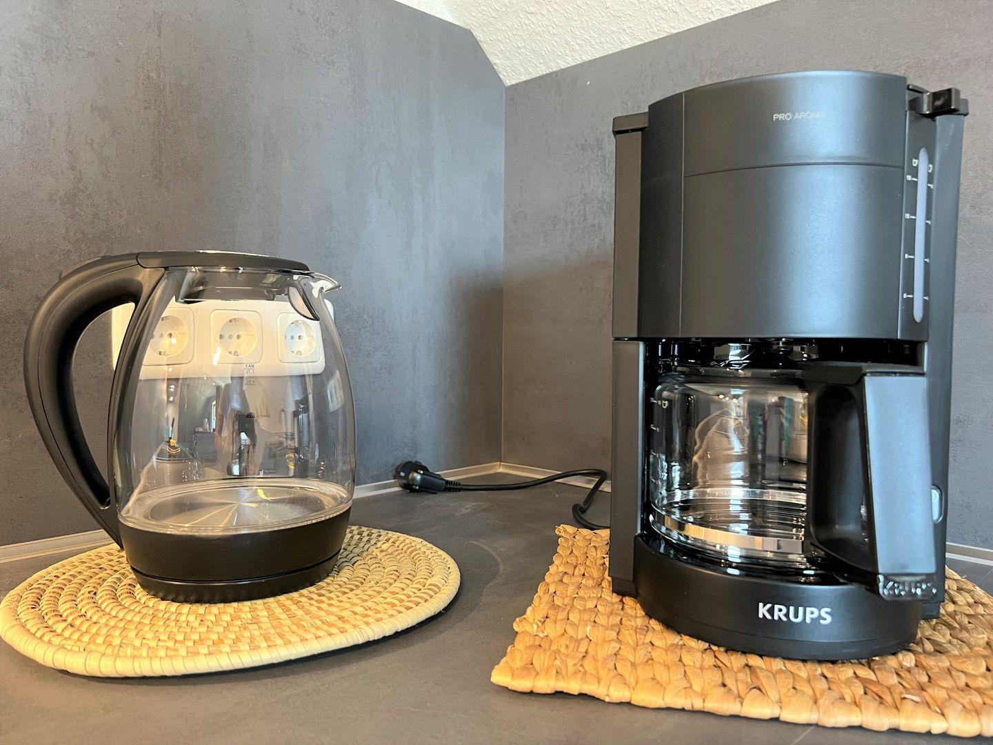 Die Küche enthält ein 4-Platten Ceranfeld, Kühlschrank mit Gefrierfach, Mikrowelle, Wasserkocher, Kaffeemaschine, Toaster sowie ausreichend Geschirr, Gläser und Besteck.