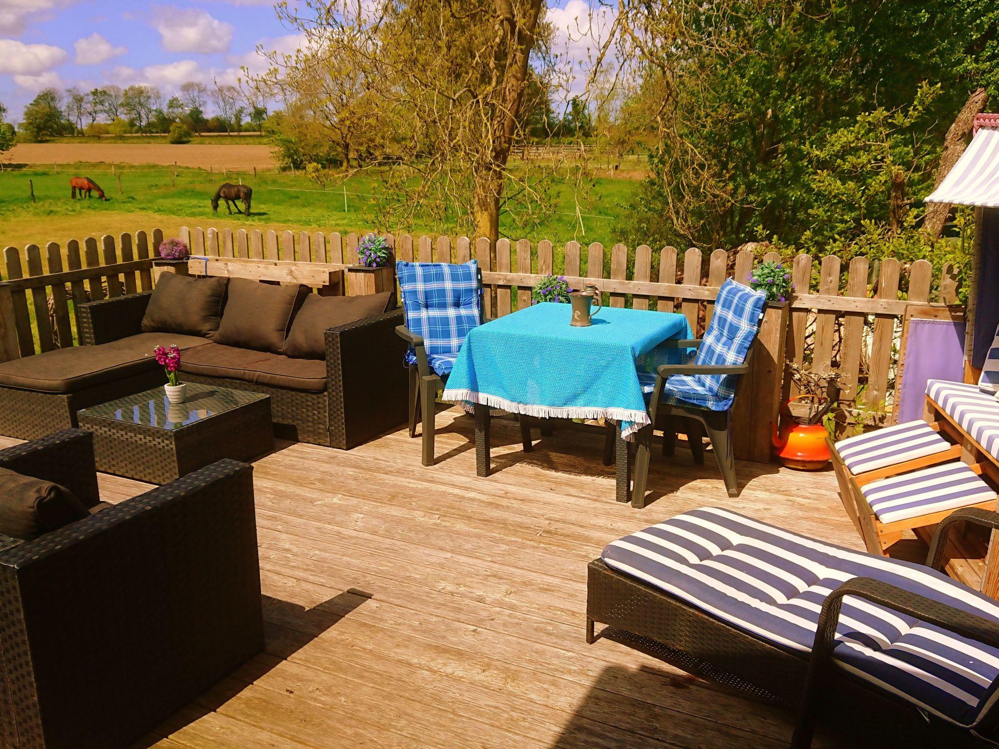 Die 24 m² große Dachterrasse ist mit Gartenmöbeln ausgestattet und bietet Ihnen einen schönen Blick auf Felder und Wiesen.