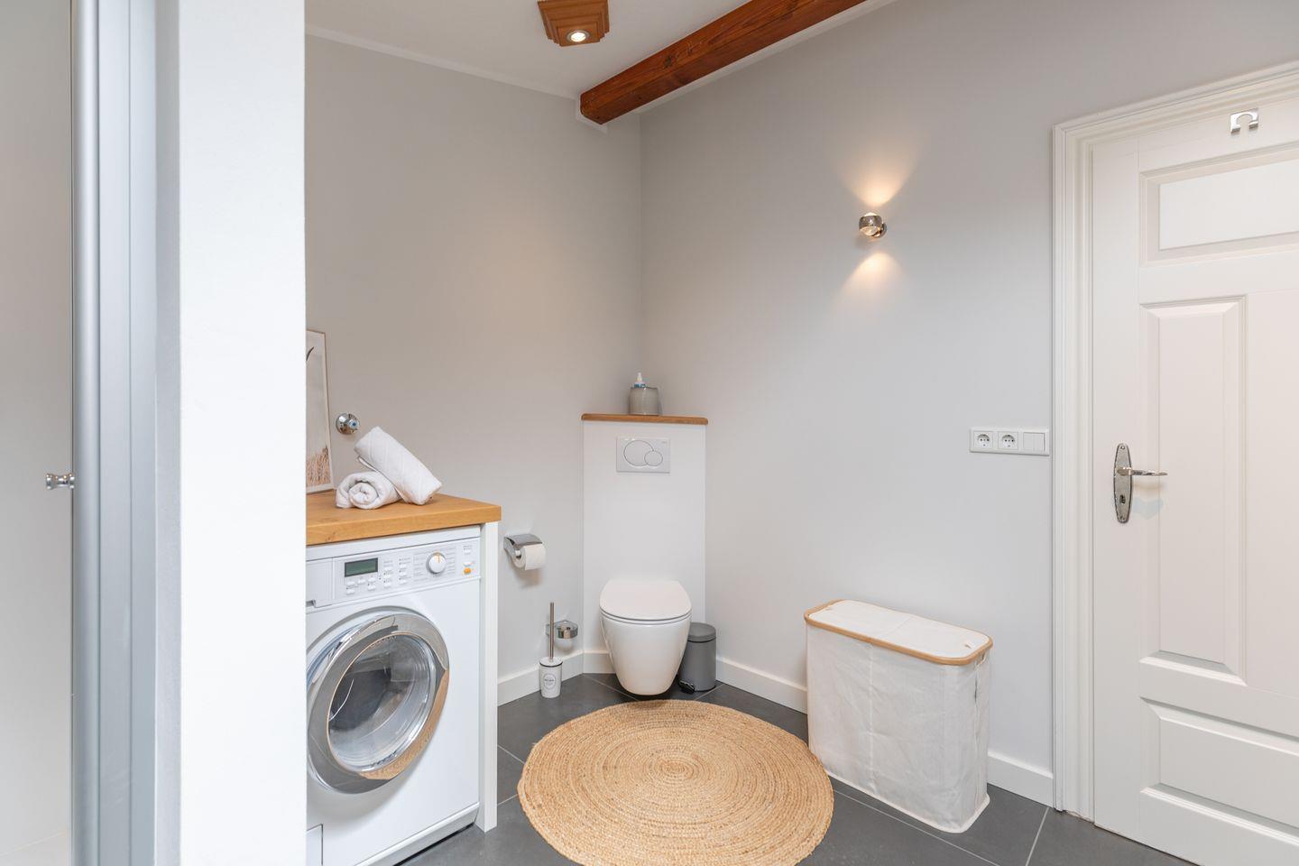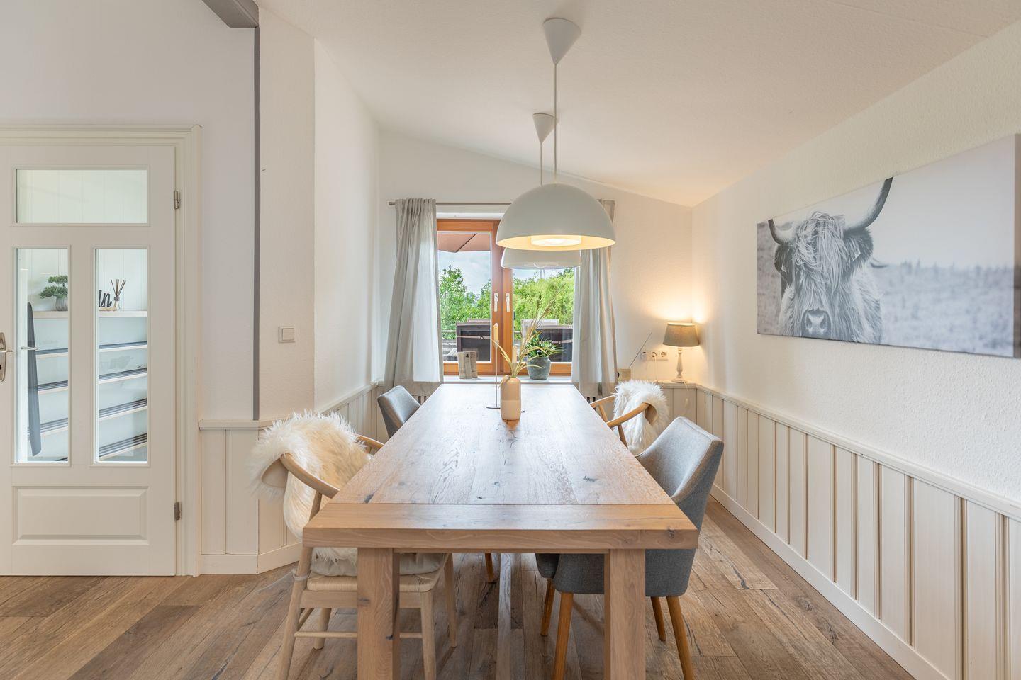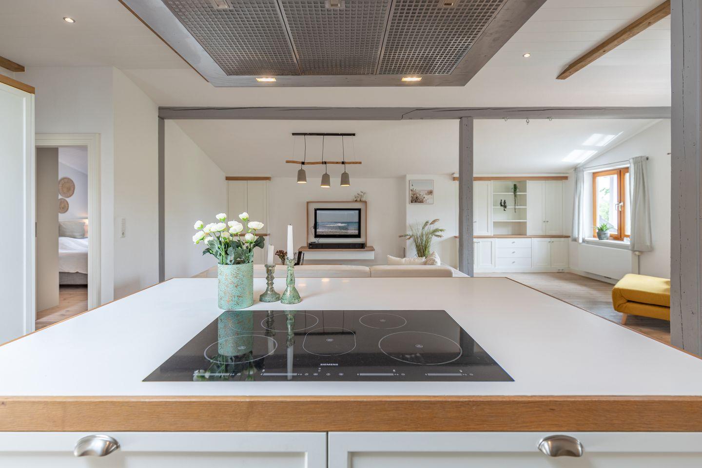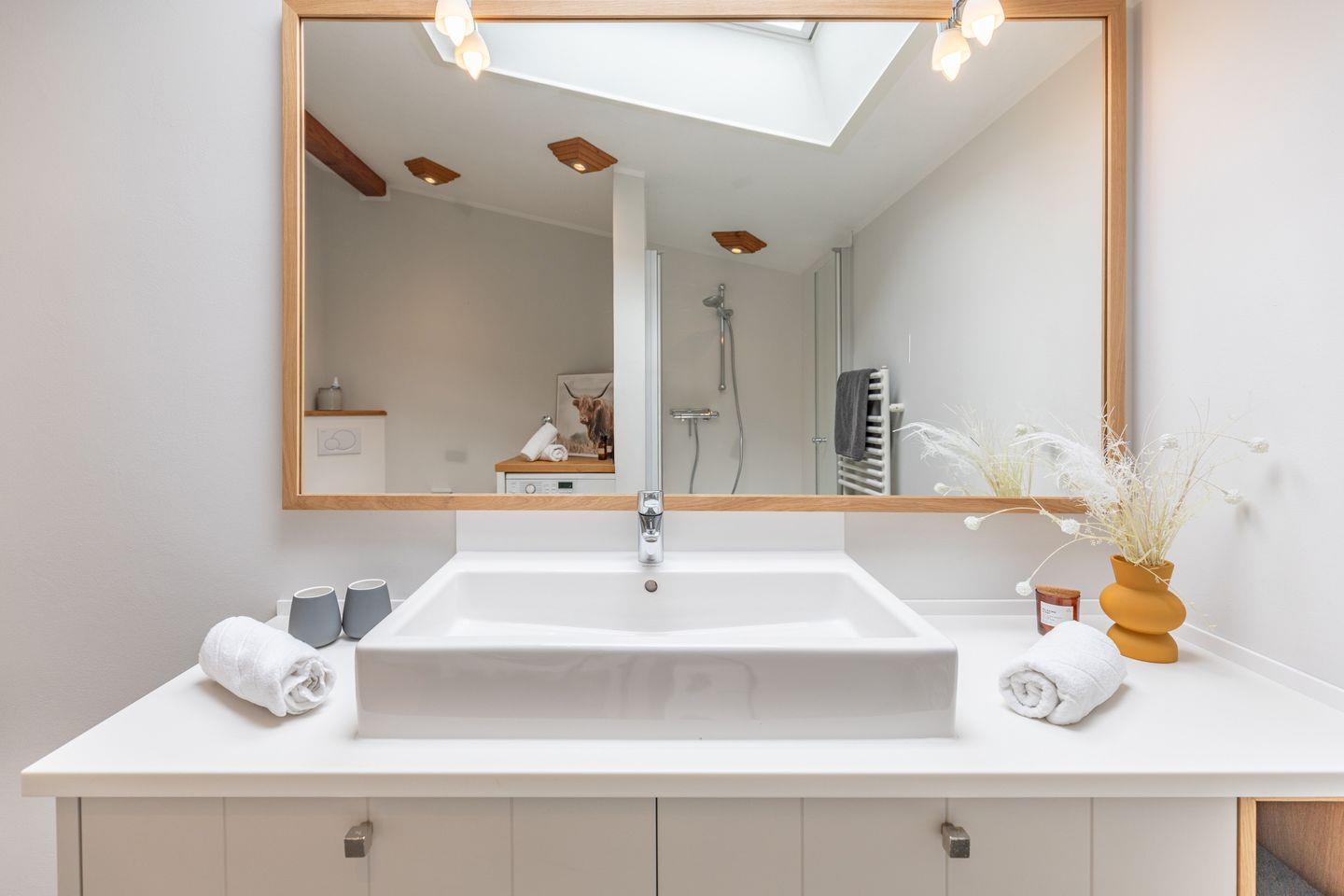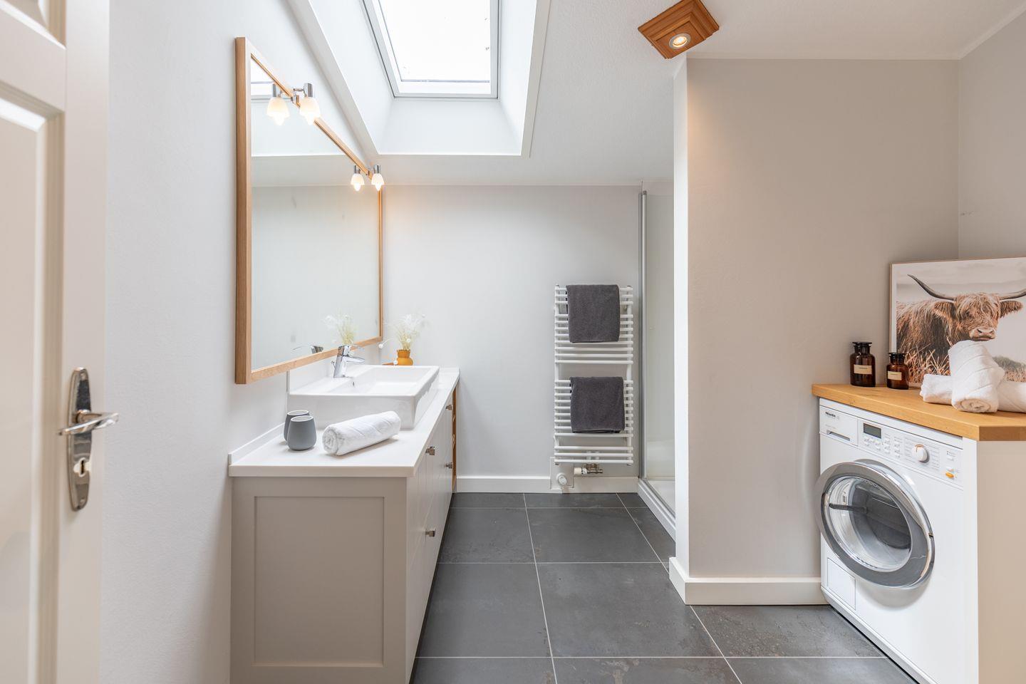 Für Selbstversorger ist die Küche hochwertig und umfassend eingerichtet: Induktionsherd, Backofen, Mikrowelle, Geschirrspüler, Kühlschrank mit Gefrierfach, Kaffeemaschine, Espressomaschine, Wasserkocher, Toaster, Mixer sowie zahlreiche Küchenutensilien und Gewürze sorgen für Wohnkomfort auf hohem Niveau. Ein Kinderhochstuhl steht bereit, sodass auch Familien mit kleinen Kindern bestens umsorgt sind. Das Badezimmer ist mit Dusche, WC, Waschbecken, Haartrockner, und Spiegel ausgestattet. Des Weiteren stehen Waschmaschine, Trockner und Wäscheständer zur Verfügung.