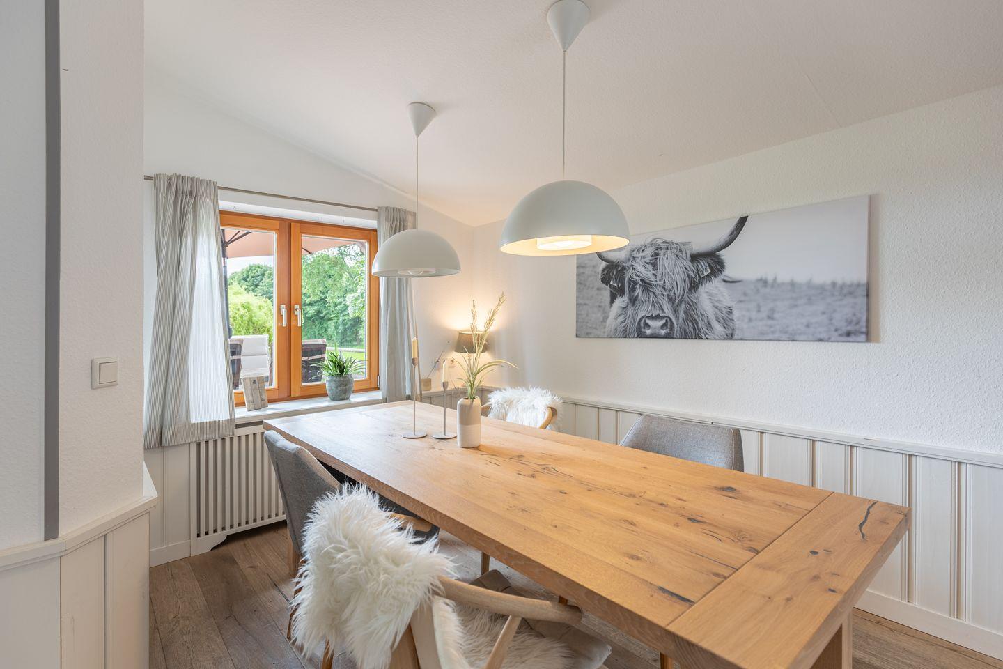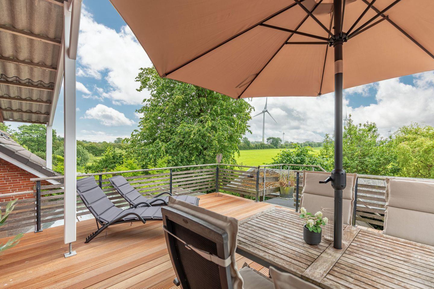 Für entspannte Stunden im Freien lädt ein überdachter Balkon mit Sonnenliegen, Gartenmöbeln und Sonnenschirm zum Verweilen ein. Ein Gasgrill steht für Grillabende bereit. Die ländliche Umgebung eignet sich hervorragend zum Spazierengehen, Radfahren oder einfach zum Genießen der Ruhe. Der hauseigene Privatparkplatz mit Carport bietet einen -sicheren Abstellplatz für Ihr Fahrzeug. E-Bikes können im Schuppen sicher untergestellt und draußen im Raum (links von der Treppe) sicher aufgeladen werden.