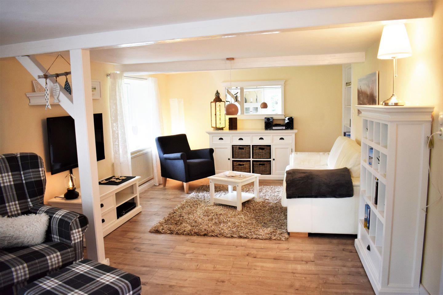 Das liebevoll eingerichtete Ferienhaus verfügt über insgesamt zwei Schlafzimmer, die Platz für bis zu vier Personen & maximal einen Hund bietet. Hier finden Sie den perfekten Ort zur Erholung nach einem Tag voller Abenteuer. Das geräumige Wohnzimmer lädt zum Entspannen ein – ausgestattet mit einem komfortablen Sofa, gemütlichen Sesseln und einem Kaminofen, der besonders in den kühleren Monaten für wohlige Wärme sorgt. Genießen Sie entspannte Abende bei einem guten Buch oder einem Film auf dem Fernseher.