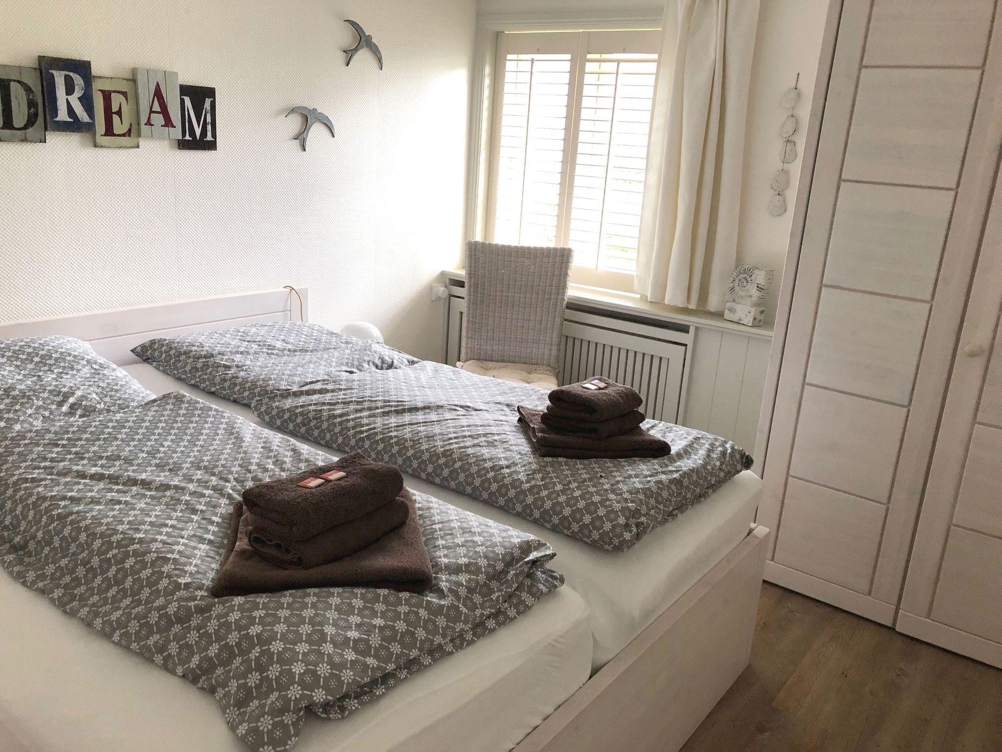 Im Wohnzimmer ist eine offene Küchenzeile integriert. Dort finden Sie u.a. einen Geschirrspüler, eine Mikrowelle, ein Backofen und einen Esstisch. Das separate Schlafzimmer verfügen über ein Doppelbett und das Duschbad ist modern ausgestattet. Im Garten befindet sich eine zur Wohnung dazu gehörige Terrasse samt Gartenmöbeln und Strandkorb. In der Straße „Neiwoi“ stehen viele Parkmöglichkeiten zur Verfügung, diese sind jedoch nicht der Wohnung zugewiesen.