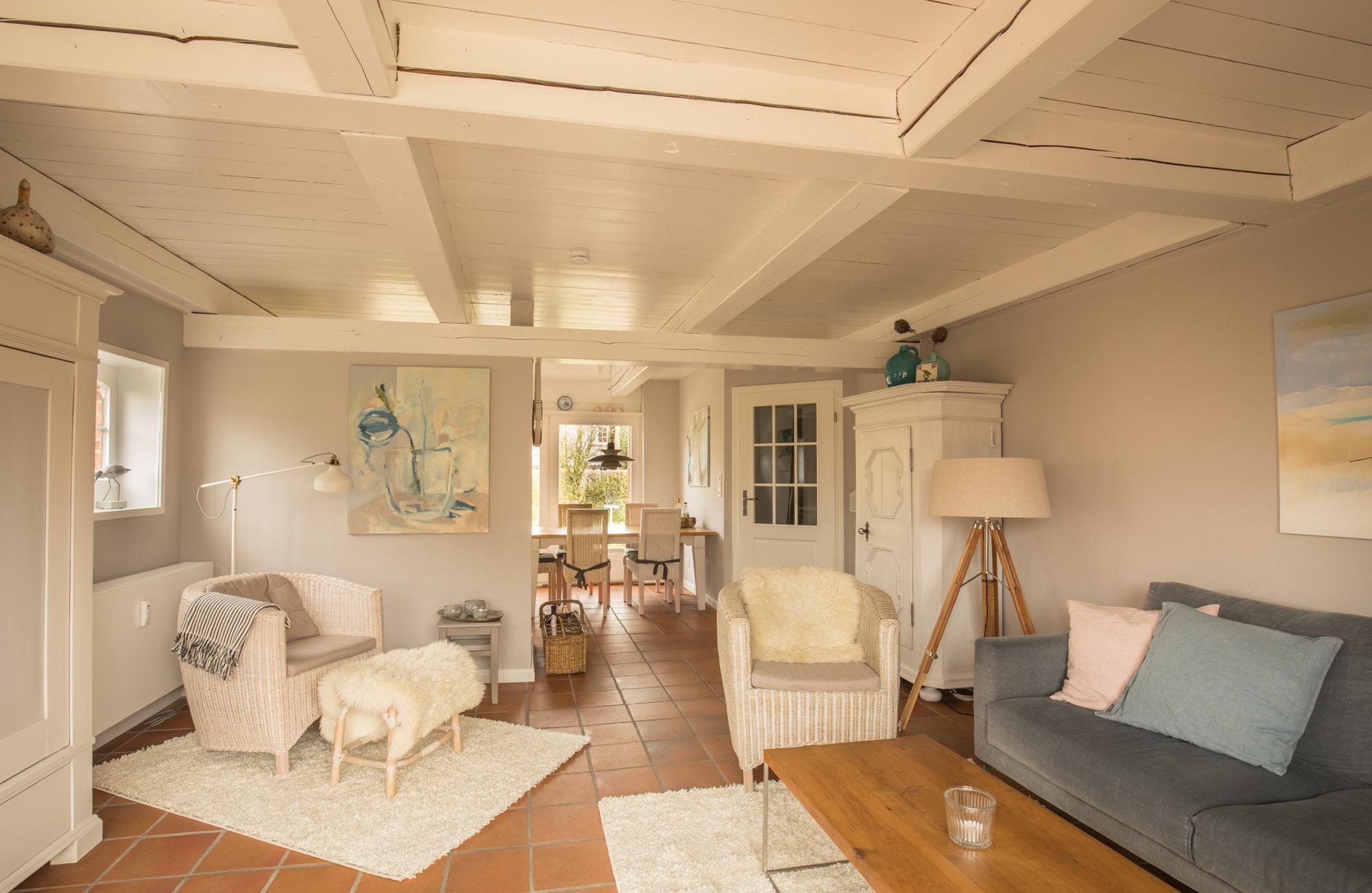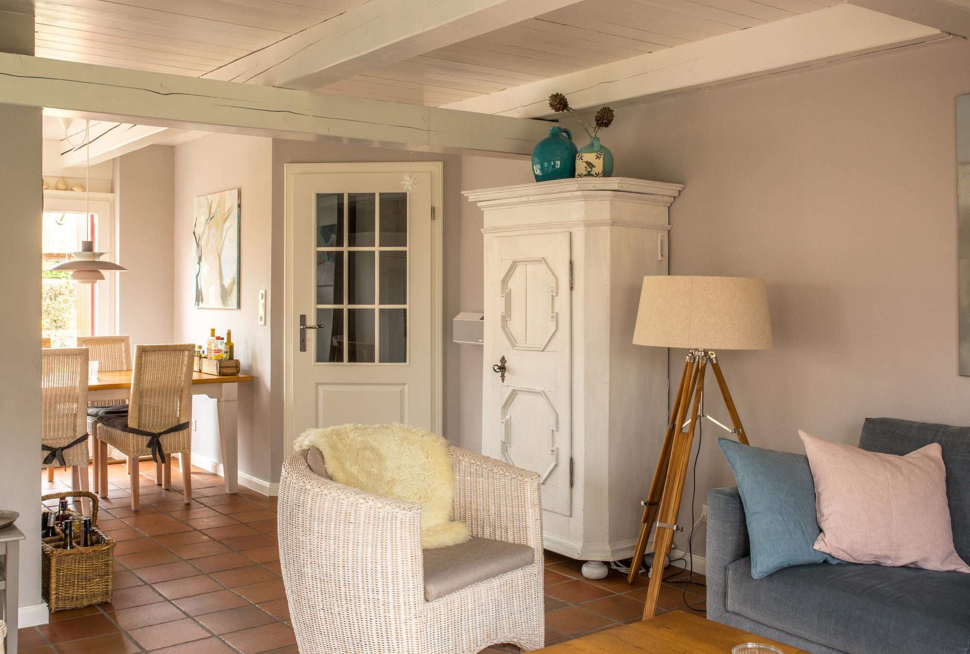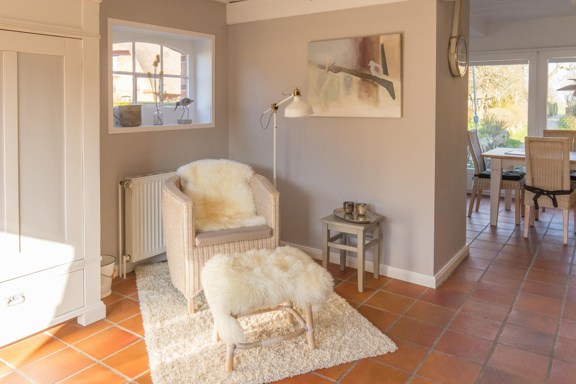 Willkommen im gepflegten Endhausteil "Foftein" in Borgsum auf Föhr. Im Nordwestgiebel des reetgedeckten Hauses mit mehreren Hausteilen erwartet Sie eine großzügige Unterkunft über zwei Etagen mit separatem Eingang und eigenem PKW-Stellplatz.