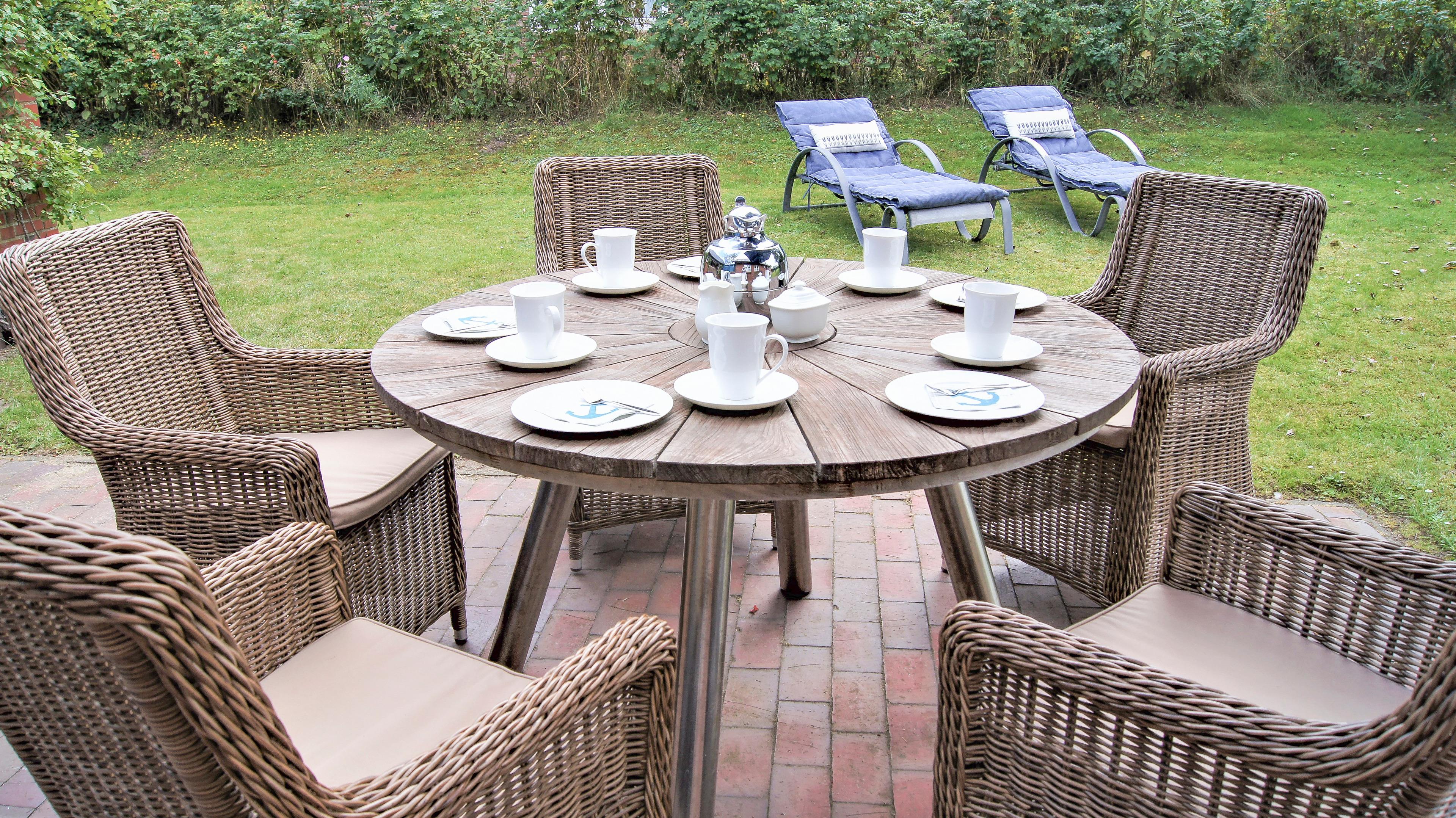 Der lichtdurchflutete Wohnbereich im Erdgeschoss bietet eine gemütliche Sitzgarnitur und einen Flachbildschirm-TV für entspannte Abende. Der Kamin sorgt an kühlen Tagen für behagliche Wärme. Die offene, voll ausgestattete Küche mit großem Esstisch lädt zum gemeinsamen Kochen und Verweilen ein. Vom Wohnbereich gelangen Sie direkt in den Garten, wo Sie im Strandkorb (während der Sommersaison) oder auf der Terrasse entspannen können.