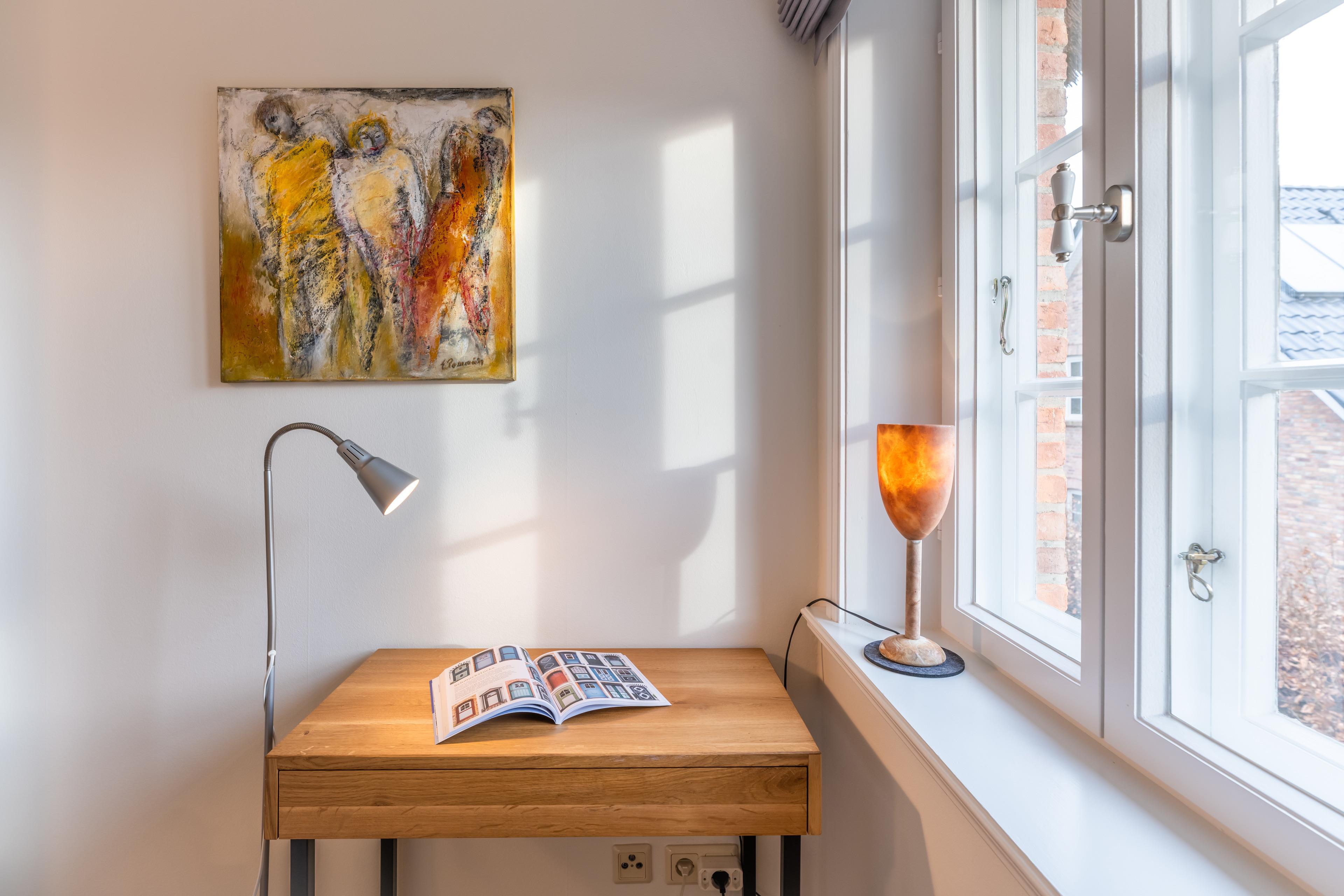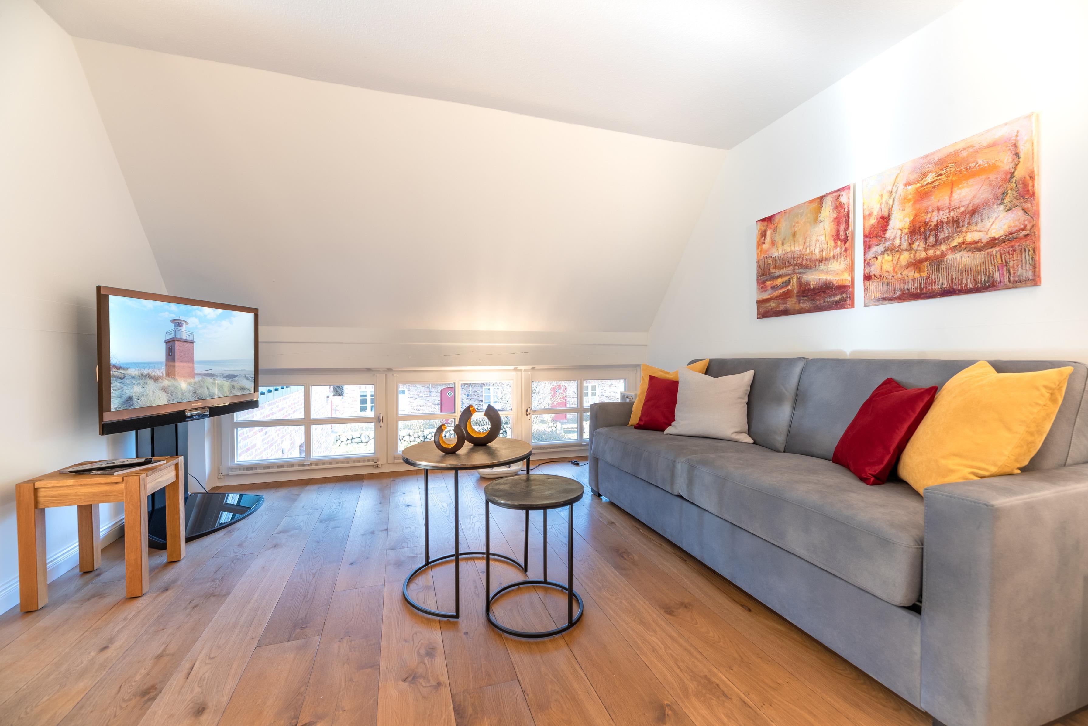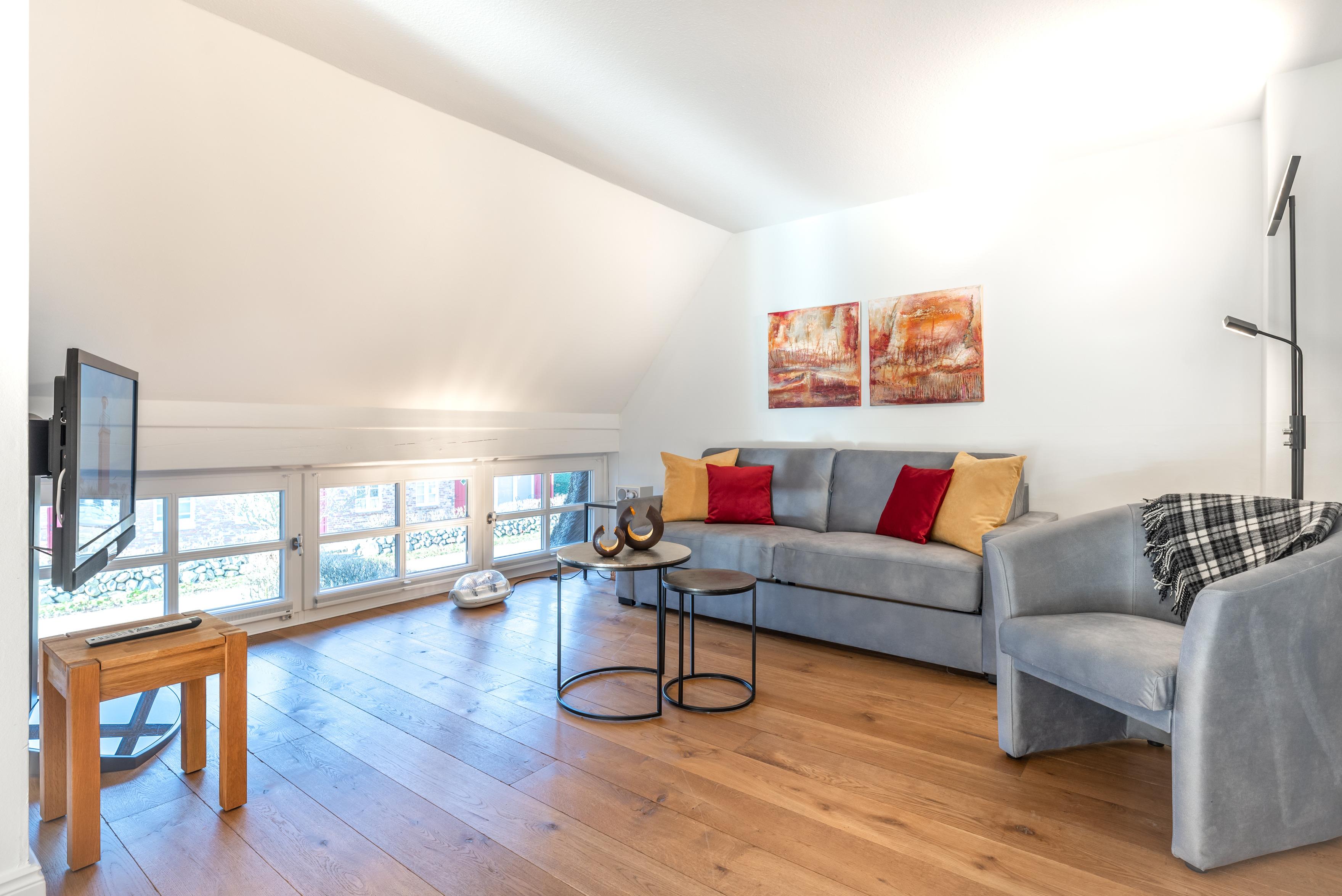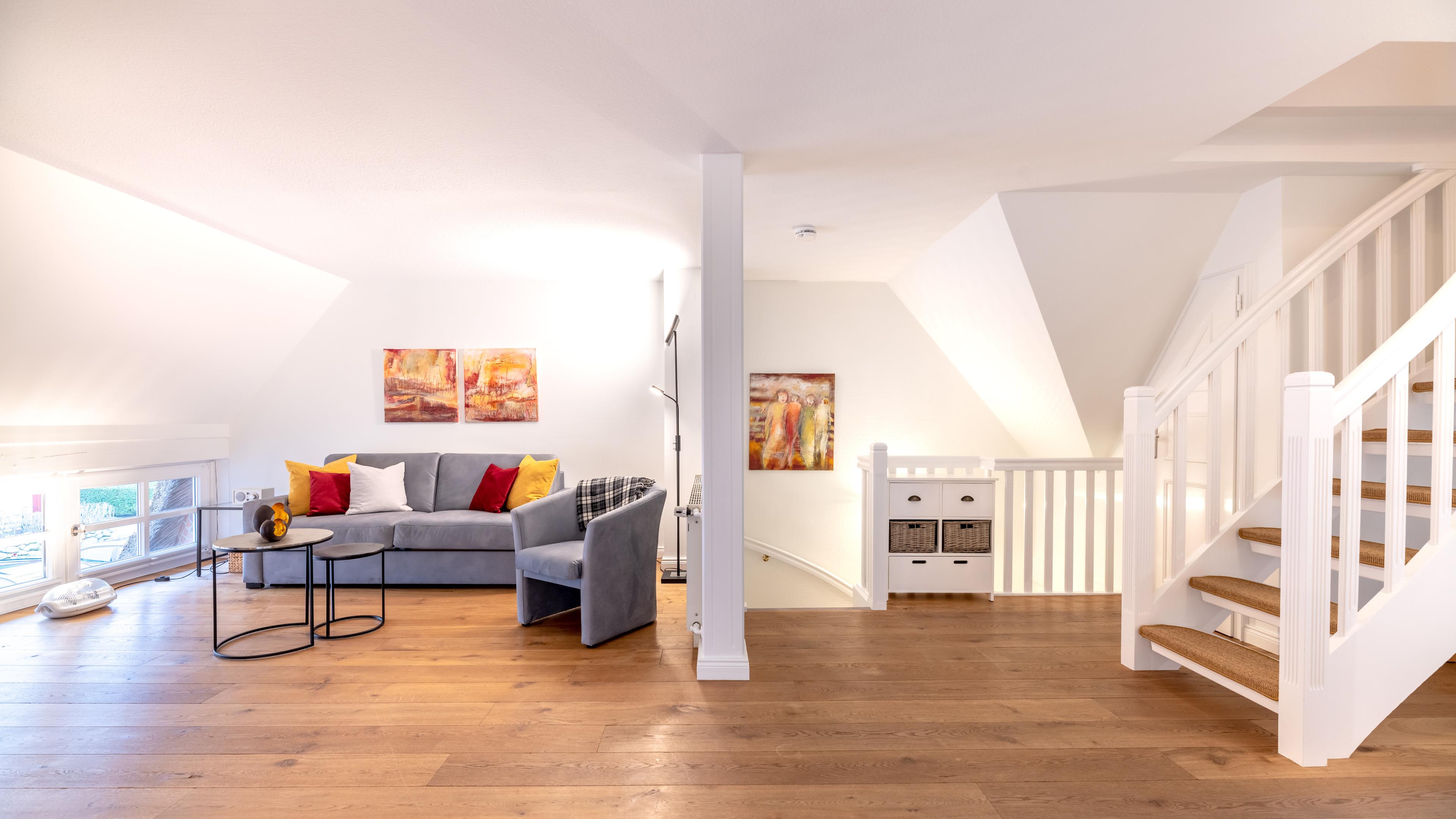 Über eine Treppe gelangt man in den, als offene Galerie gestalteten, wohnlich ausgebauten Spitzboden. Ein Rückzugsort zum Arbeiten am Schreibtisch mit weitem Blick über die Marsch Richtung Nieblum oder schlicht zum Ausruhen.